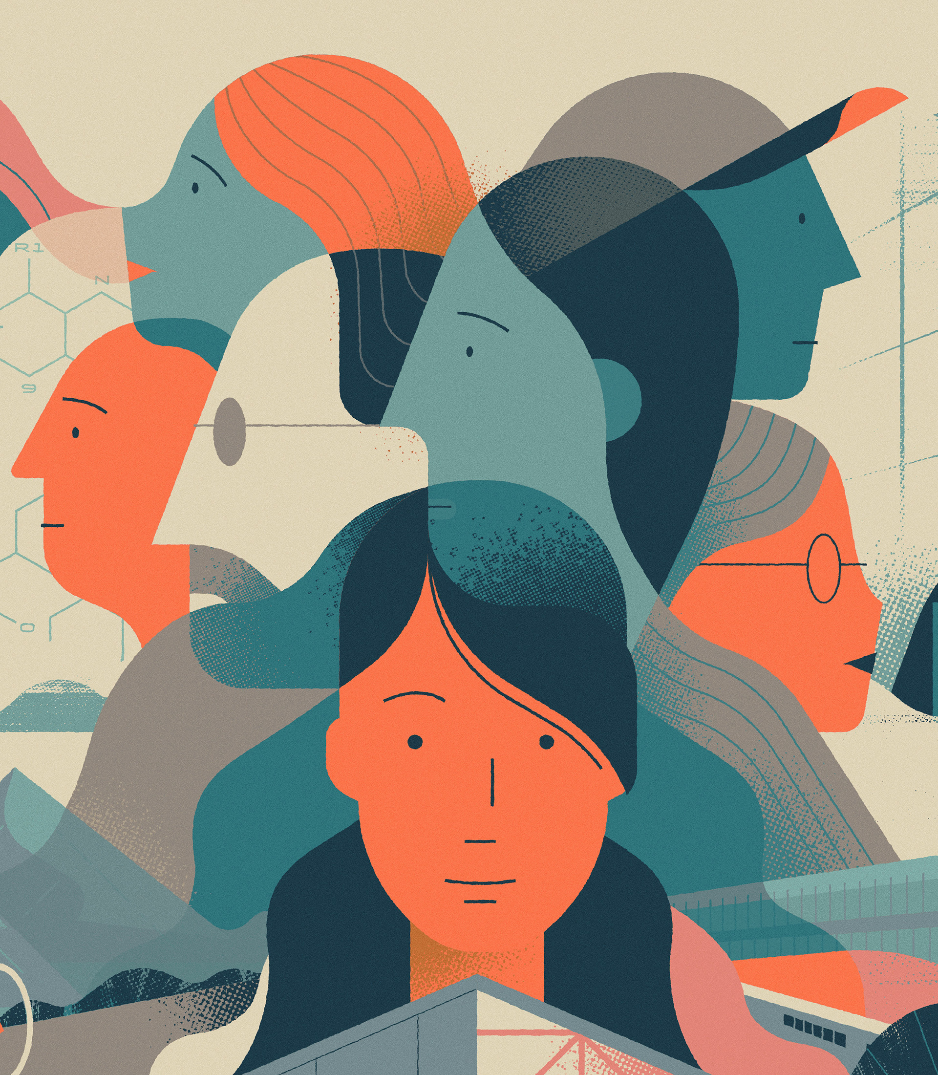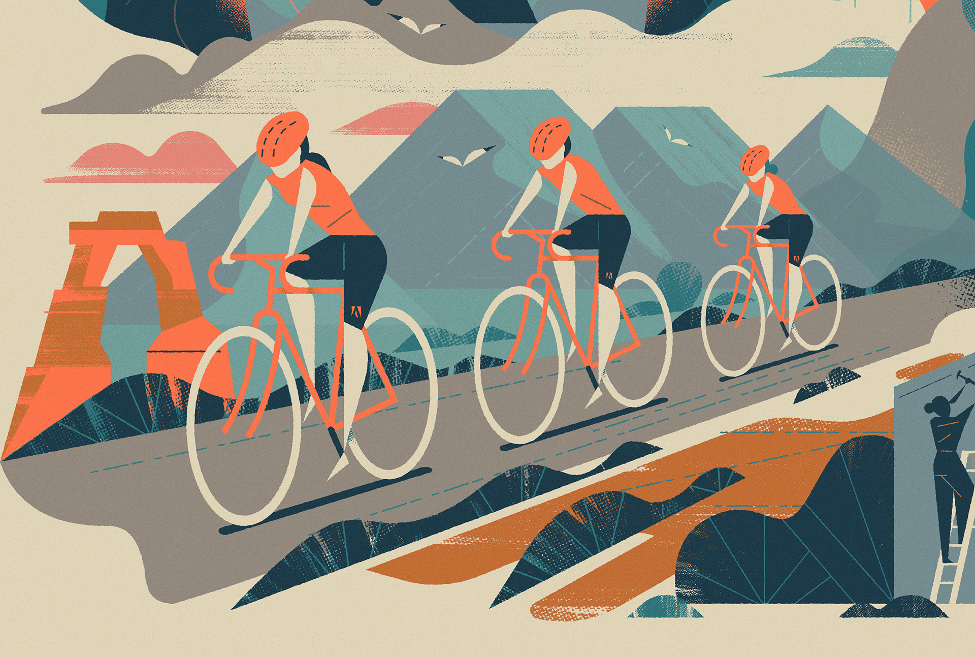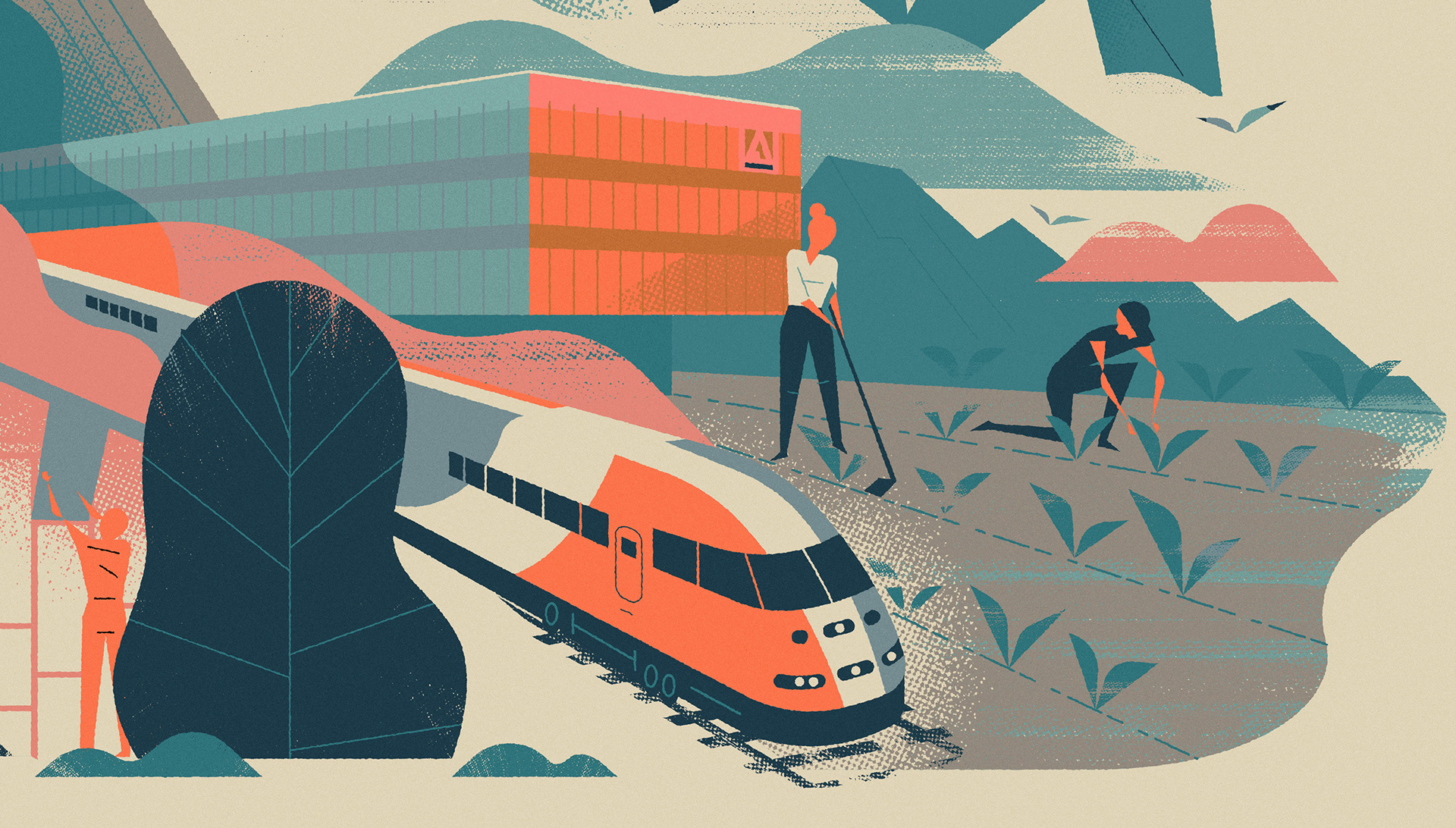 In August of 2018, I was approached by Adobe here in Utah to do an illustration representing their core values, which includes being involved in the community, the need for well-being, diversity & inclusion, etc. I needed to create a single illustration with elements representing each of these core values. Being from Utah, it was fun to include little snippets of our great state in the composition.