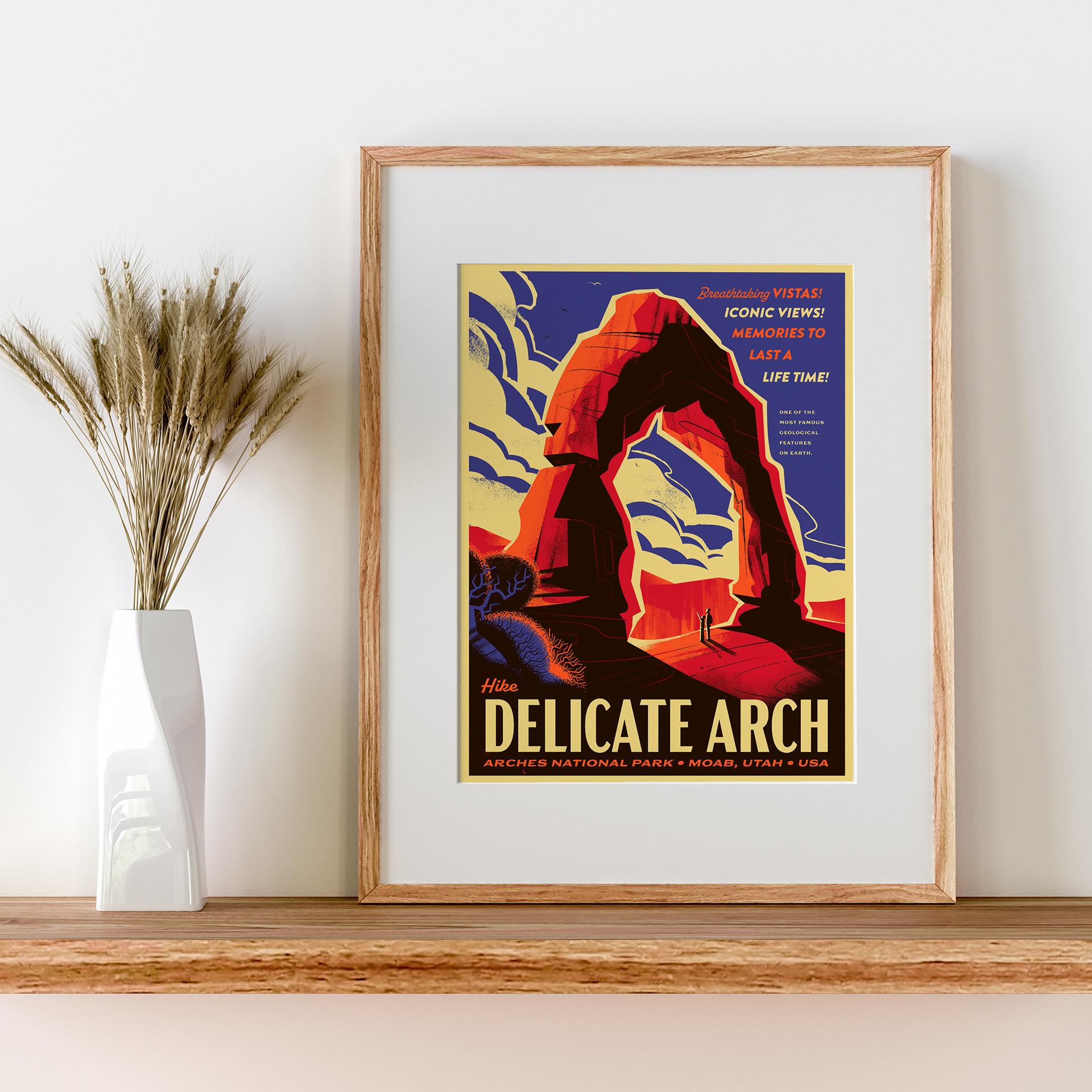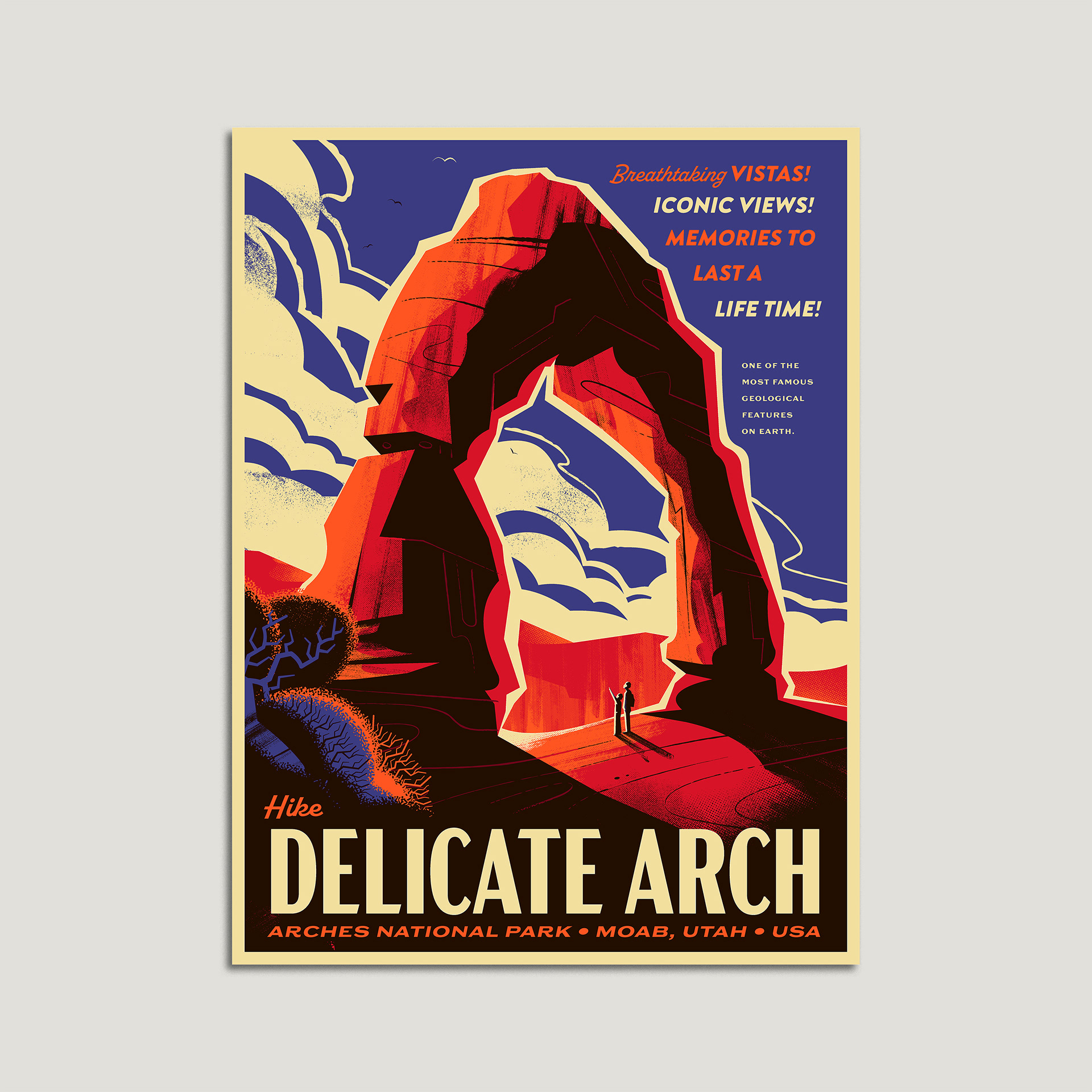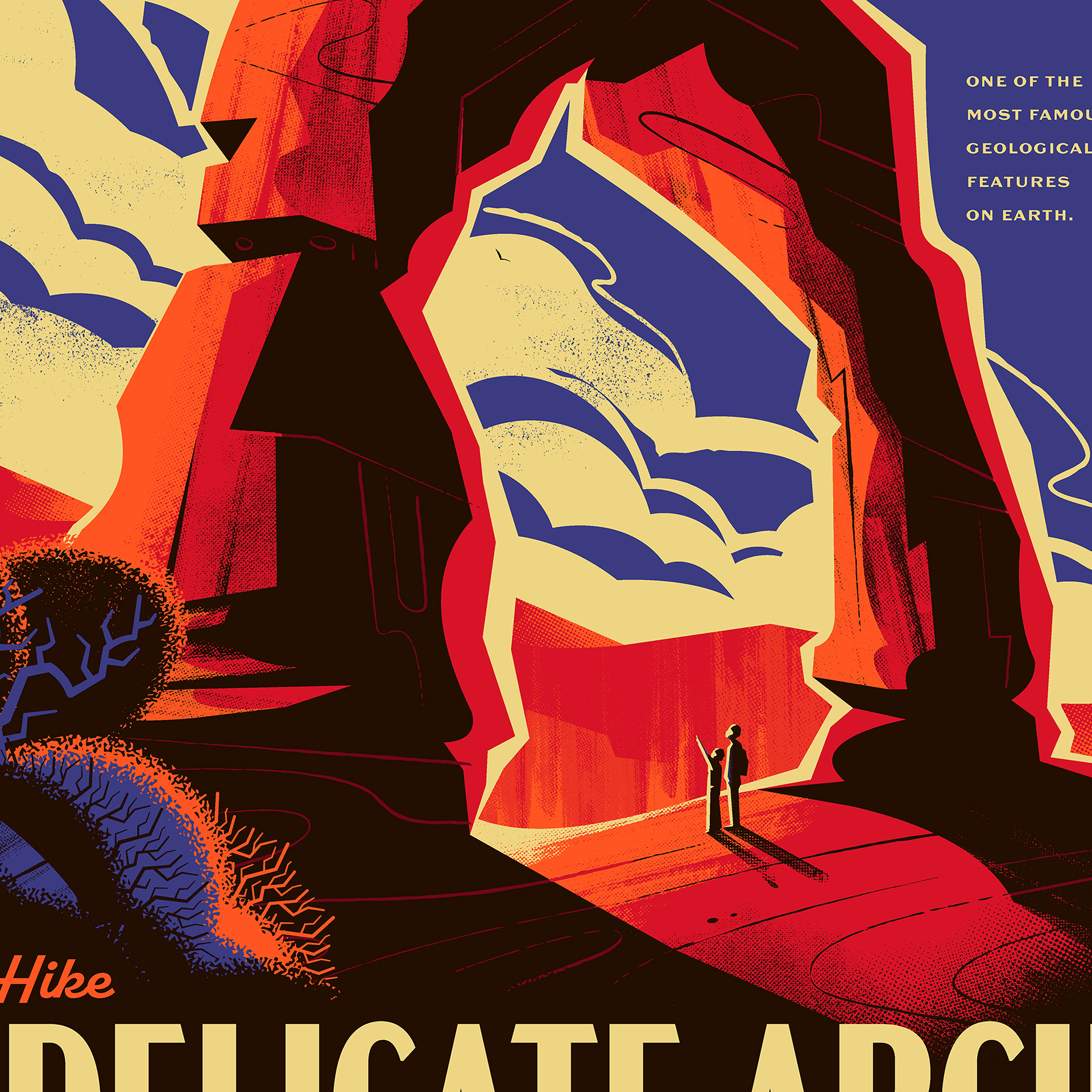 For this one, I wanted a not-so-traditional view of the arch, which is usually depicted straight-on, from a distance. However, as a visitor, my favorite view of the arch is from beneath, seeing the arch majestically and almost unbelievably soaring above my head. This illustration attempts to capture that.