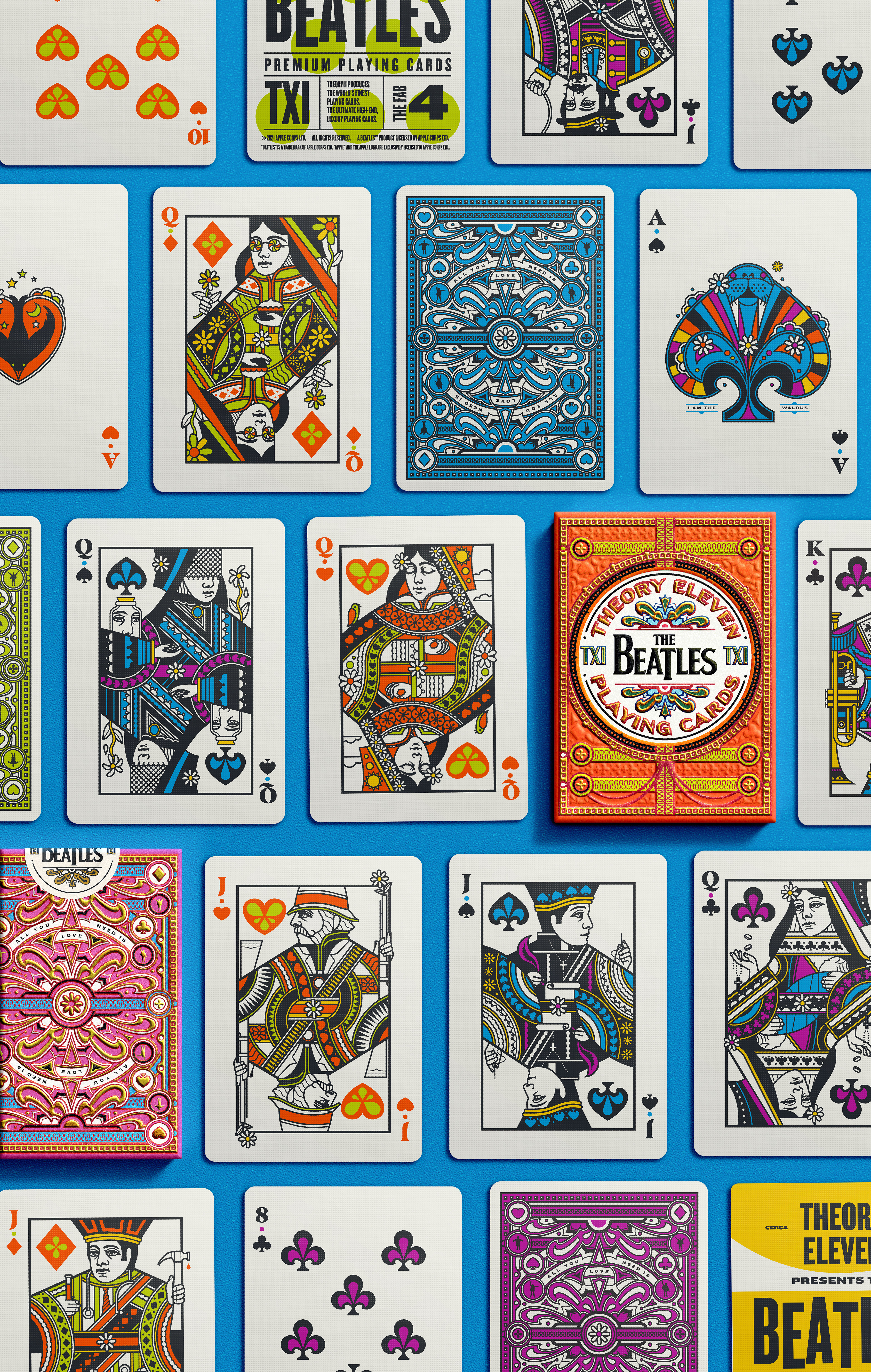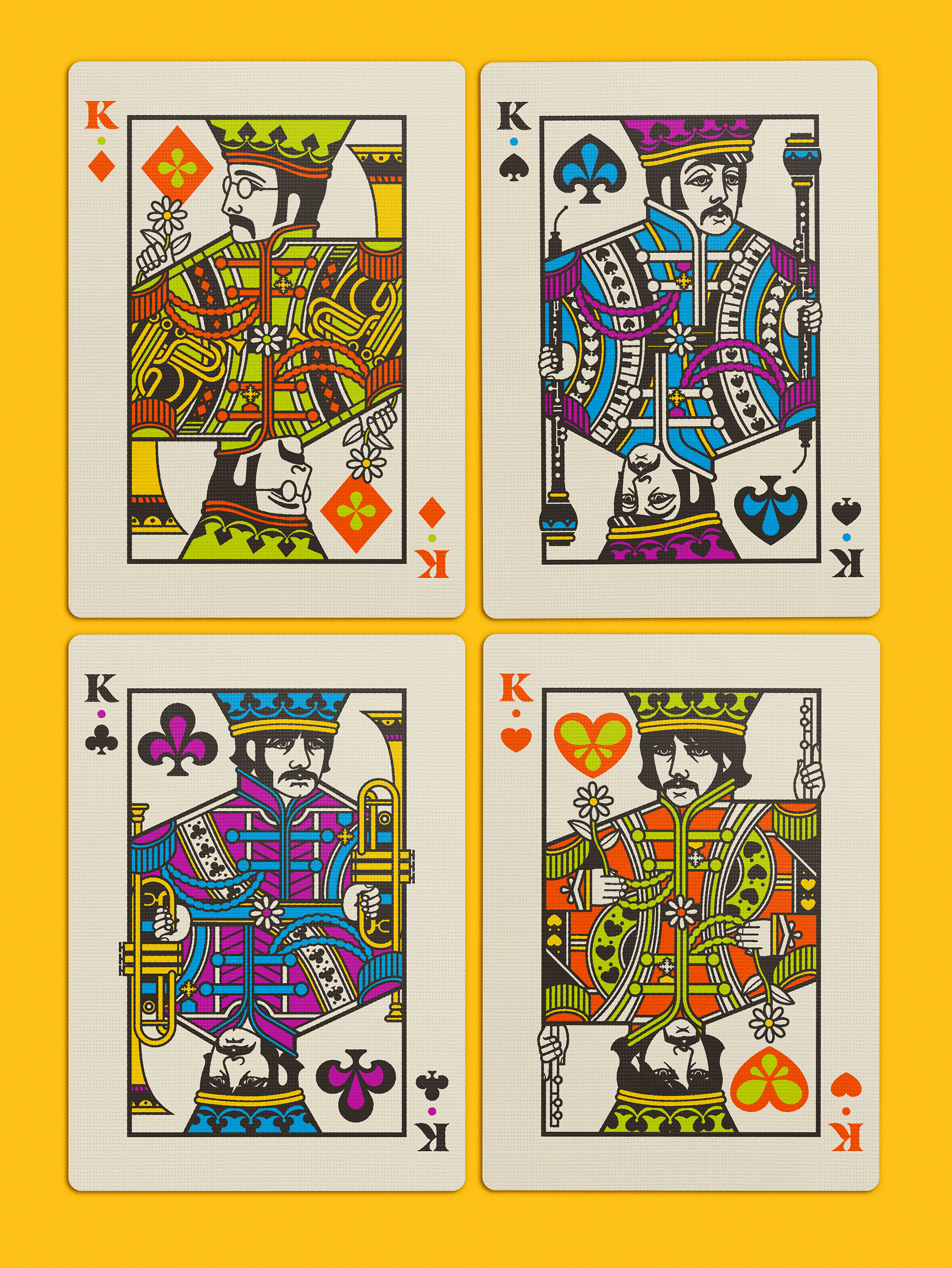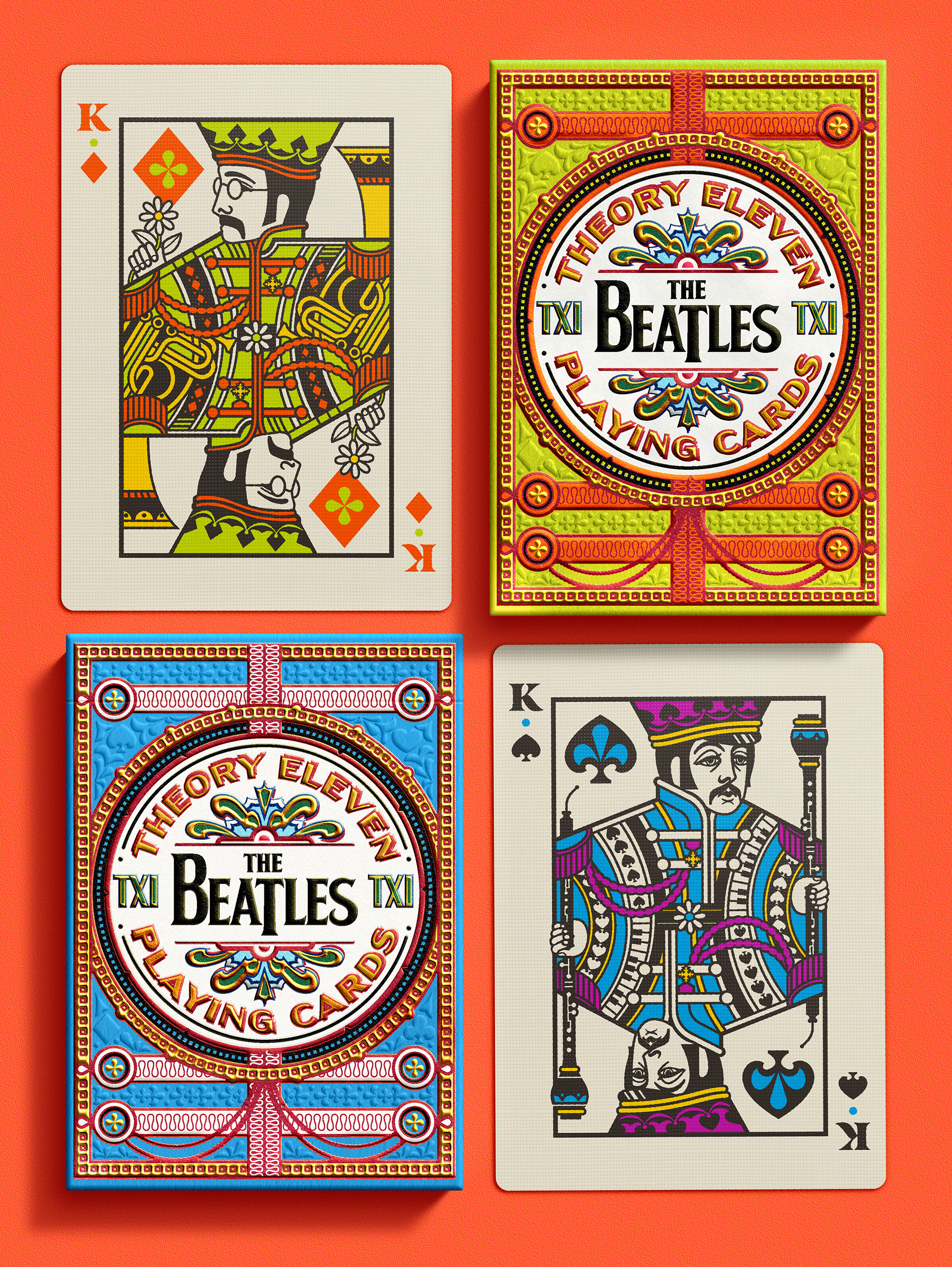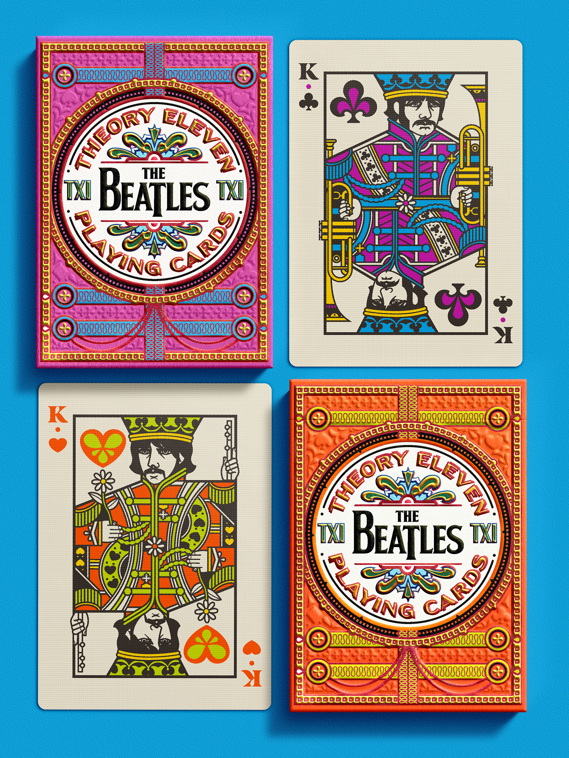 Four separate tucks were made, one for each Beatle. The colors reflect the colors of the costumes worn on the iconic Sgt Pepper album cover: Yellow/green = John Lennon; Blue = Paul McCartney; Orange = George Harrison; Pink / red = Ringo Starr. Each deck has the same cards, but with corresponding card back colors. The boxes were printed by Studio On Fire.