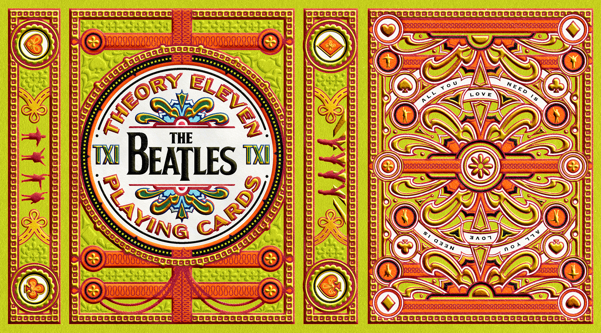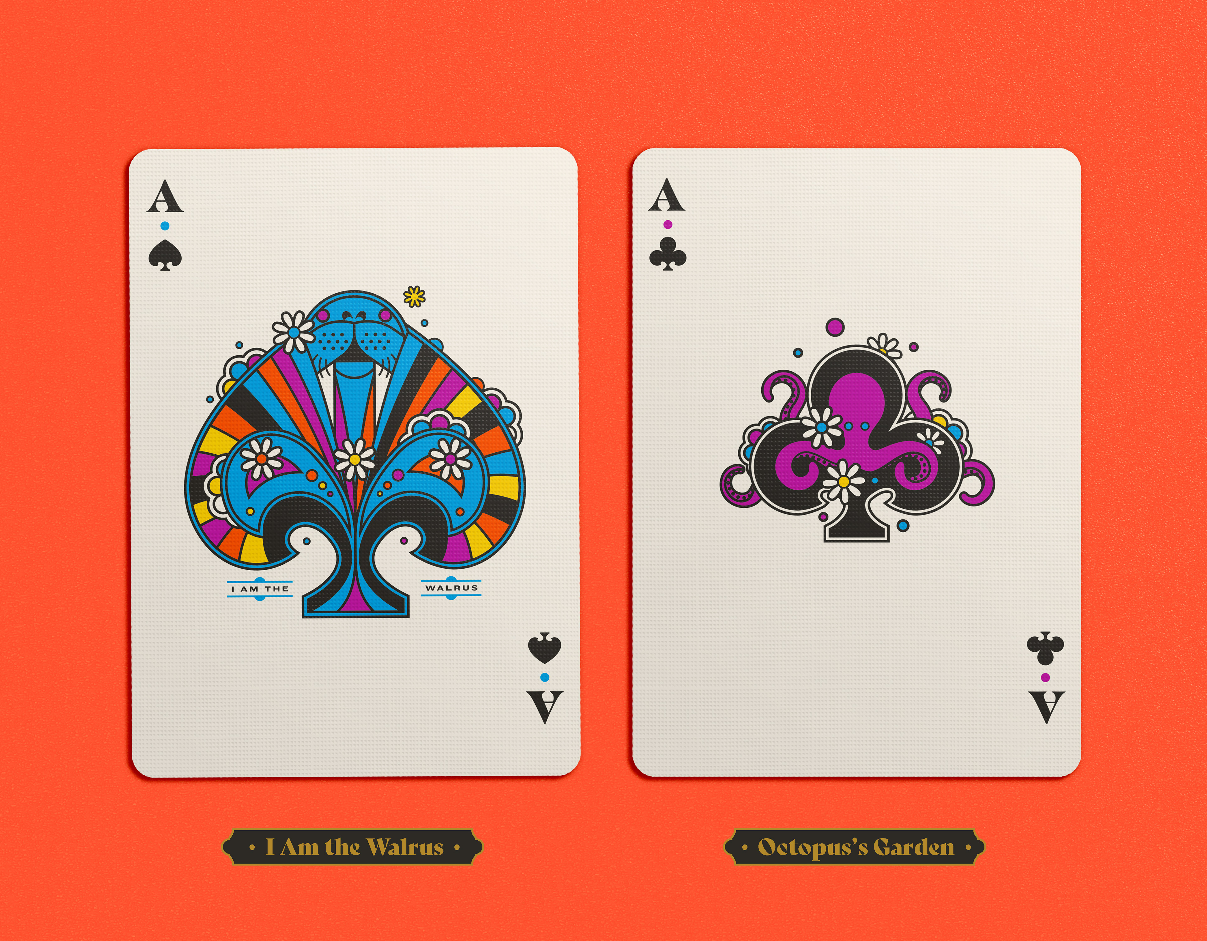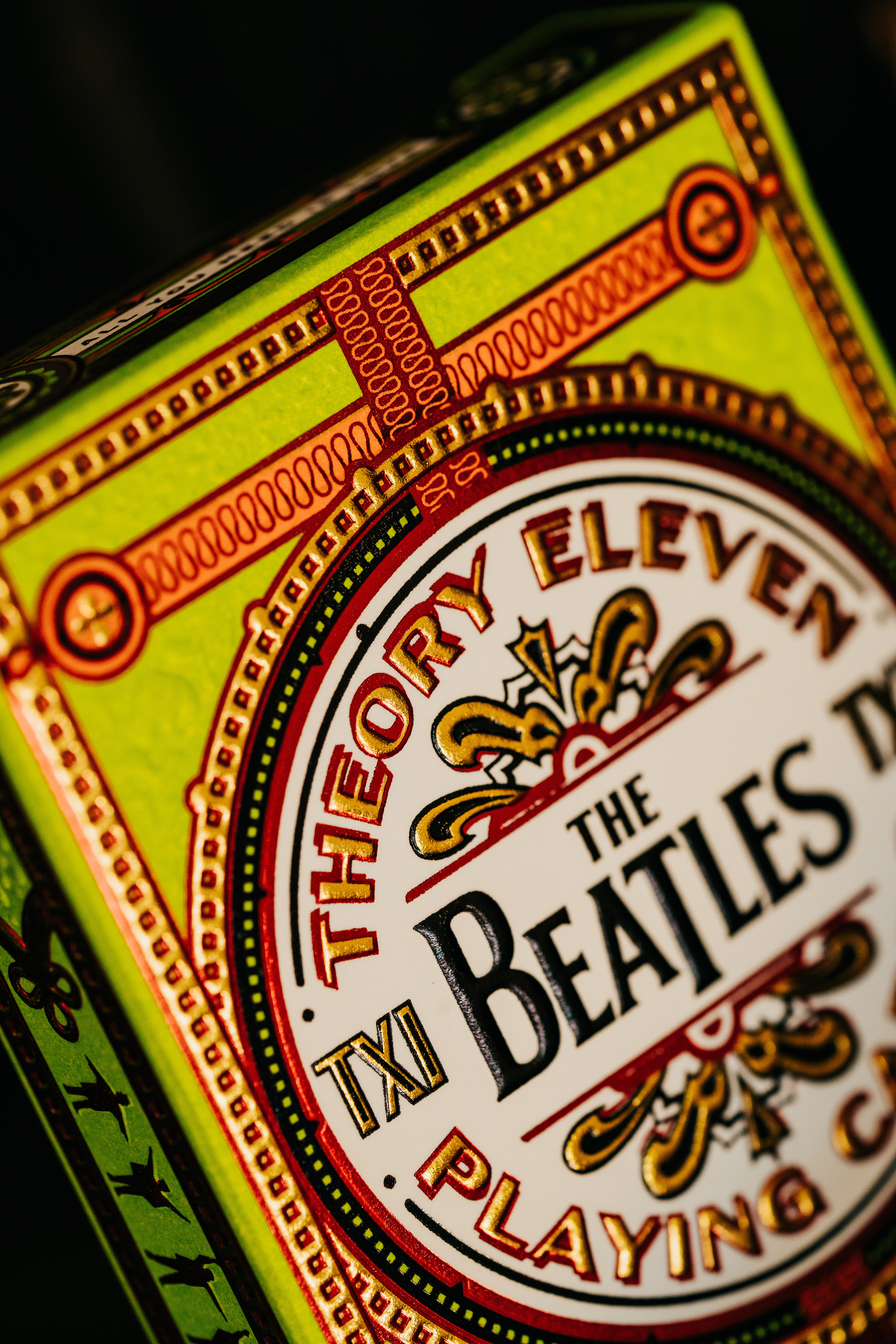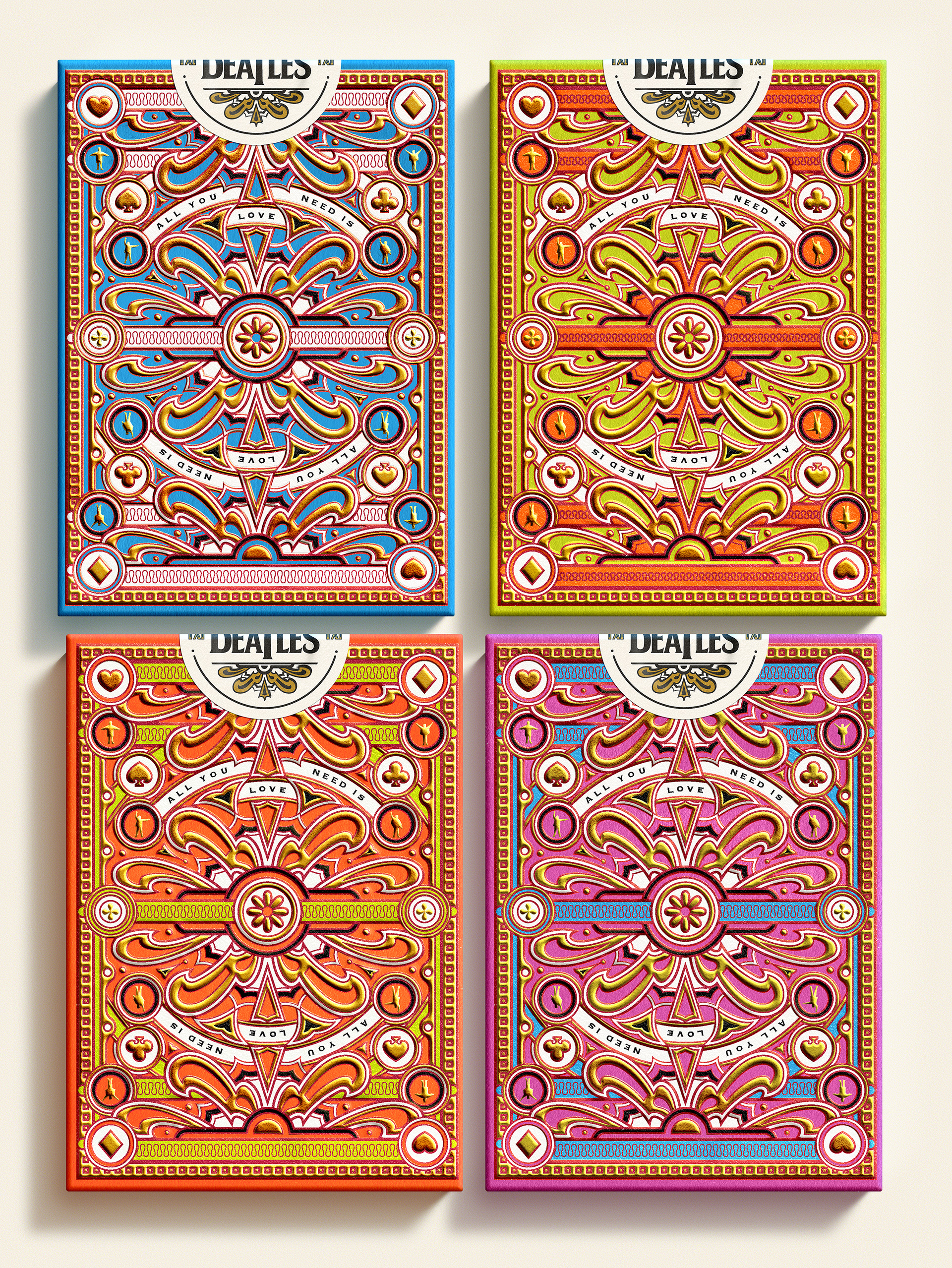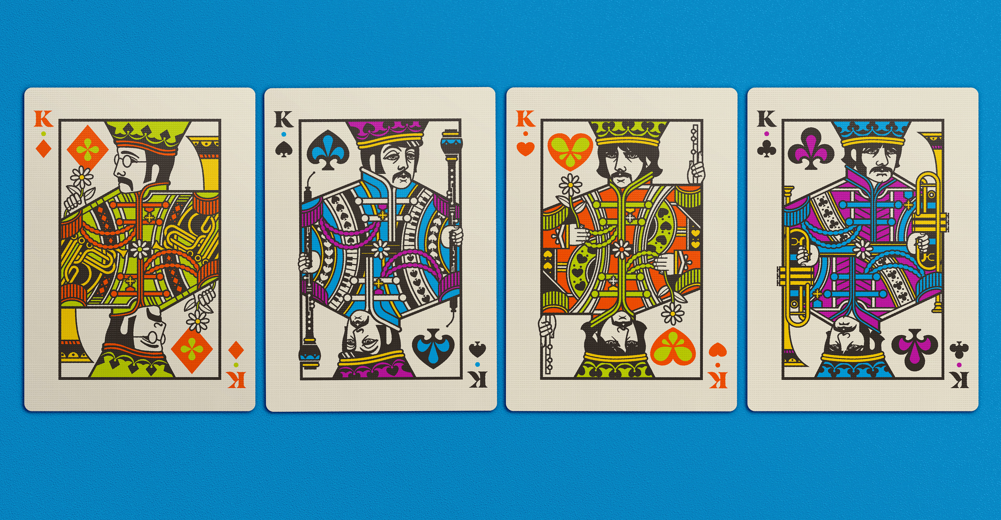 Four separate tucks were made, one for each Beatle. The colors reflect the colors of the costumes worn on the iconic Sgt Pepper album cover: Yellow/green = John Lennon; Blue = Paul McCartney; Orange = George Harrison; Pink / red = Ringo Starr. Each deck has the same cards, but with corresponding card back colors. The boxes were printed by Studio On Fire.