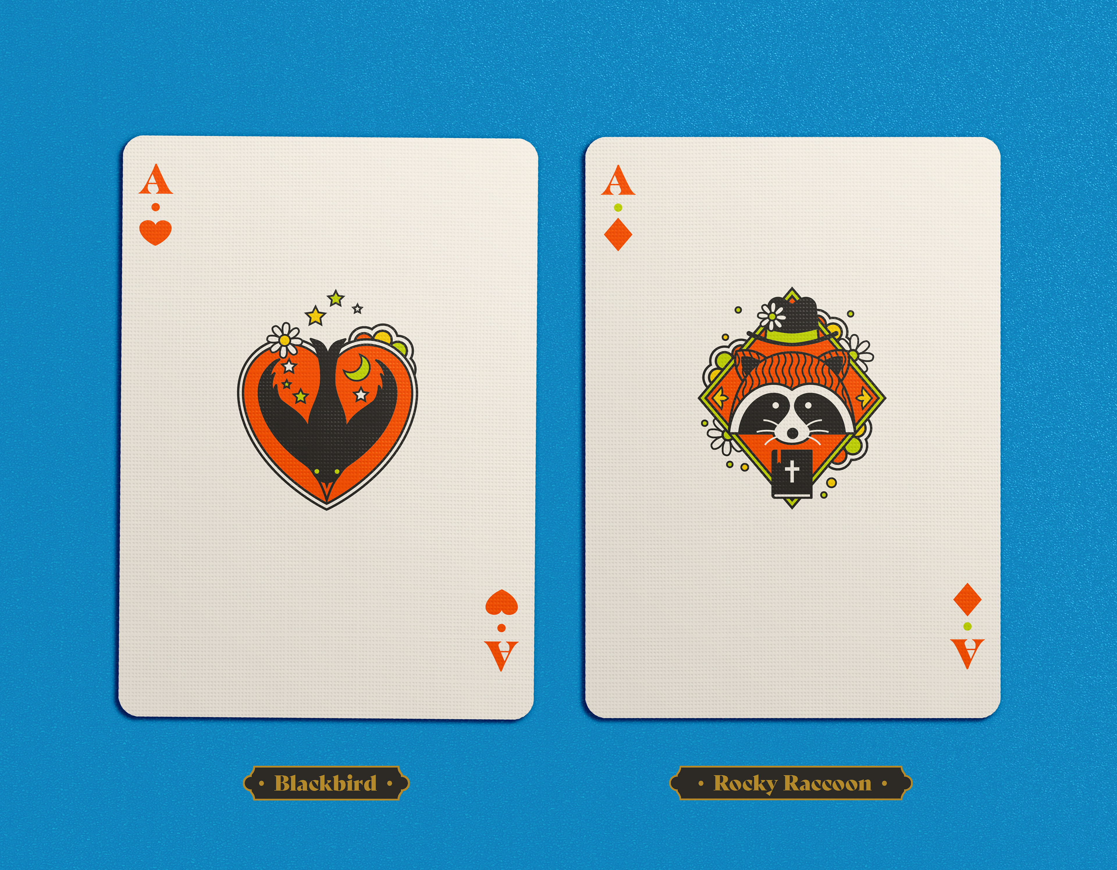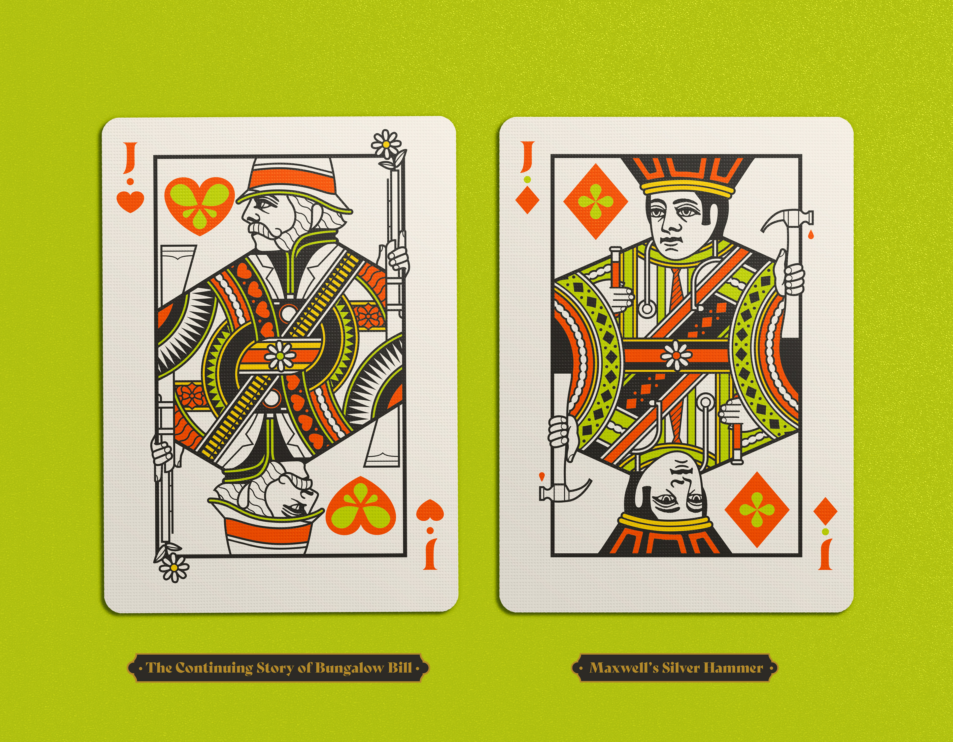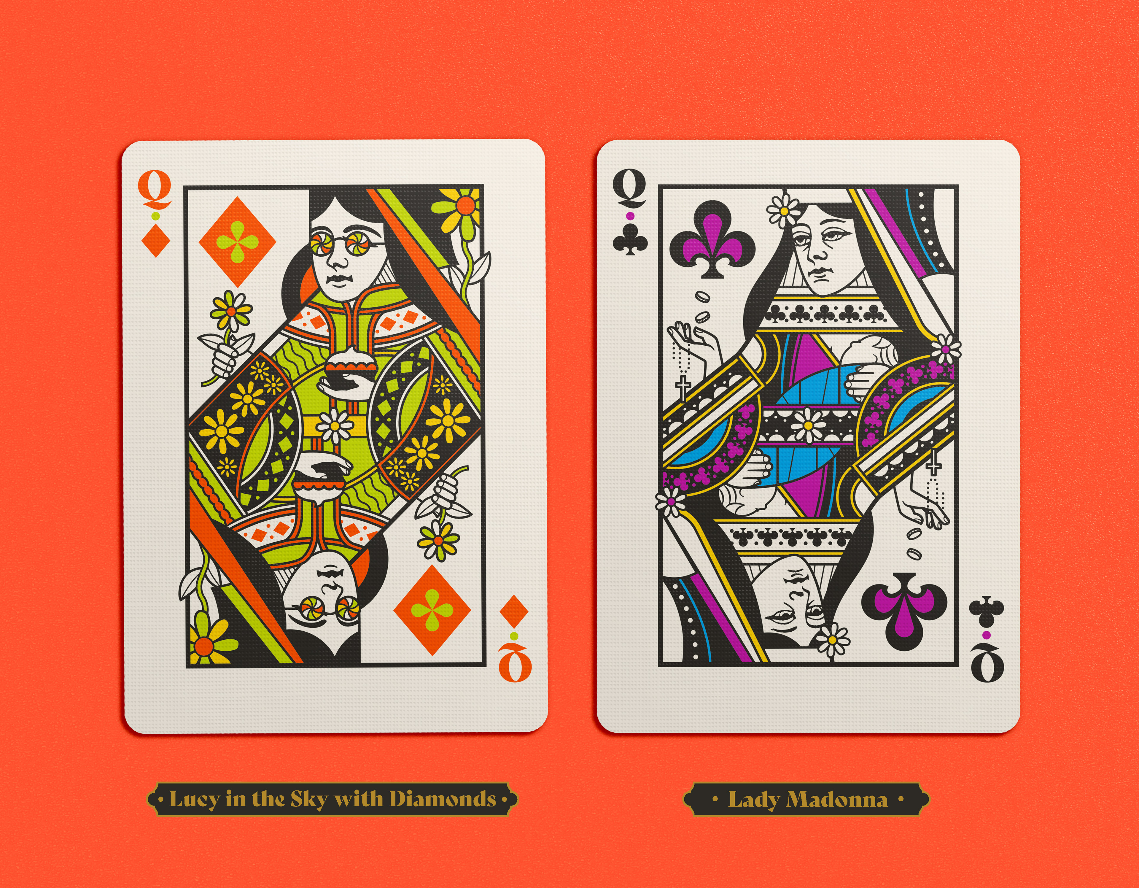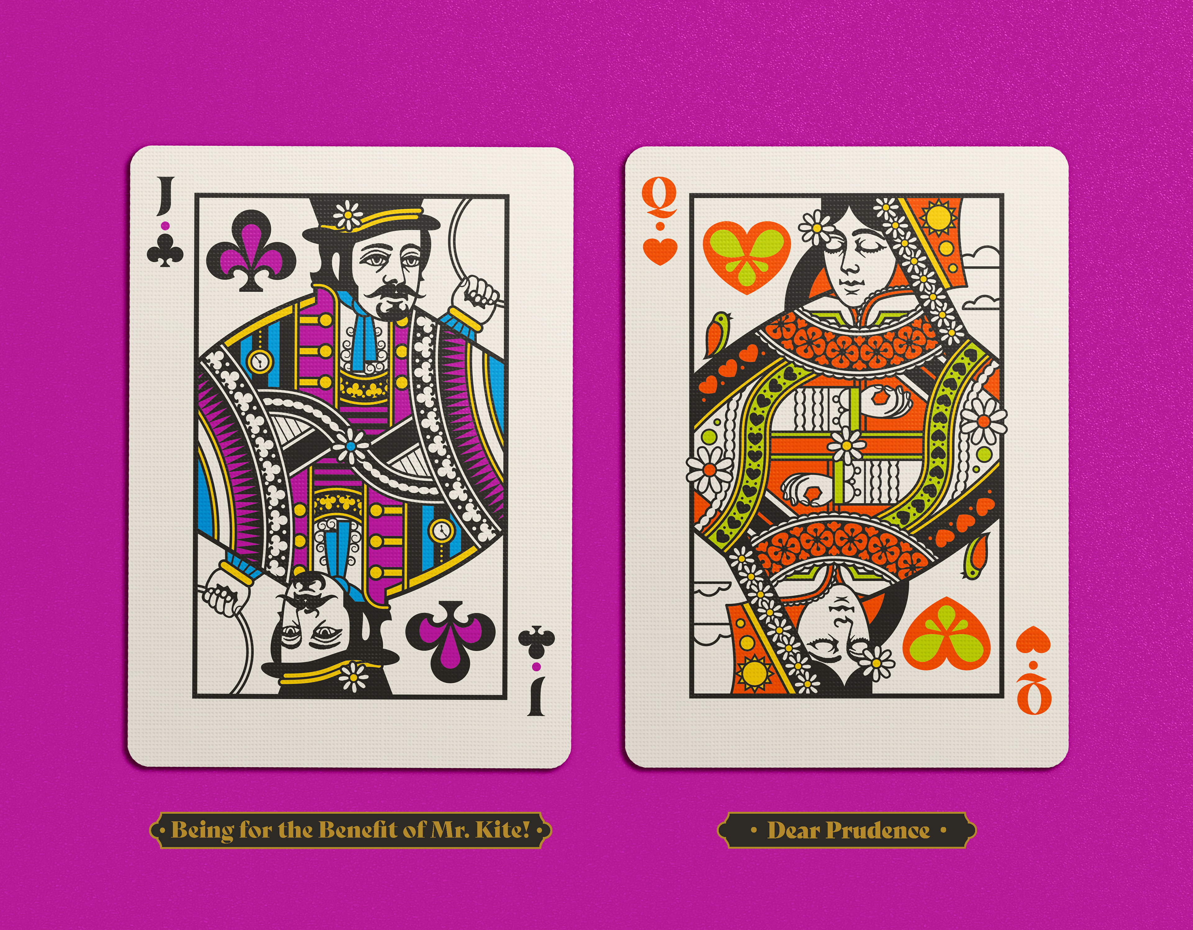 Four separate tucks were made, one for each Beatle. The colors reflect the colors of the costumes worn on the iconic Sgt Pepper album cover: Yellow/green = John Lennon; Blue = Paul McCartney; Orange = George Harrison; Pink / red = Ringo Starr. Each deck has the same cards, but with corresponding card back colors. The boxes were printed by Studio On Fire.