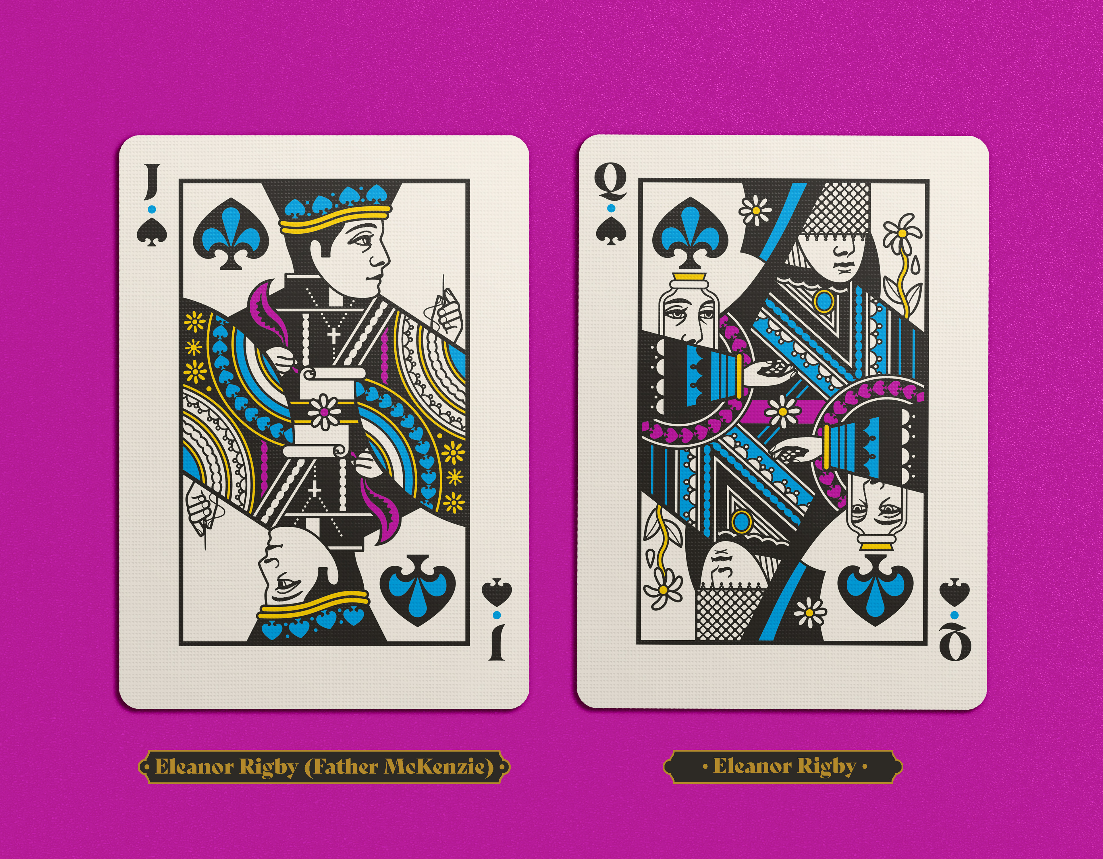 For the other face cards: our approach was to not simply reference songs (which we did), but since these are face cards, we tried to pick out songs that feature characters. But in addition, each one includes multiple references to lyrics from the songs. Mr. Kite's clock notes the time of ten to 6:00, Father McKenzie writes the words of a sermon that no-one will hear, while darning his socks. Eleanor Rigby holds her face that she keeps in a jar by the door, while picking up the rice in the church where a wedding has been.