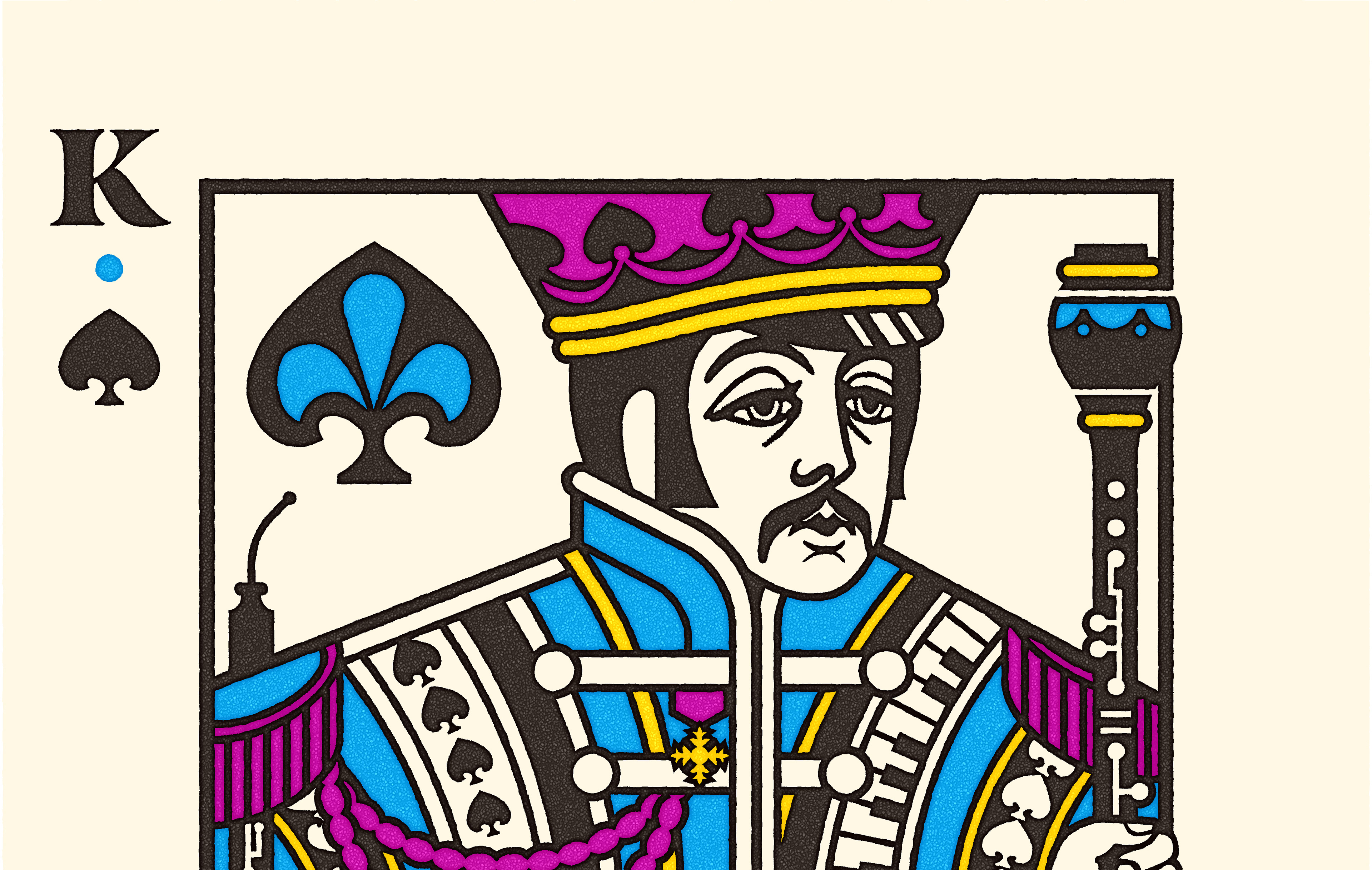 Our main goal was to feature the Fab Four, and we chose to have them wearing their costumes from the iconic Sgt Pepper album cover. We also hoped to make these cards look as traditional as possible, even using the actual eyes / mouth / nose of standard, traditional playing cards when possible. By simply rotating Paul's eye slightly, it was amazing how a traditional King of Spades could be turned into Paul McCartney. And, as an interesting side-note, Sir Paul himself reviewed the card, and I'm told he liked it! However, in the end, legal concerns meant I had to redraw all the faces in the style of Heinz Edelman's Yellow Submarine characterizations of the Fab Four. That version of the Kings is shown a ways down below, toward the end of the post.