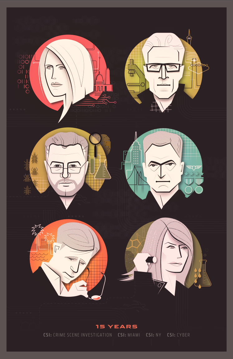 CSI 15 year commemorative illustrations done for CBS. Includes 6 key characters from the long-running series and spin-off series.