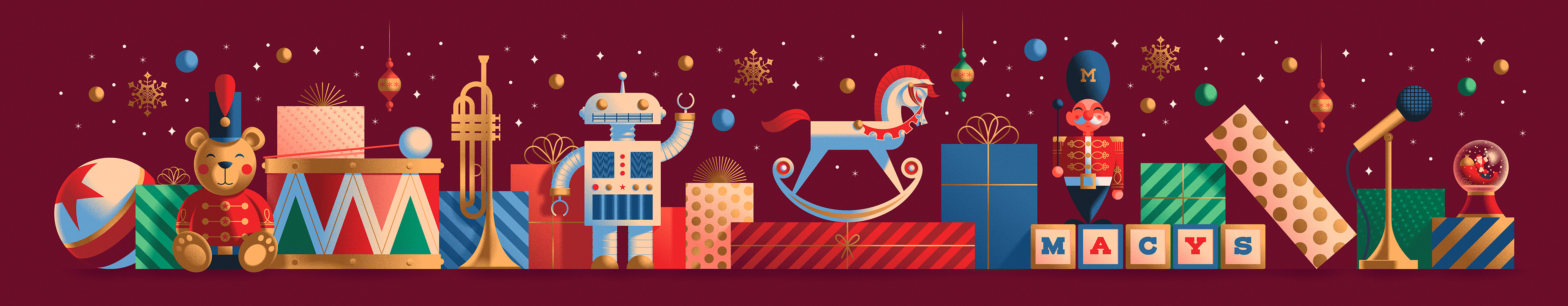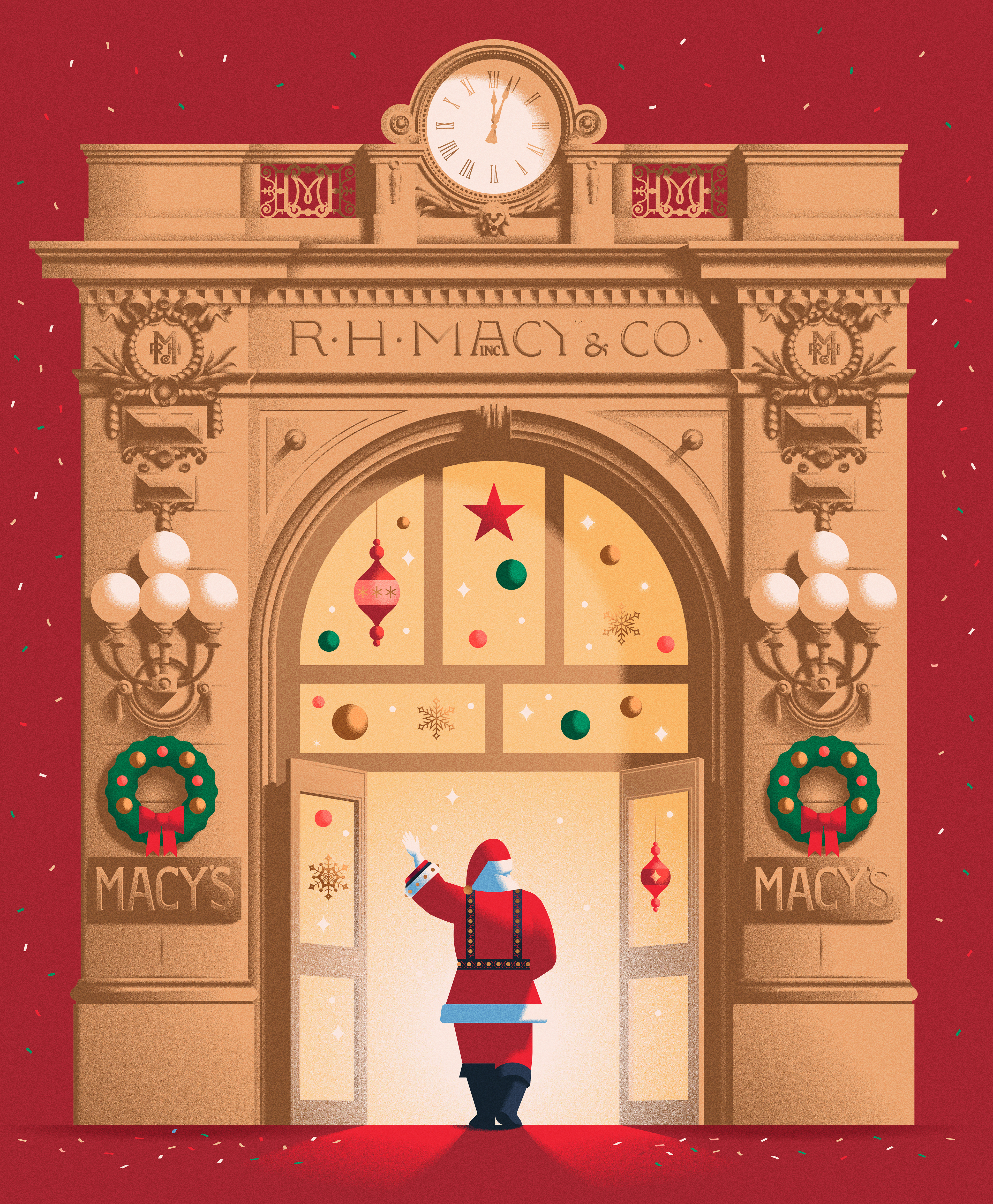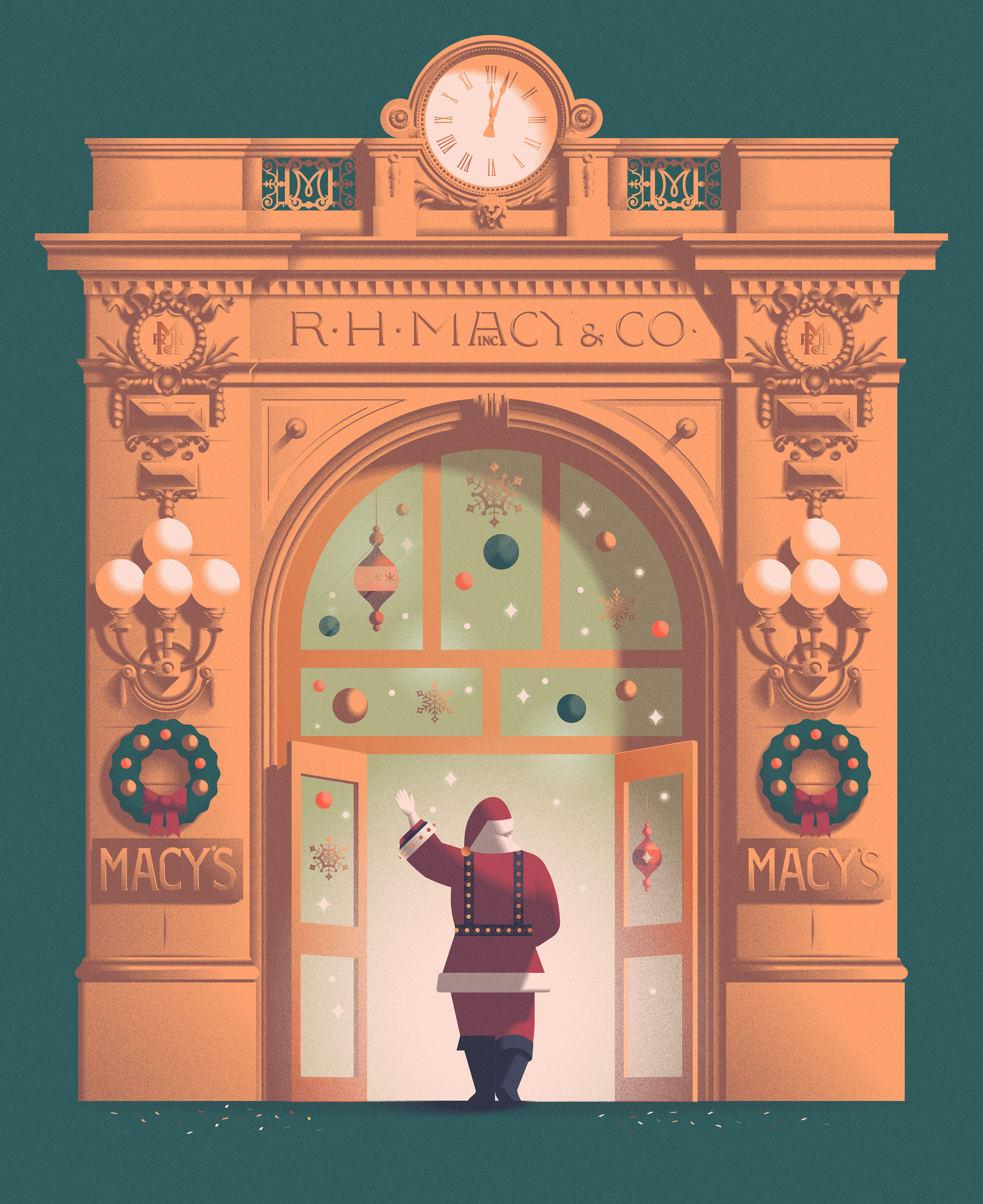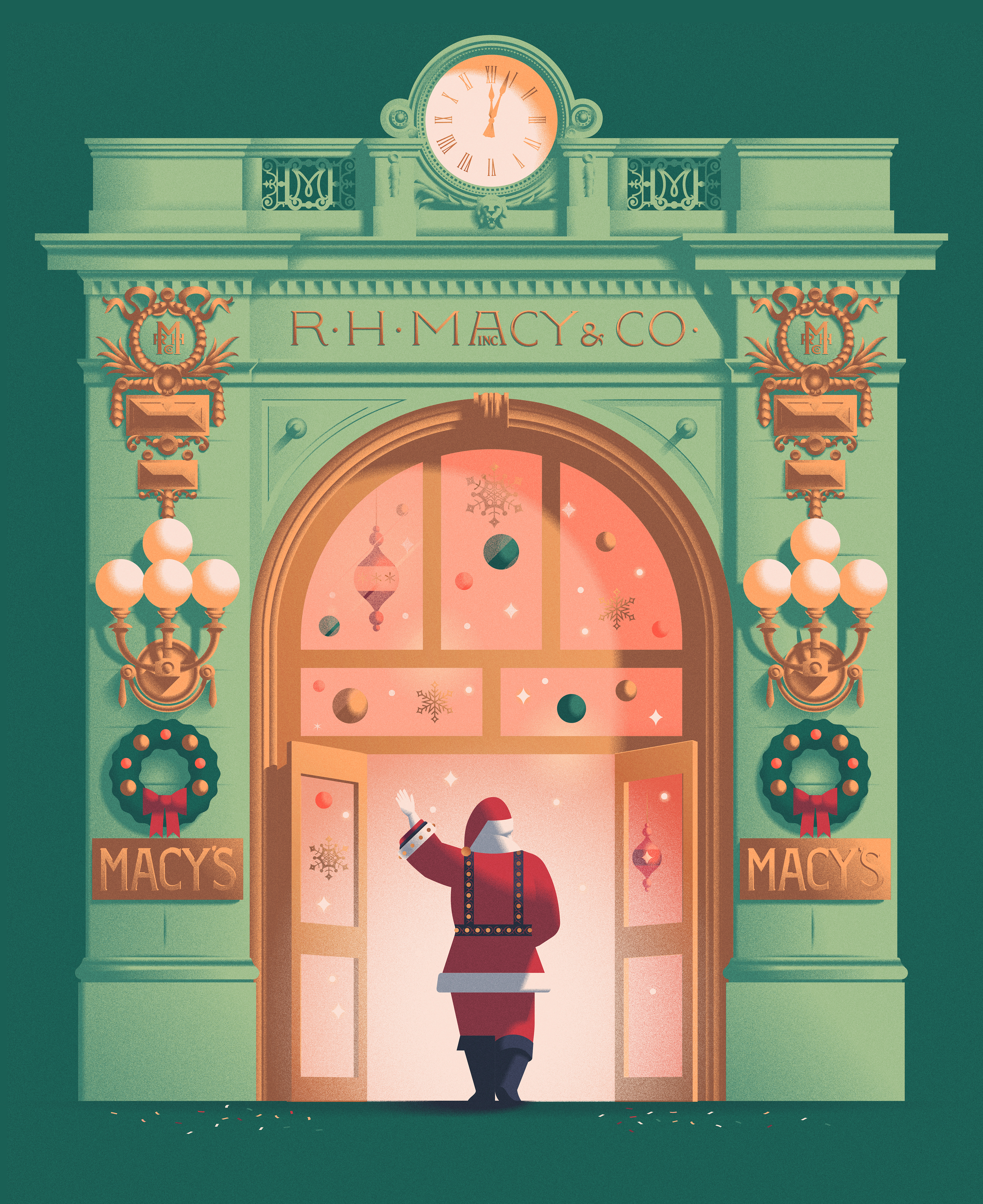 At the end of the Macy's Thanksgiving Day Parade, the Santa Claus float is the last of all, and as a finale, he steps down from the sleigh and makes his grand entrance into the Herald Square entrance of the historic Macy's store, kicking off the Christmas / Holiday season. As the second part of the Macy's Thanksgiving Day Parade project, I had the privilege to illustrate an array of images. and create typographic treatments and a logo for the Macy's Holiday Celebrations, in behalf of Mattson Creative. This is definitely not all the work, but some selects are shown here.