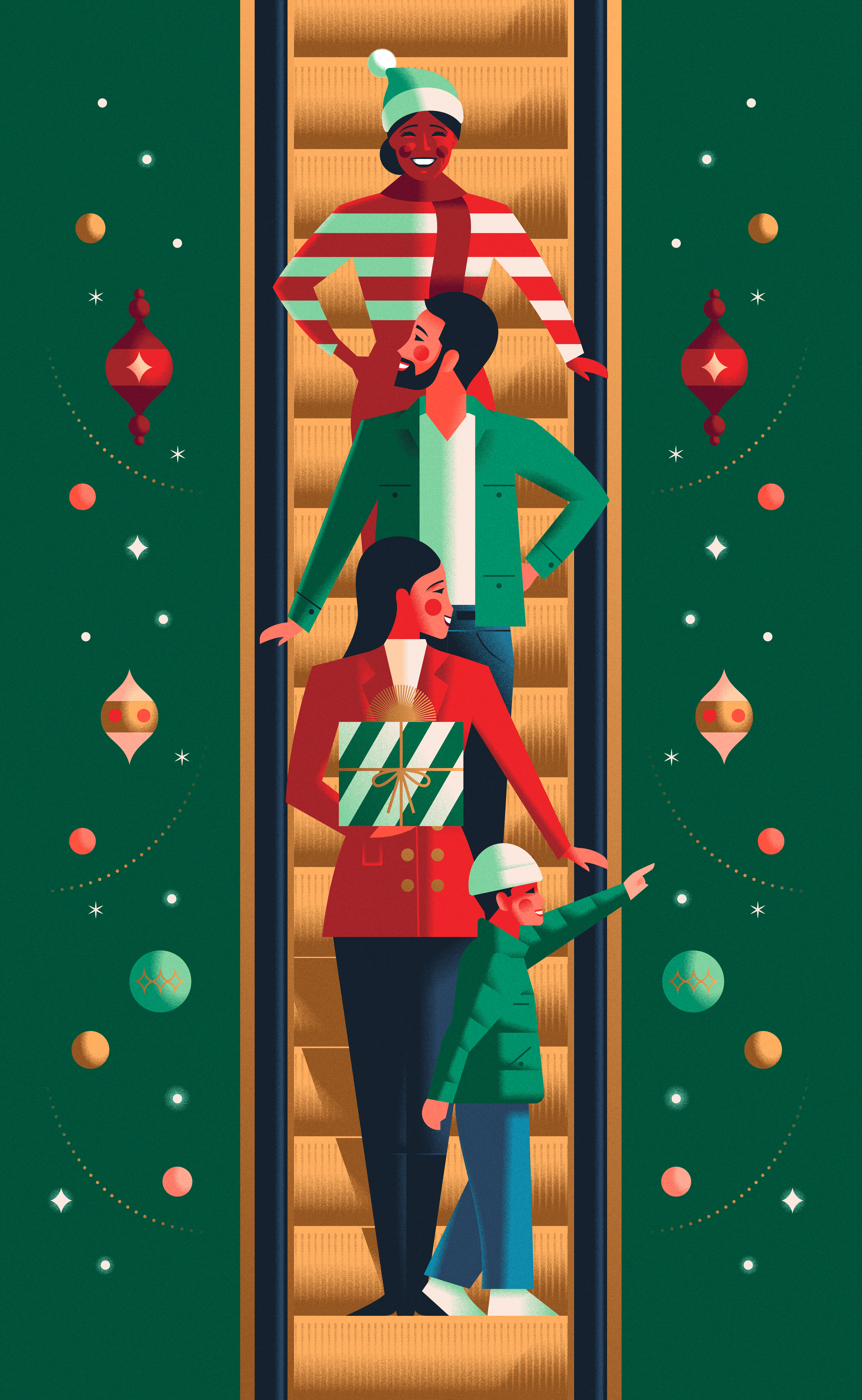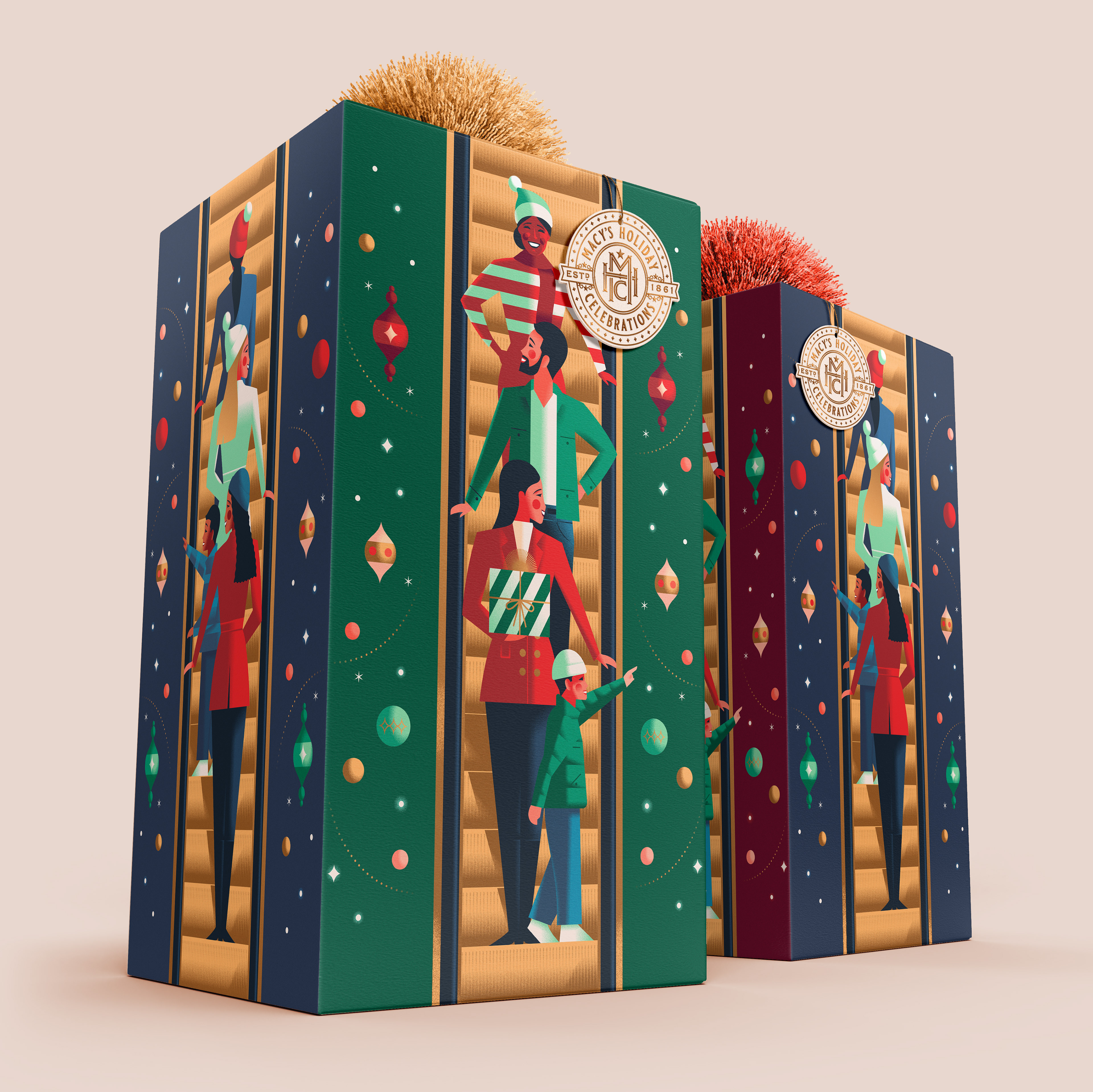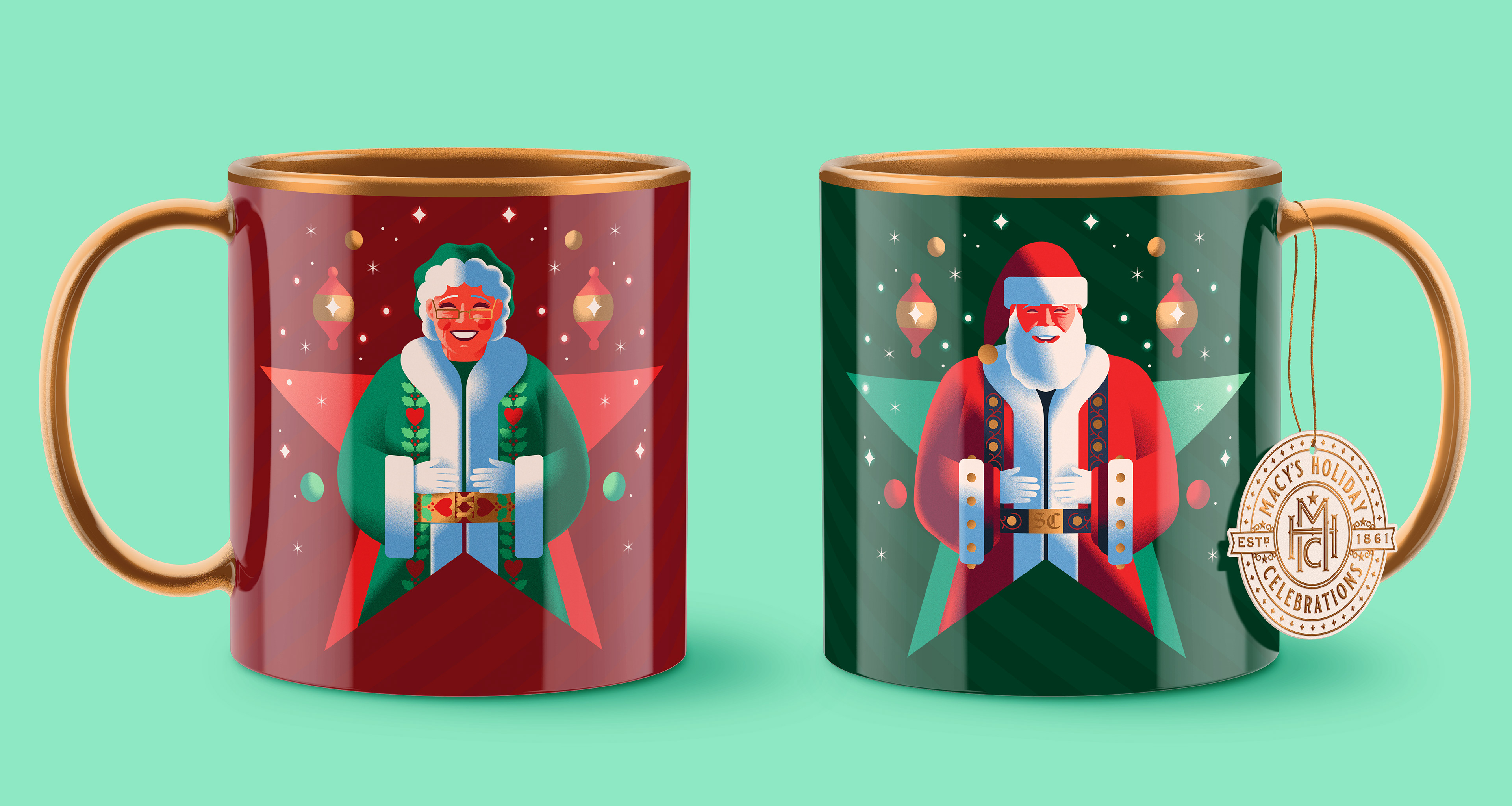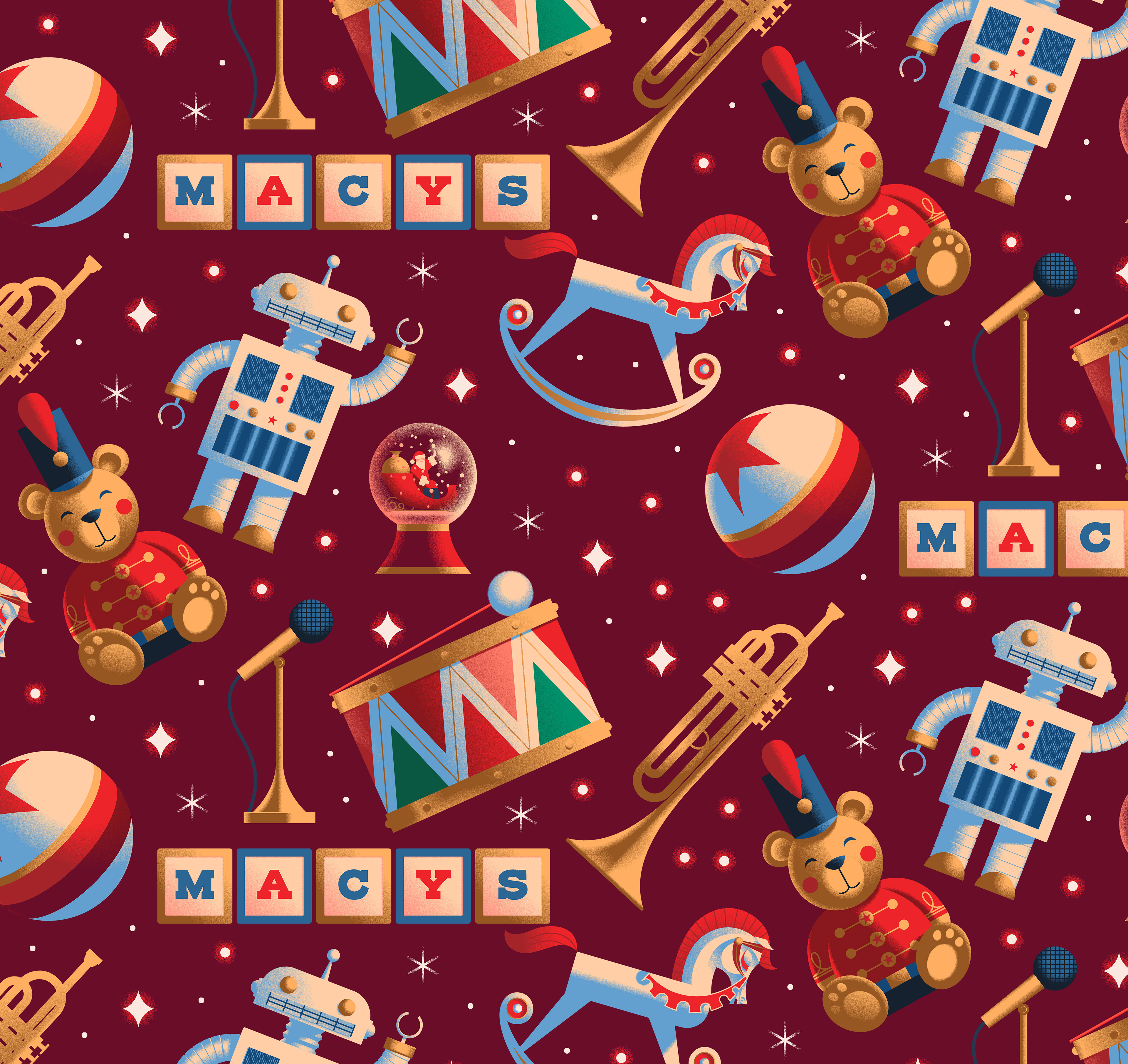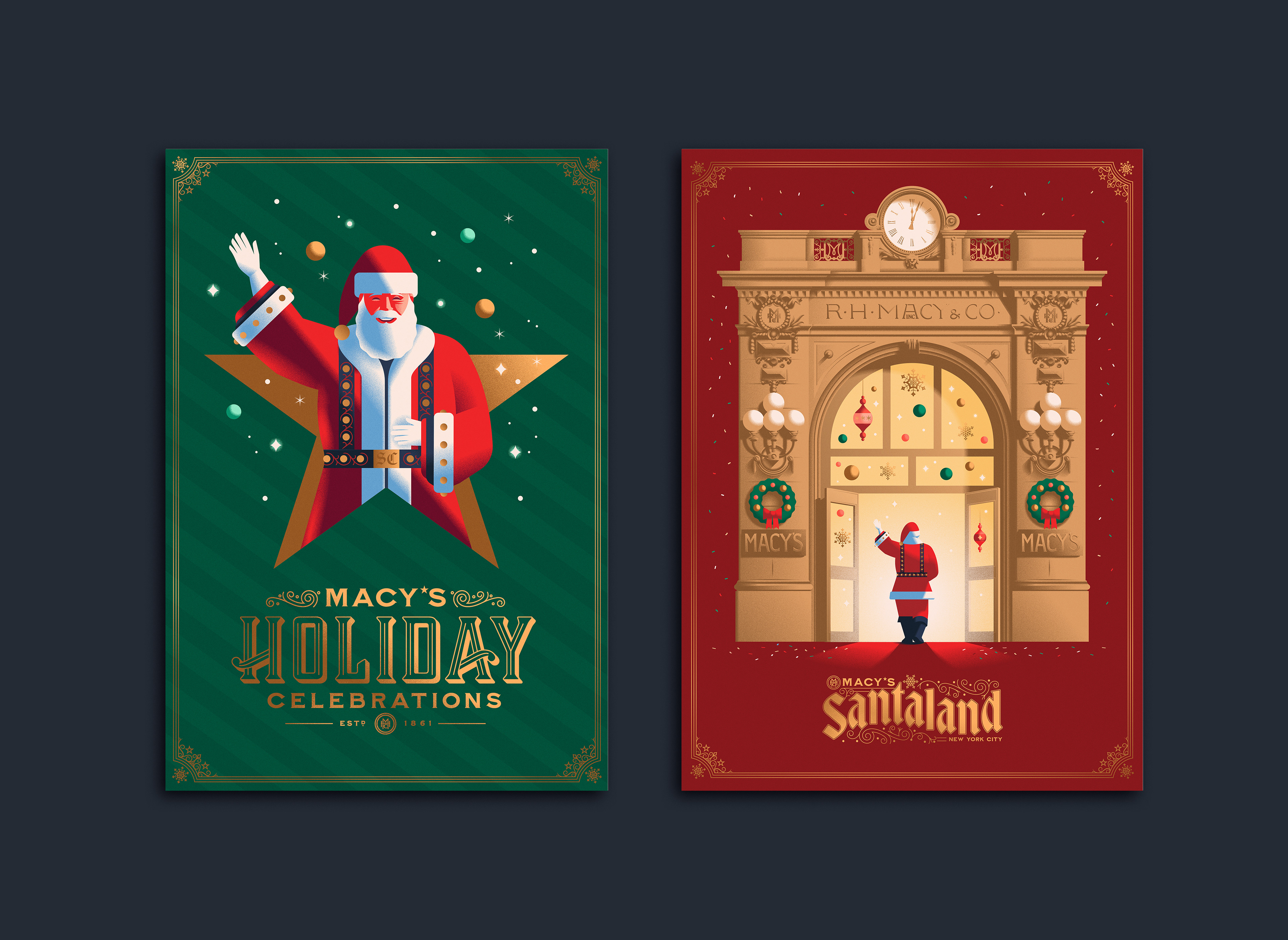 At the end of the Macy's Thanksgiving Day Parade, the Santa Claus float is the last of all, and as a finale, he steps down from the sleigh and makes his grand entrance into the Herald Square entrance of the historic Macy's store, kicking off the Christmas / Holiday season. As the second part of the Macy's Thanksgiving Day Parade project, I had the privilege to illustrate an array of images. and create typographic treatments and a logo for the Macy's Holiday Celebrations, in behalf of Mattson Creative. This is definitely not all the work, but some selects are shown here.
