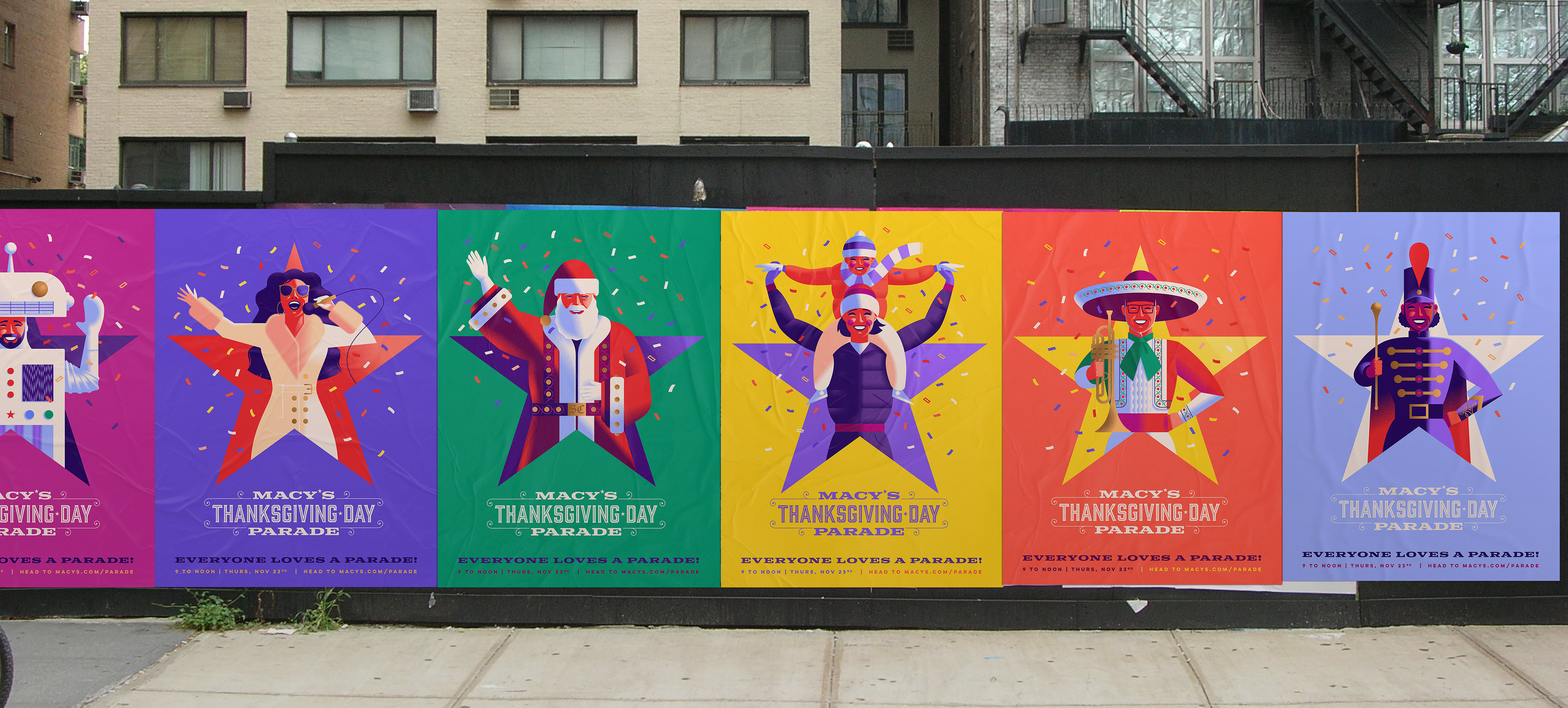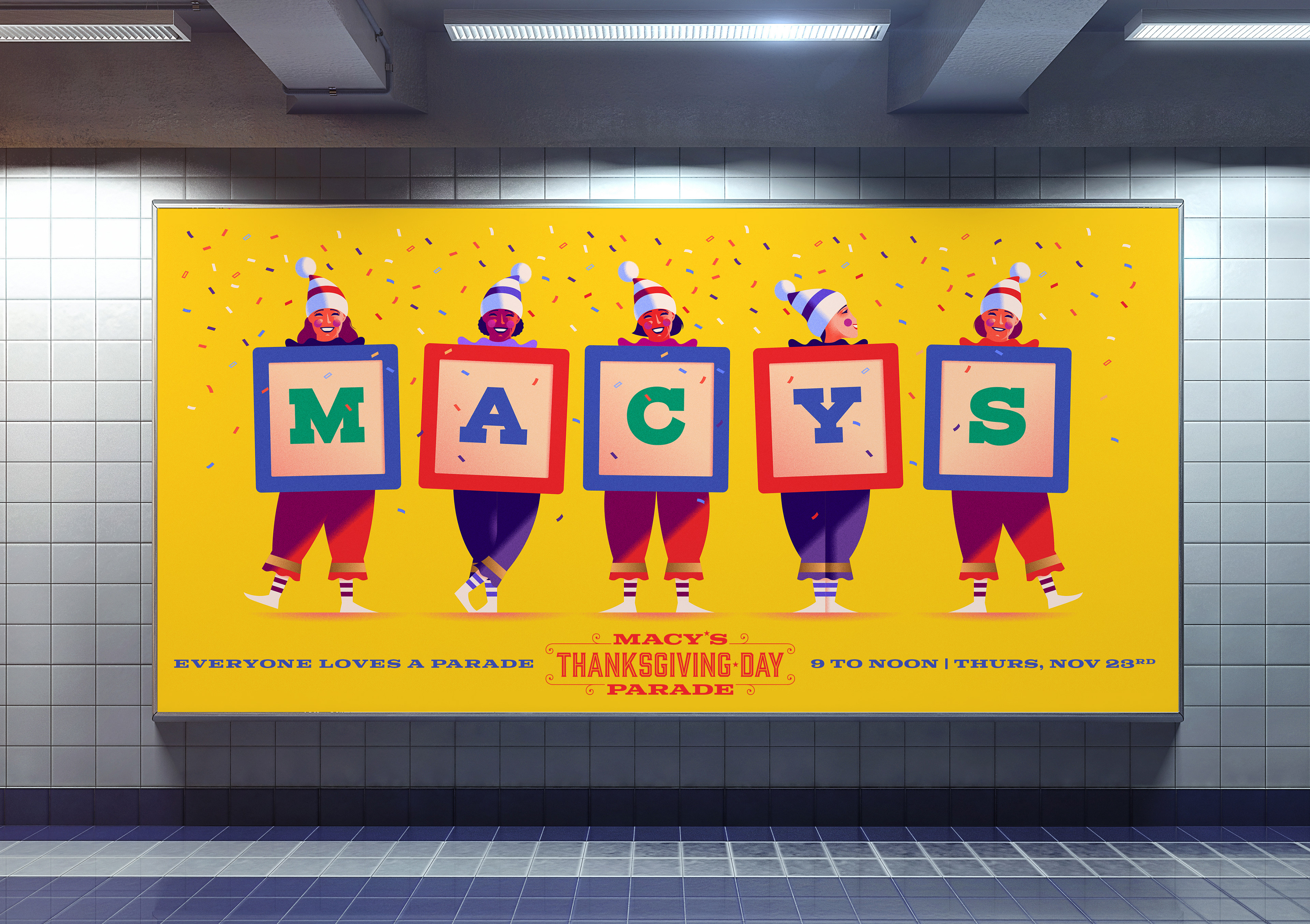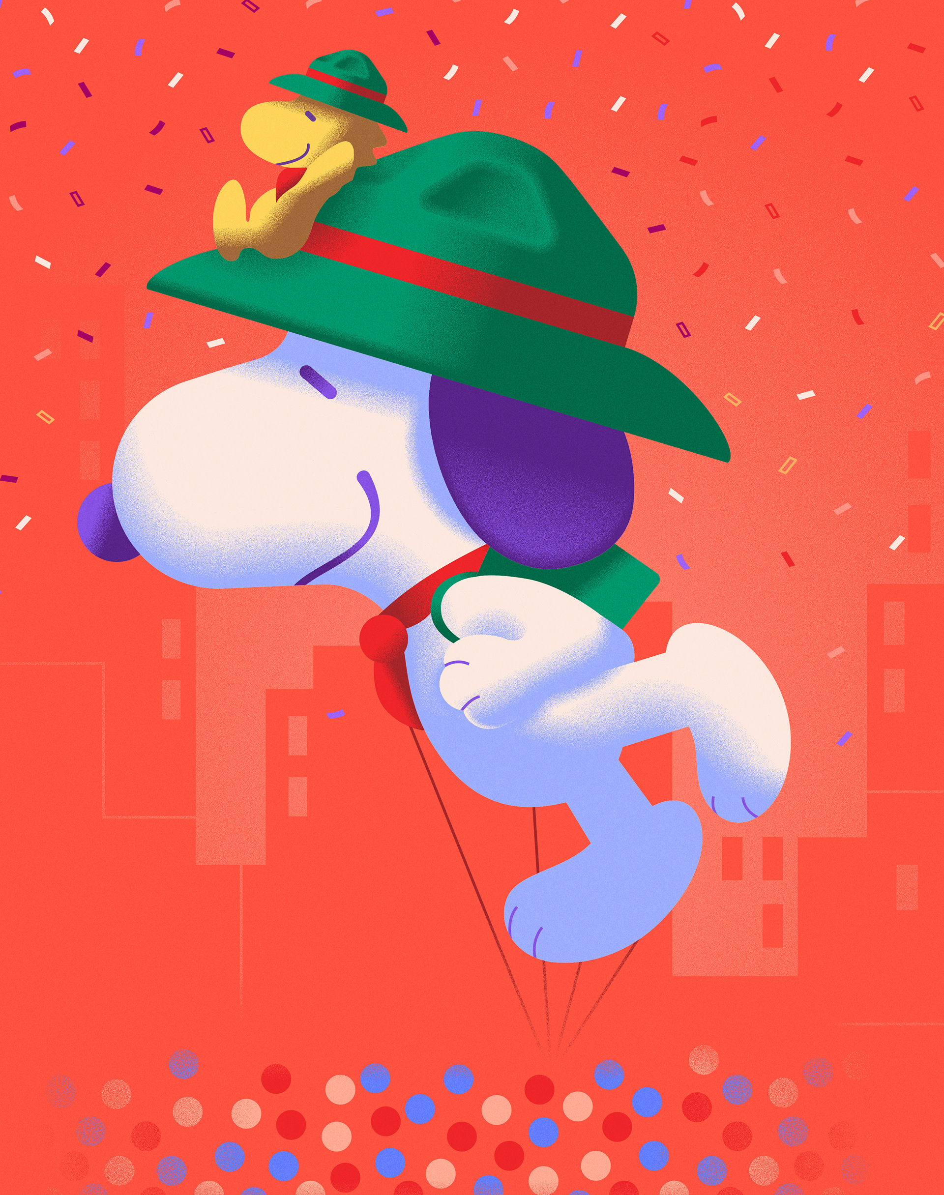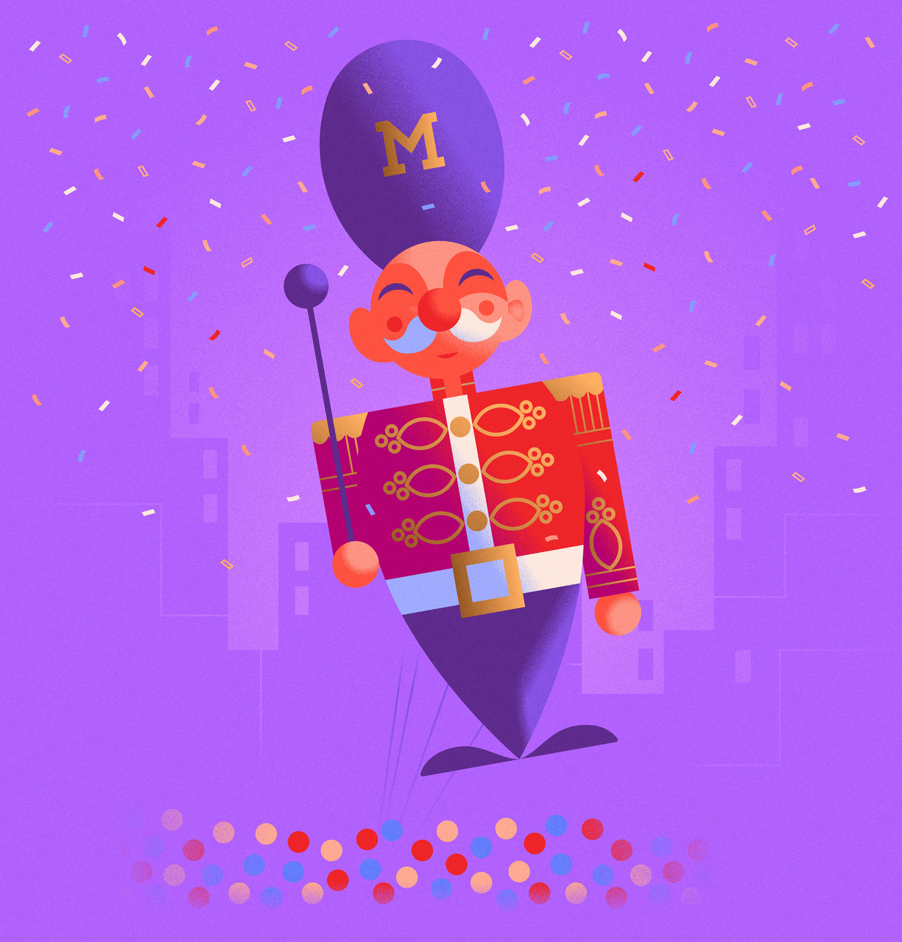 The idea of the illustration style and subject-matter was to create a sense of nostalgia, while not feeling "old". Our aim was to tell the story of the excitement and thrill of the parade, from the perspective of those participating in the parade (dancers, balloon handlers, etc). Often the parade is pictured from the perspective of spectators, but we wanted to tell the story of those who put in hours and years of work to have the privilege of being a part of this historic yearly event.