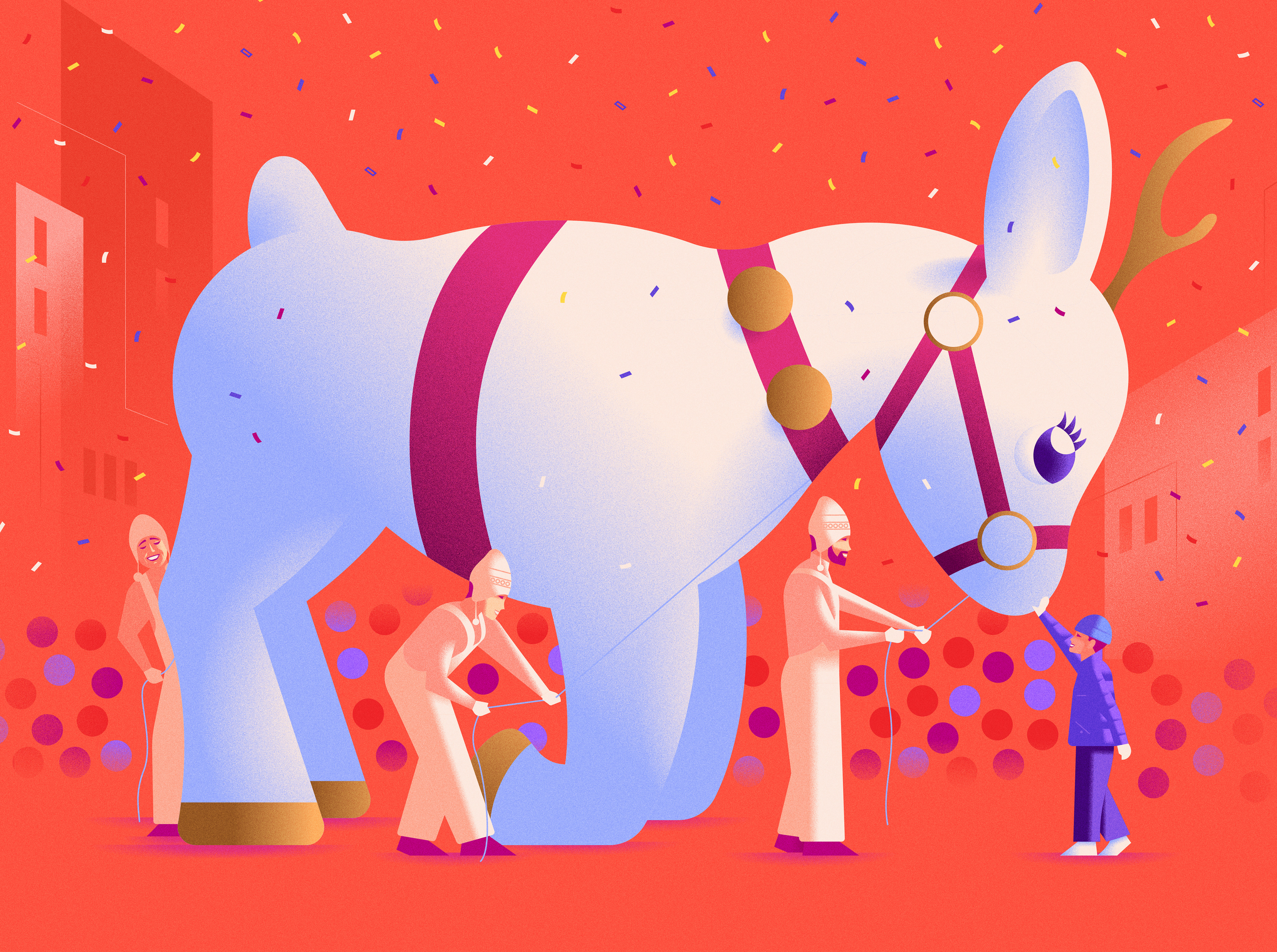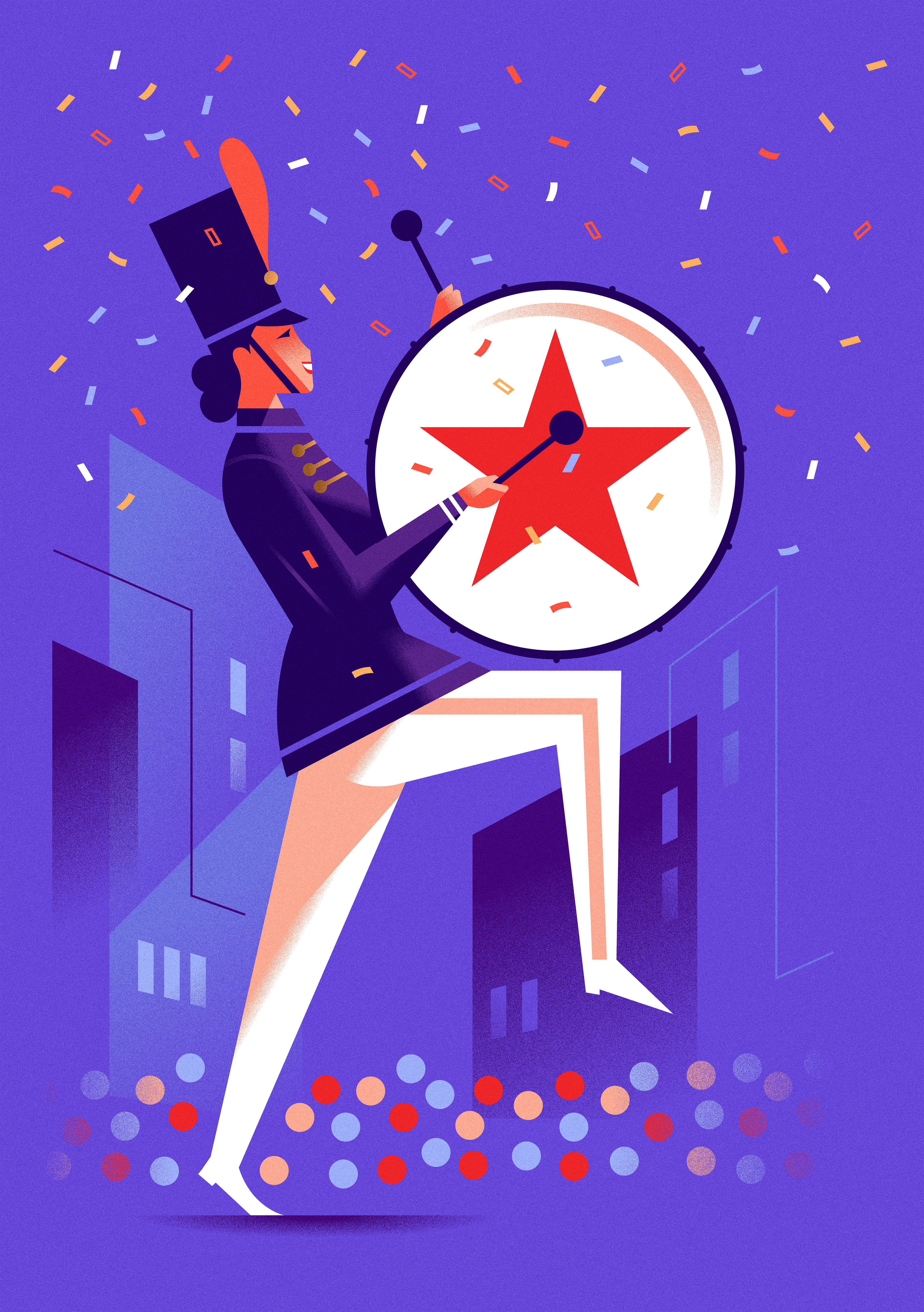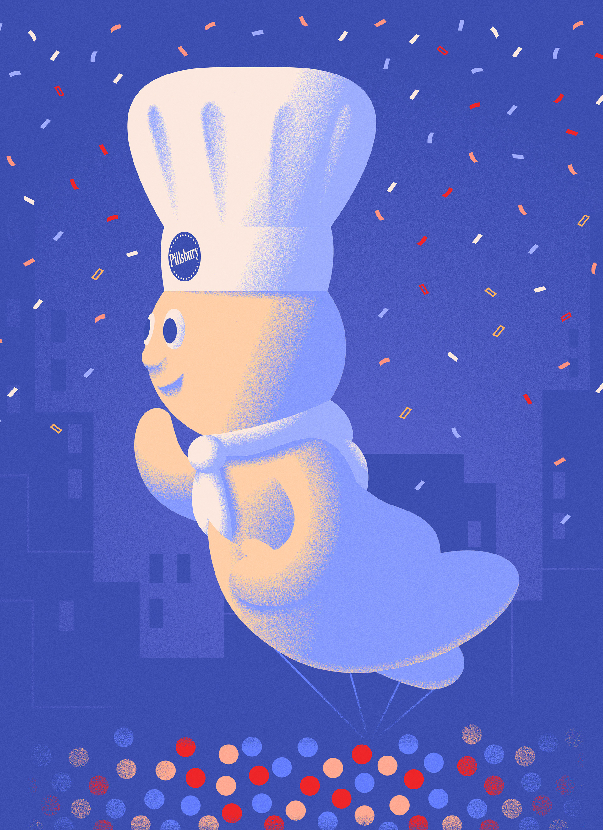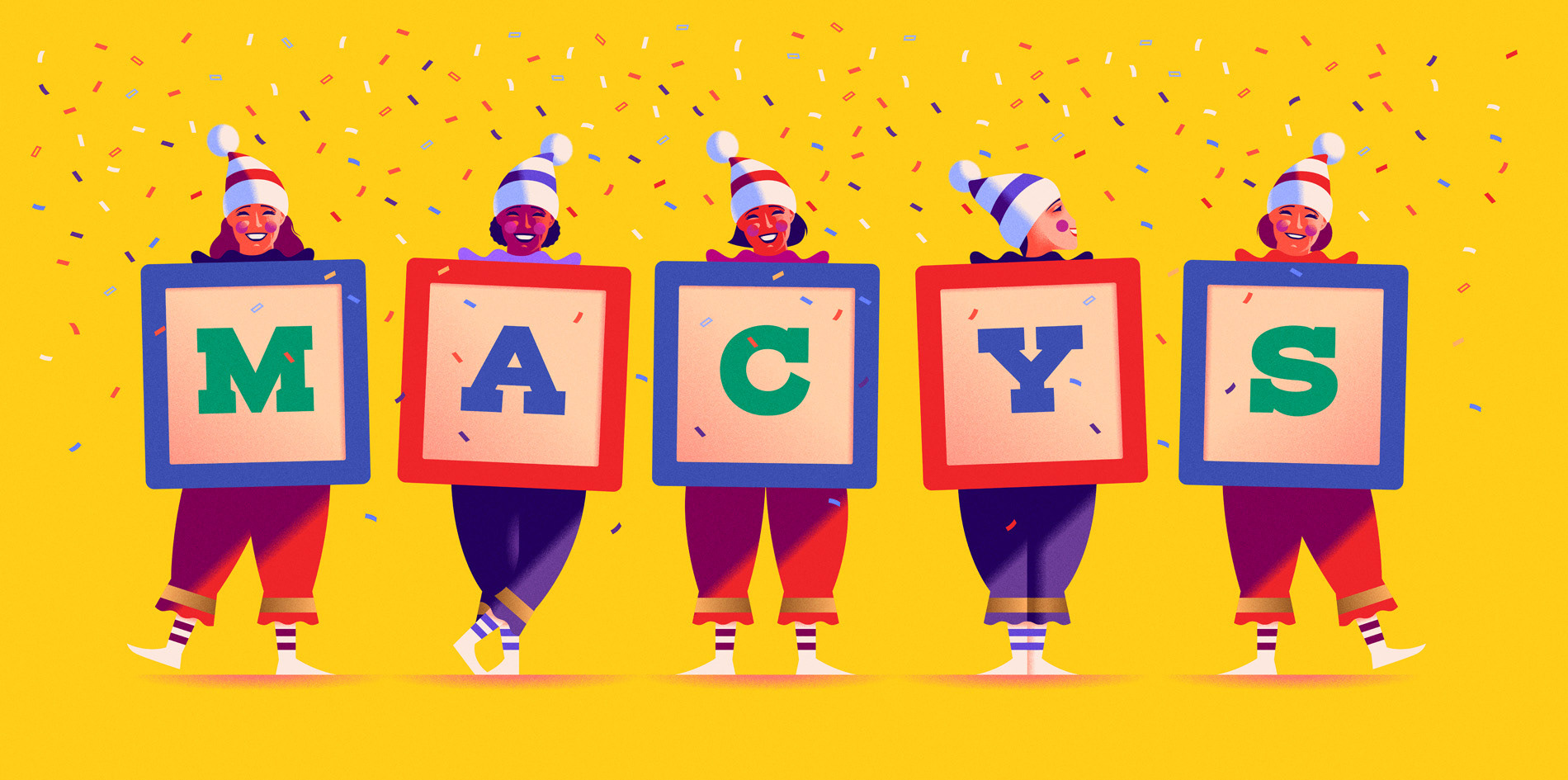 The idea of the illustration style and subject-matter was to create a sense of nostalgia, while not feeling "old". Our aim was to tell the story of the excitement and thrill of the parade, from the perspective of those participating in the parade (dancers, balloon handlers, etc). Often the parade is pictured from the perspective of spectators, but we wanted to tell the story of those who put in hours and years of work to have the privilege of being a part of this historic yearly event.