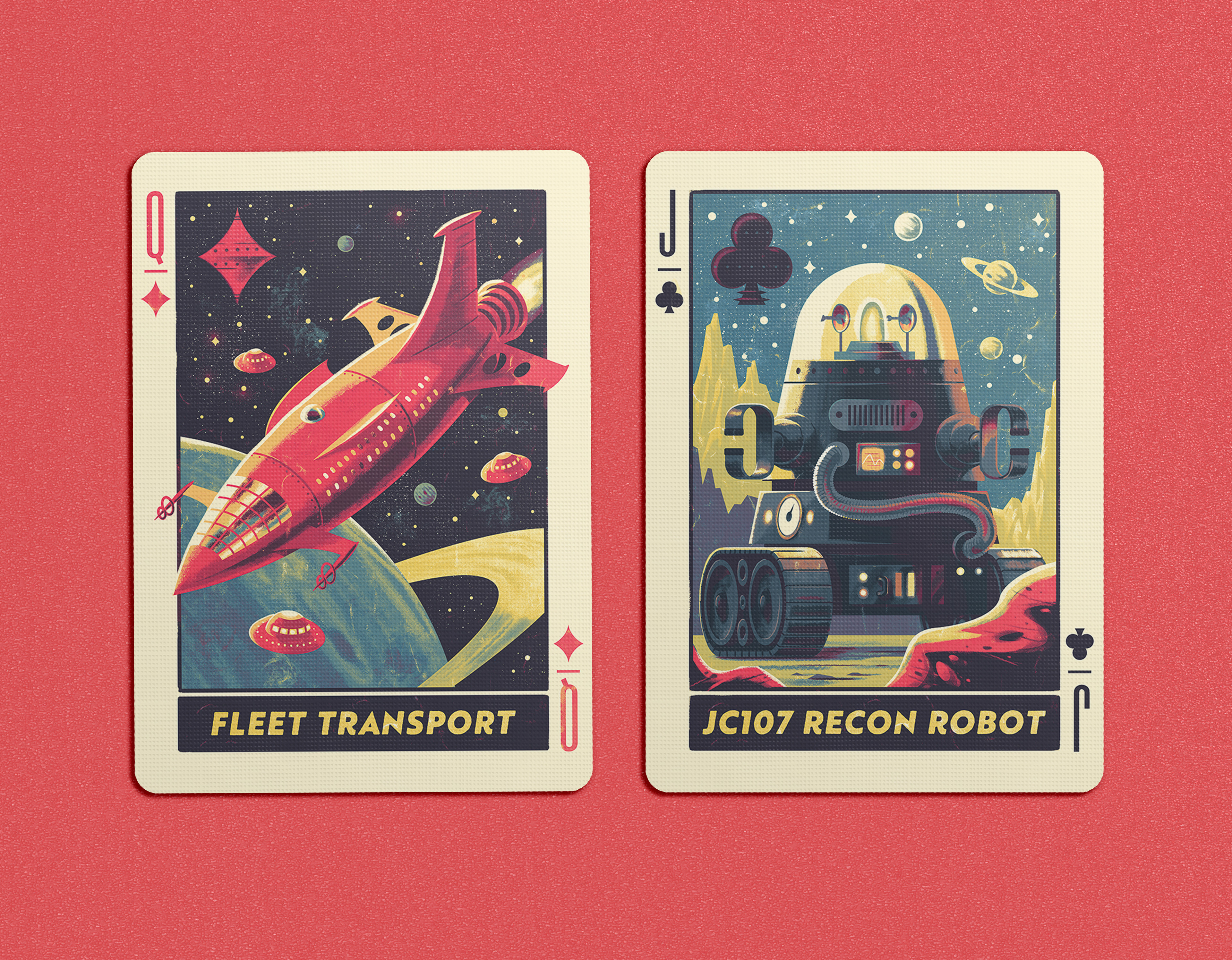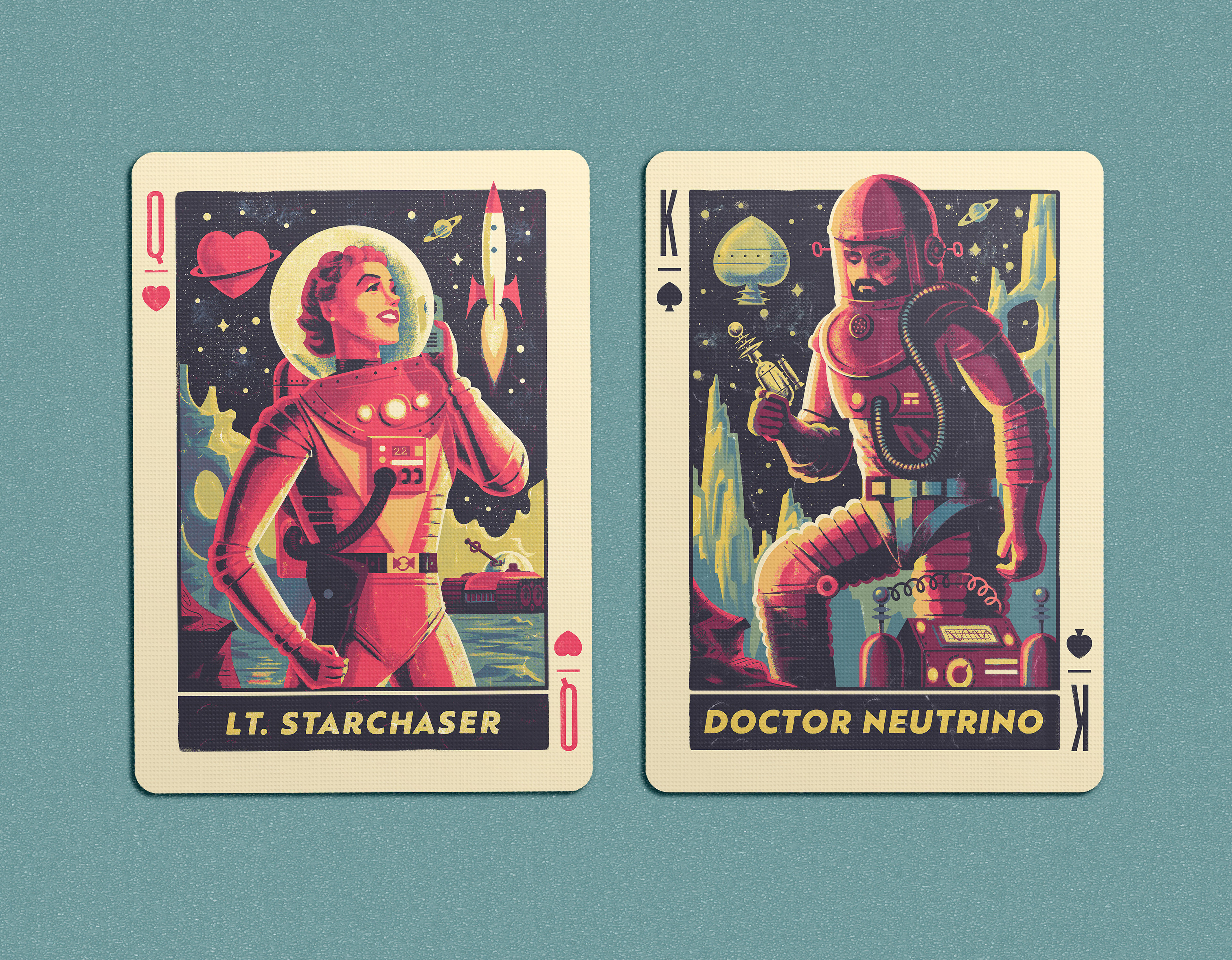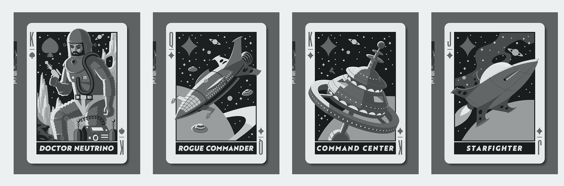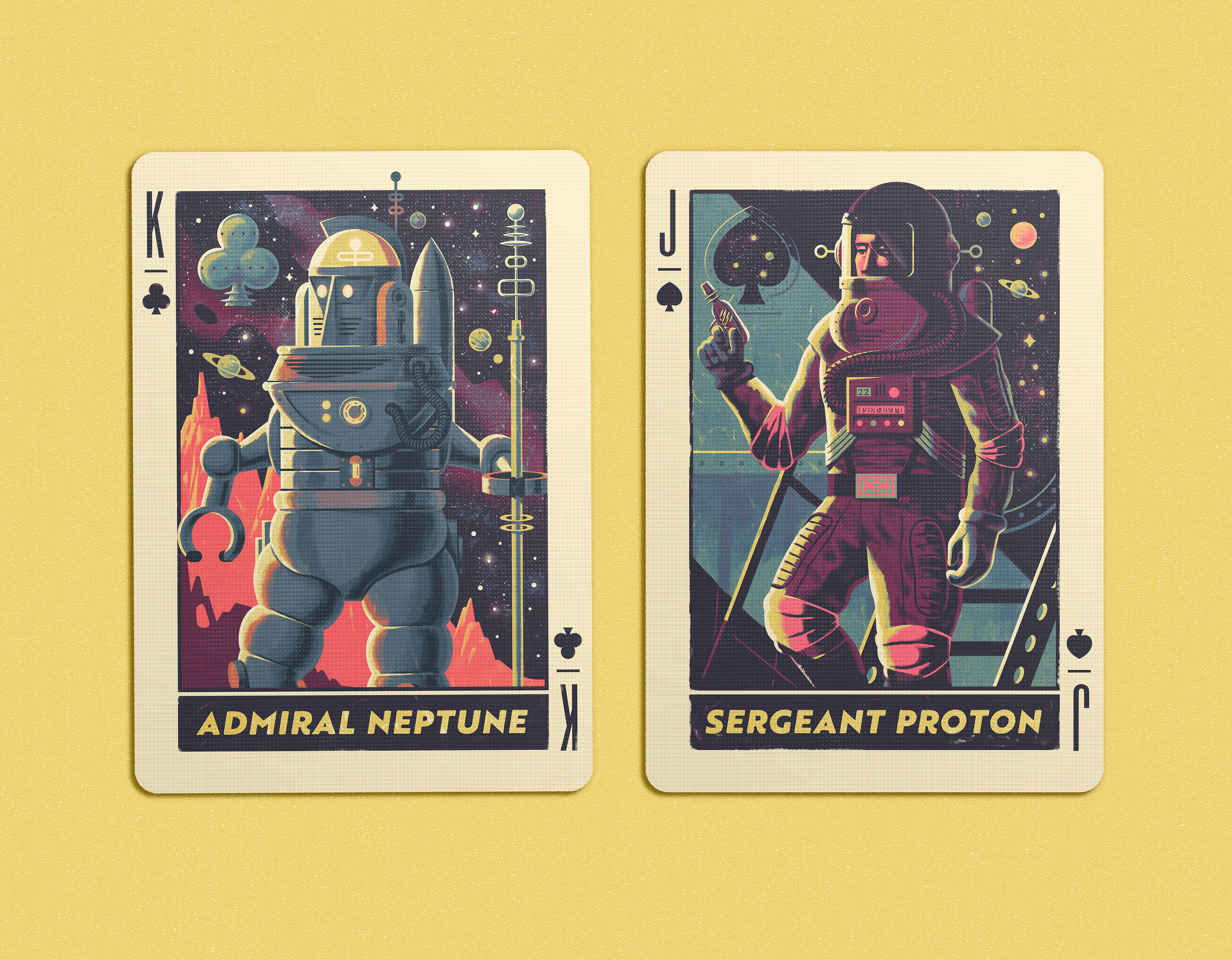 Initially, I designed the cards as mirrored, and in a much more slick, vintage-futuristic style. However, the more I worked with the cards, the more I realized my environments and characters were limited by the size. And as I continued to research vintage space toys and products, an idea arose to treat these more as trading cards, rather than traditional playing cards. In the end, each card was treated essentially as individual posters.