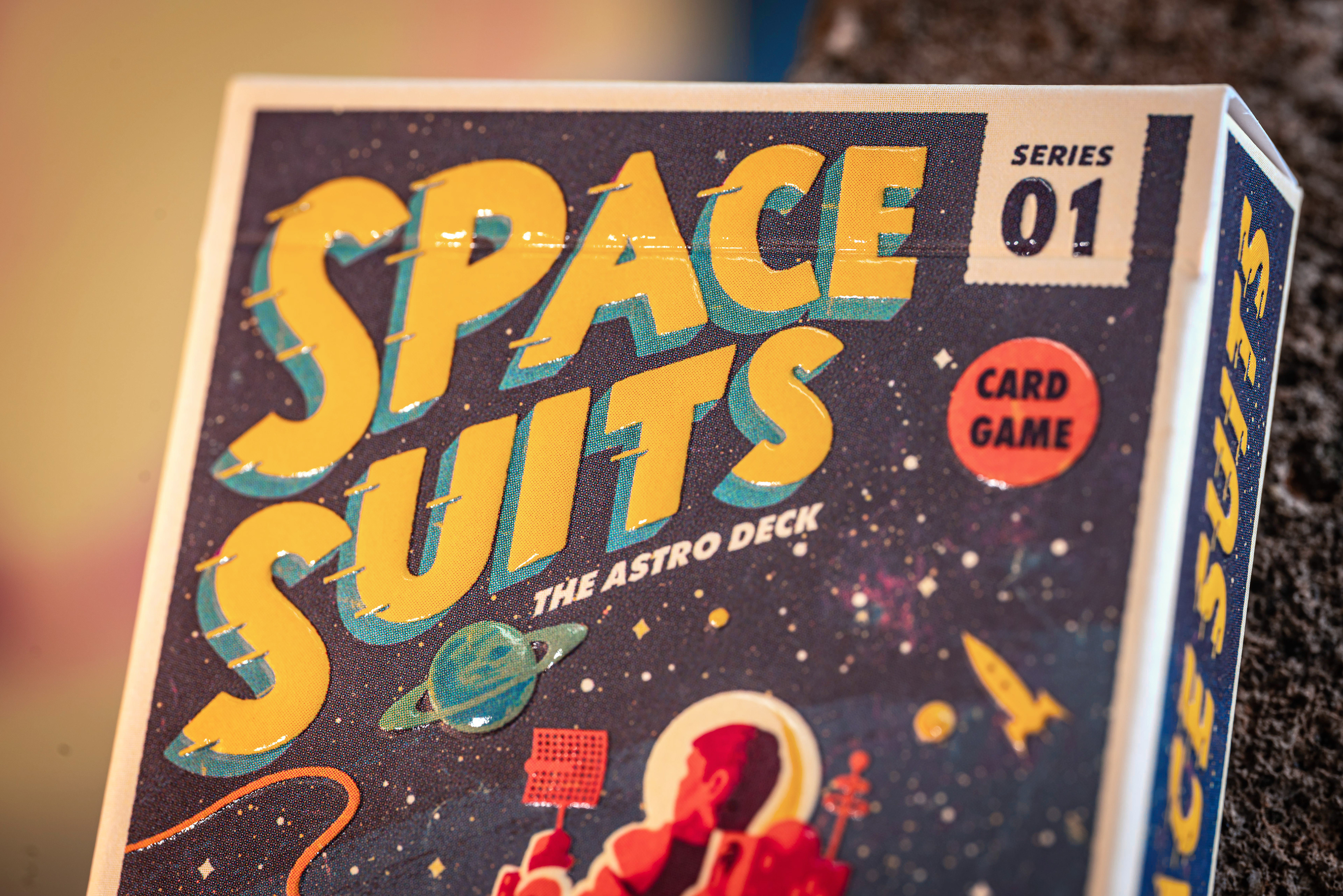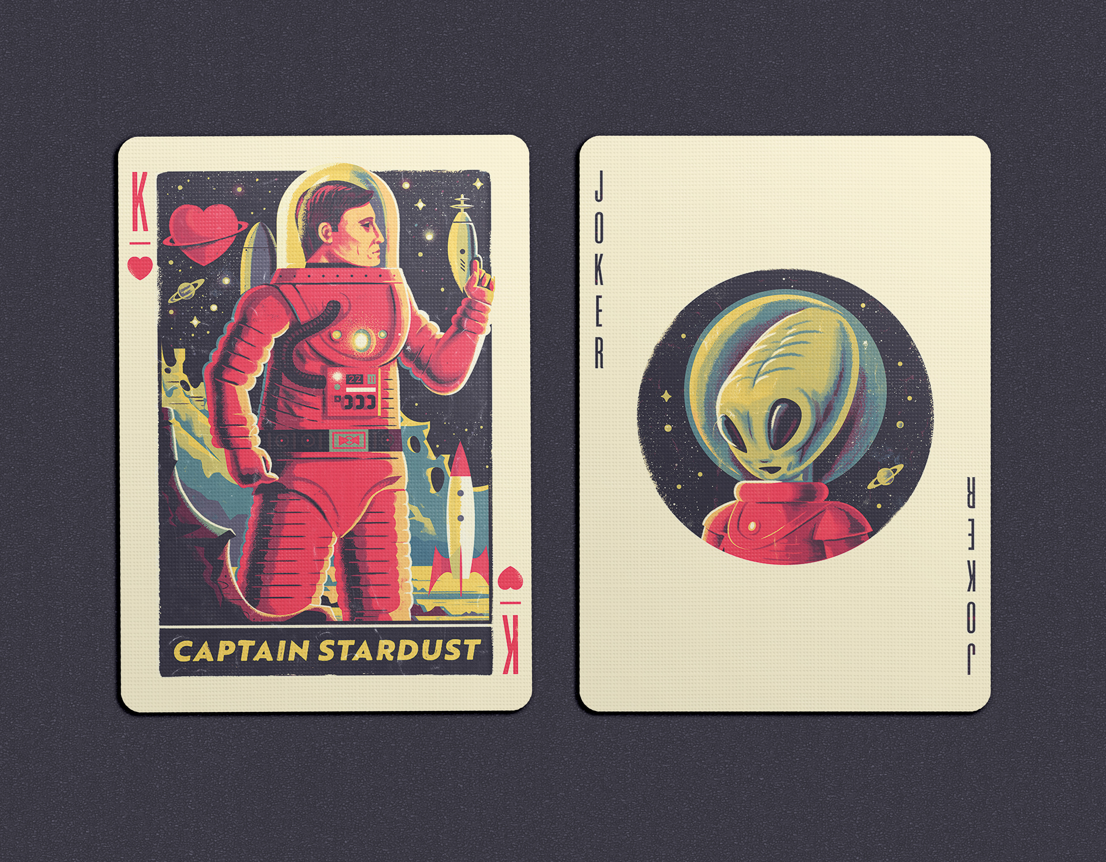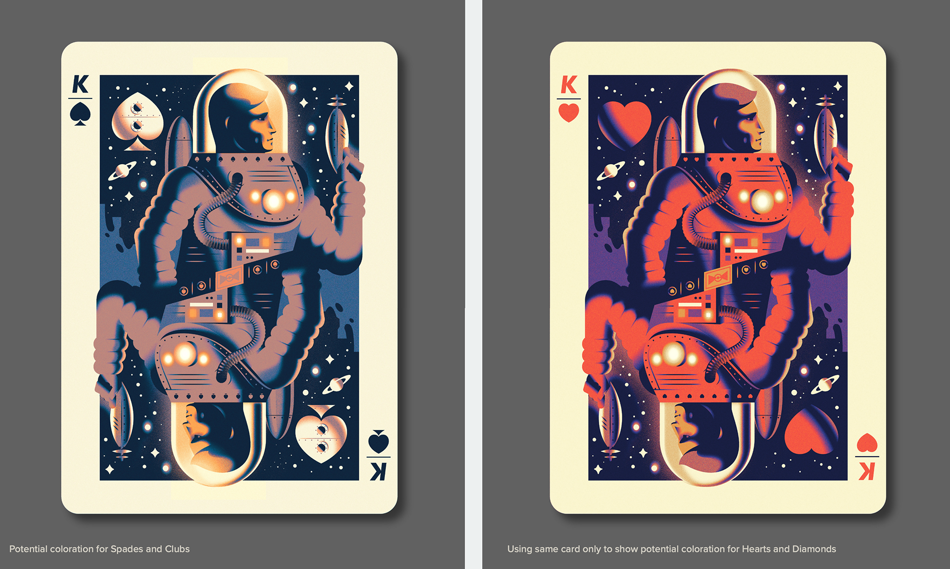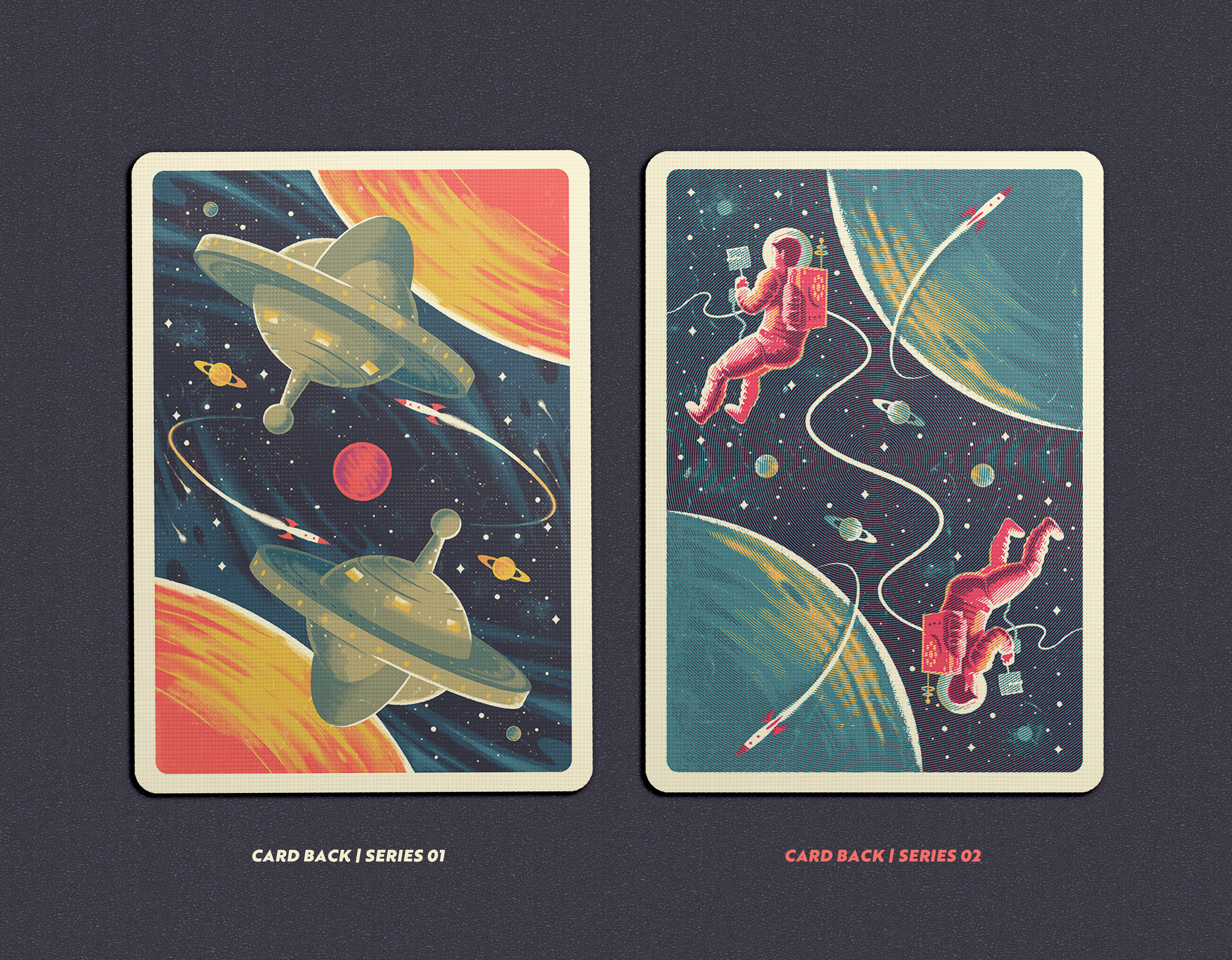 Initially, I designed the cards as mirrored, and in a much more slick, vintage-futuristic style. However, the more I worked with the cards, the more I realized my environments and characters were limited by the size. And as I continued to research vintage space toys and products, an idea arose to treat these more as trading cards, rather than traditional playing cards. In the end, each card was treated essentially as individual posters.