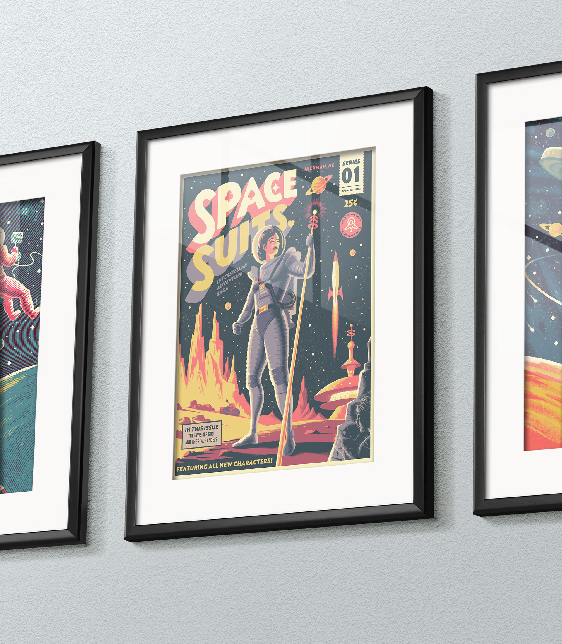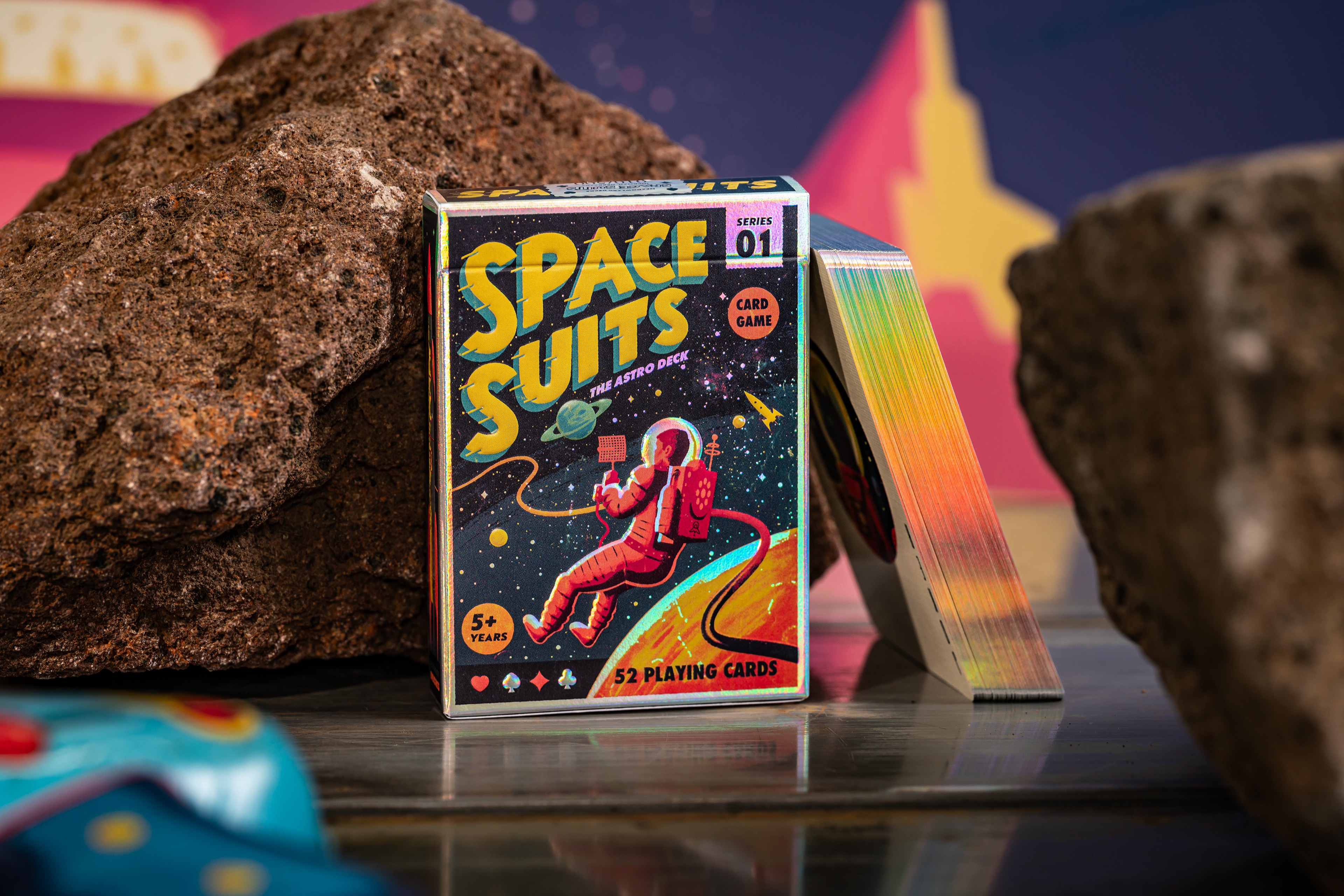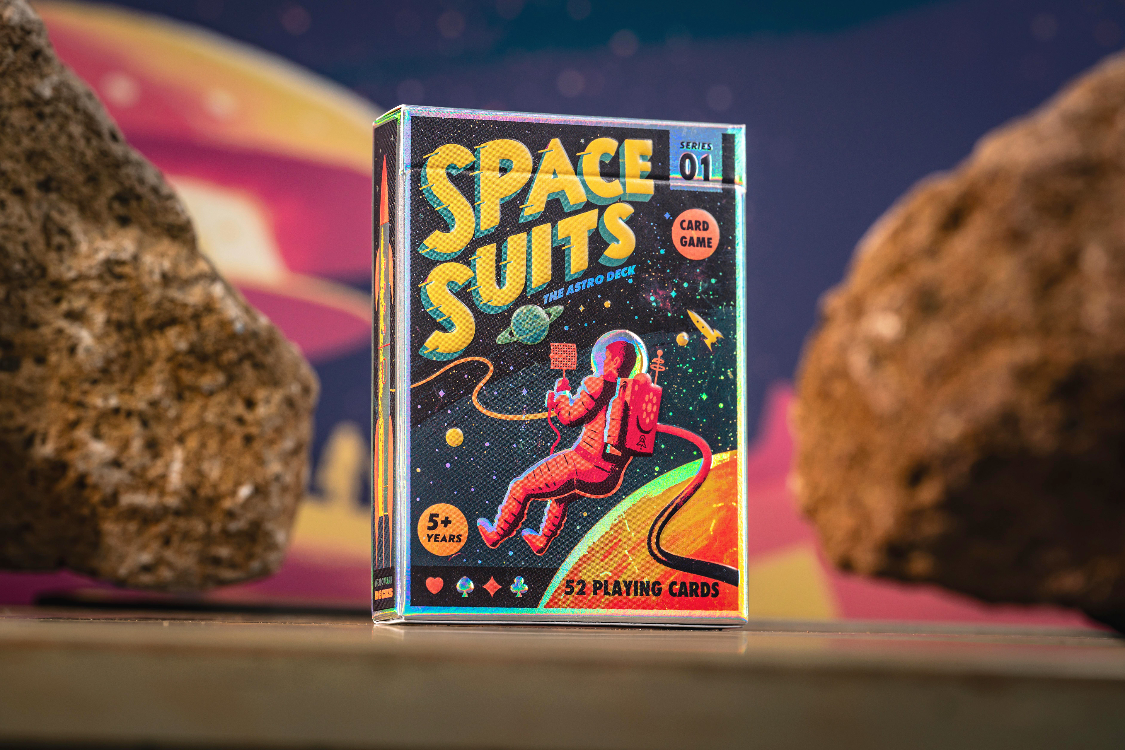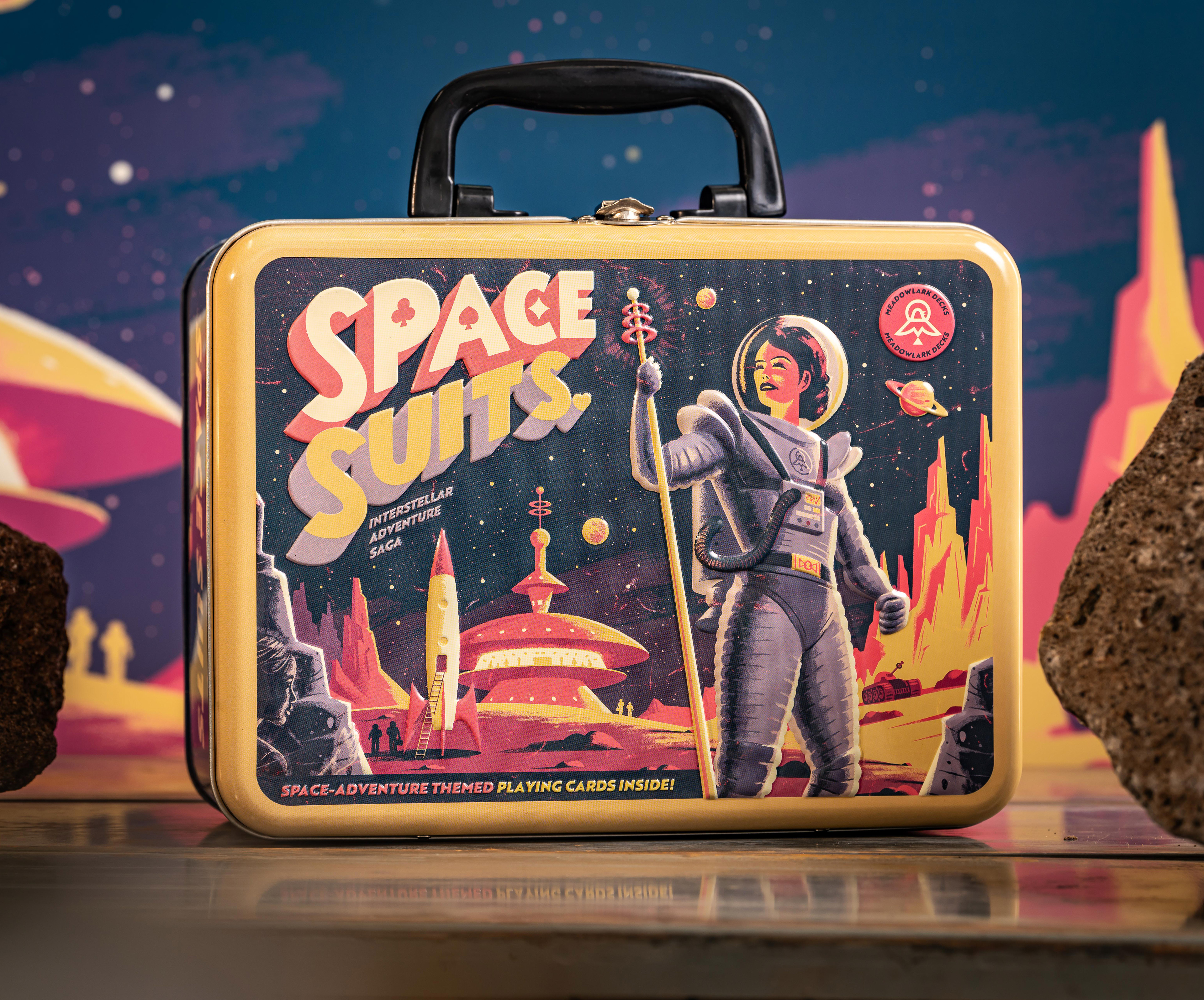 Initially, I designed the cards as mirrored, and in a much more slick, vintage-futuristic style. However, the more I worked with the cards, the more I realized my environments and characters were limited by the size. And as I continued to research vintage space toys and products, an idea arose to treat these more as trading cards, rather than traditional playing cards. In the end, each card was treated essentially as individual posters.
