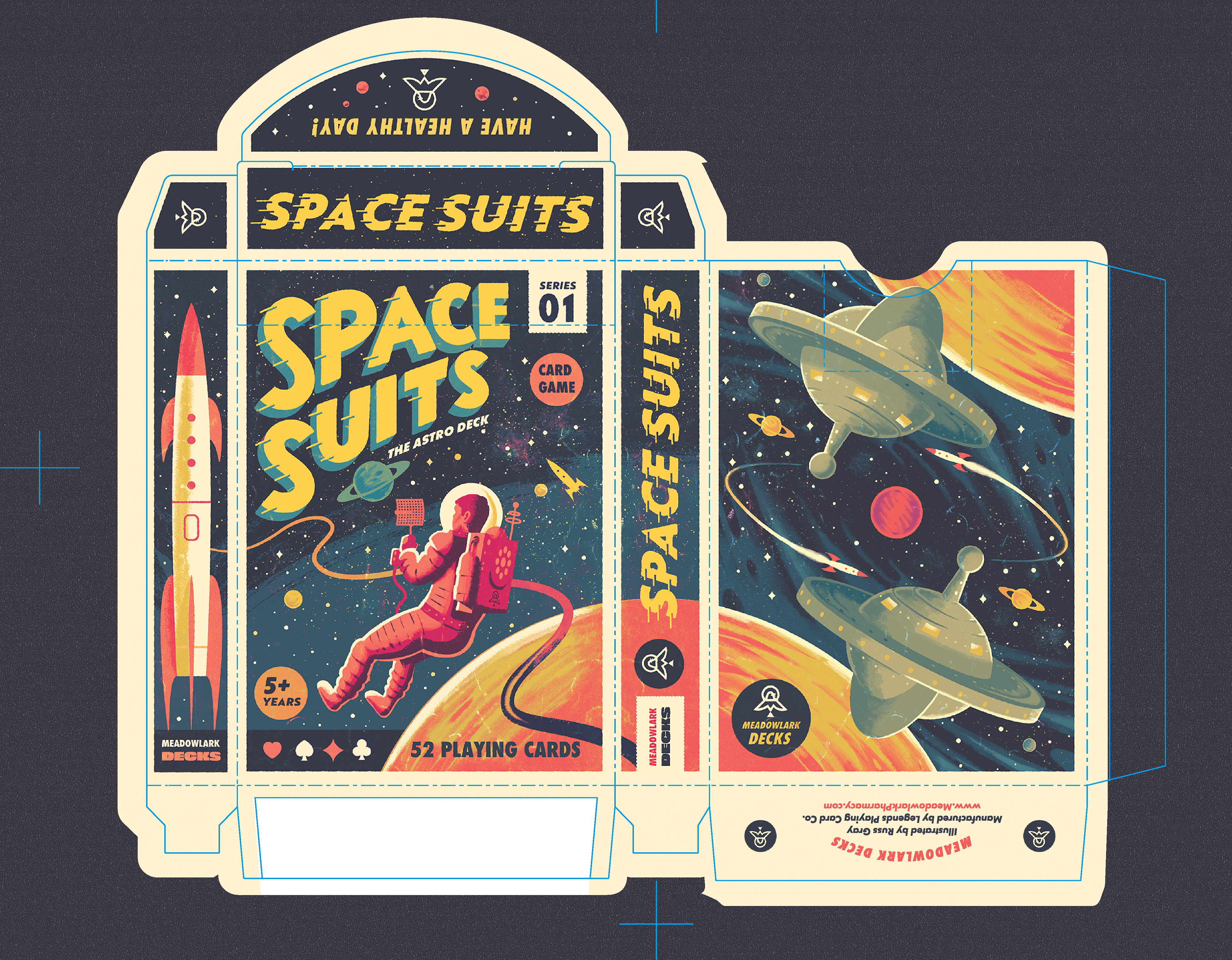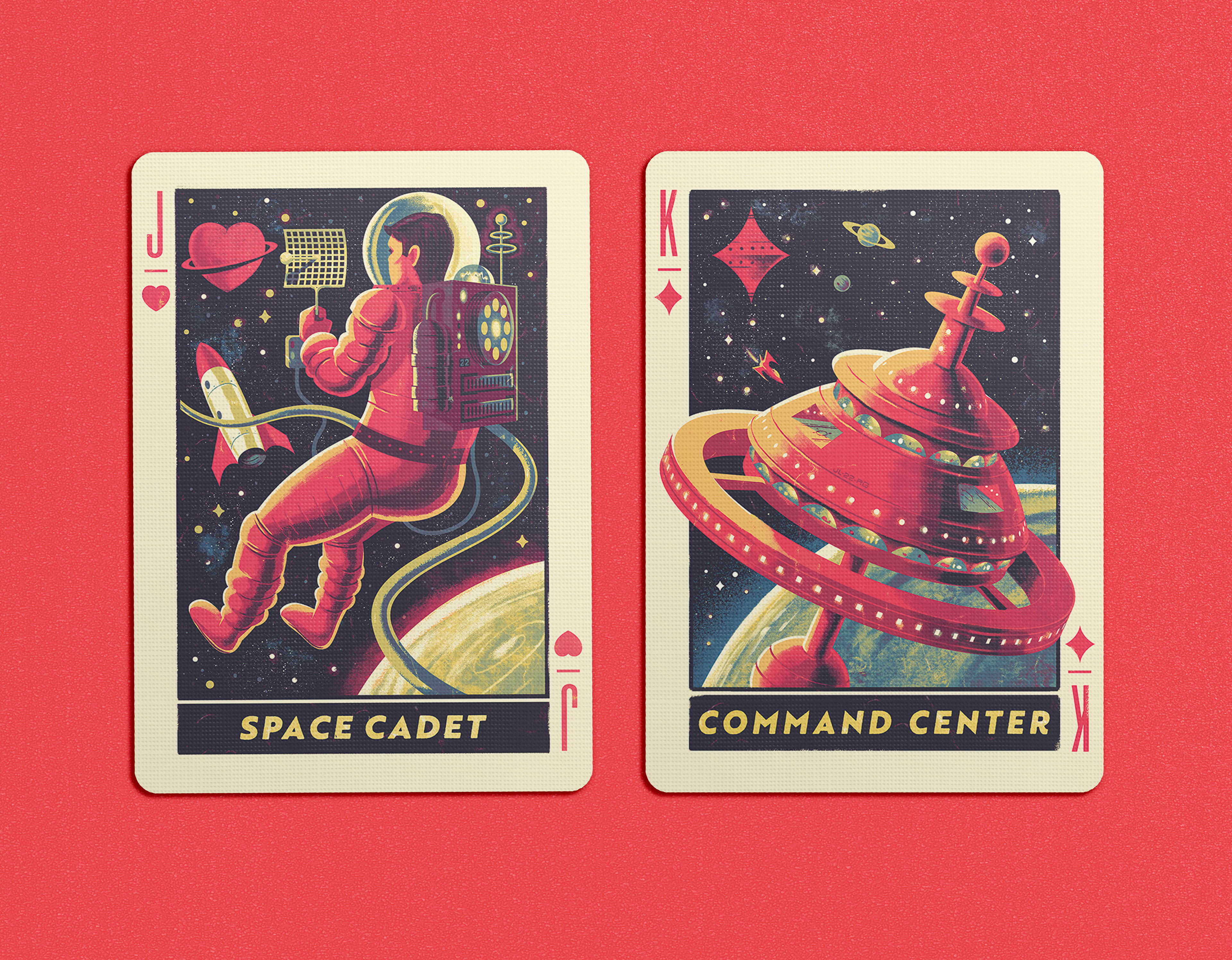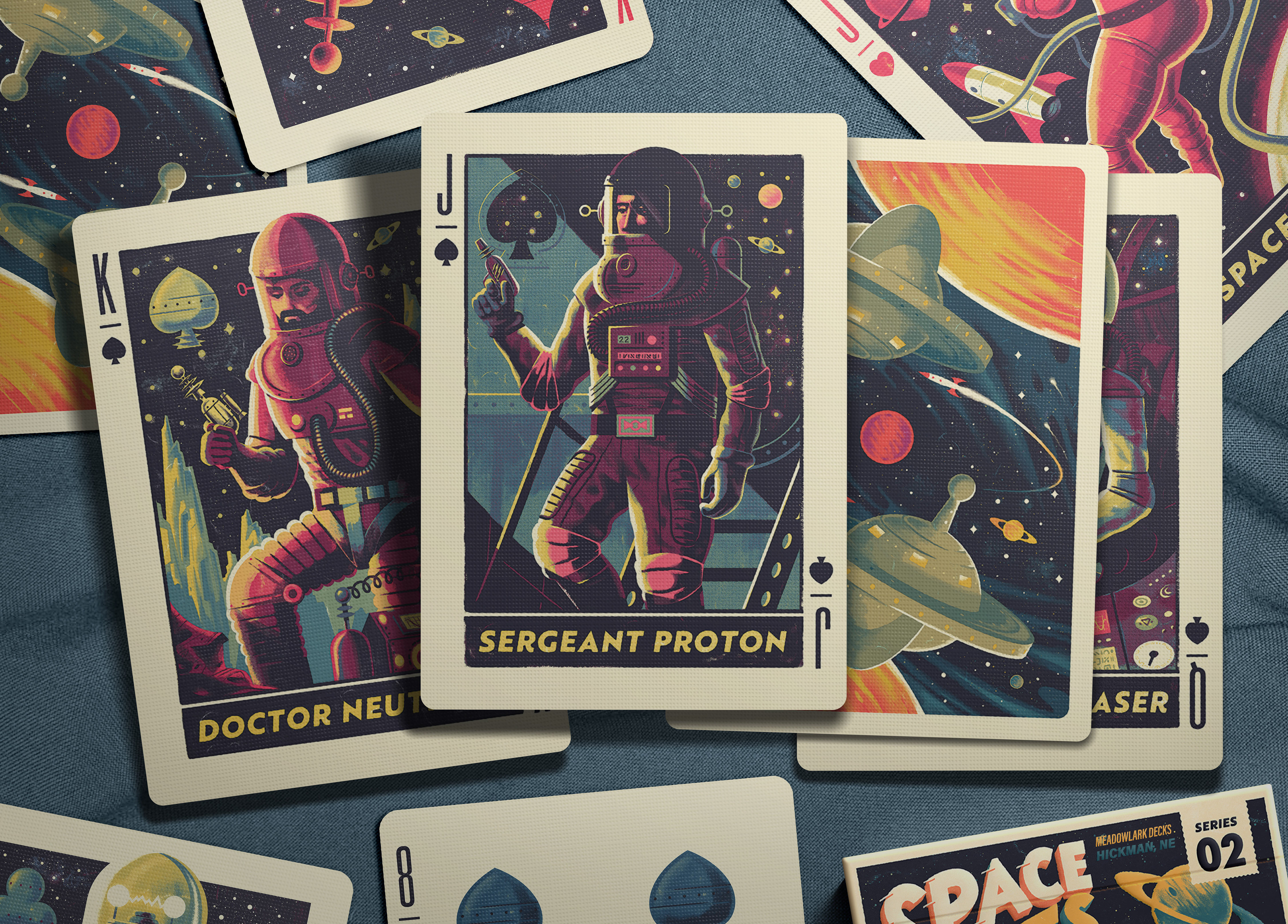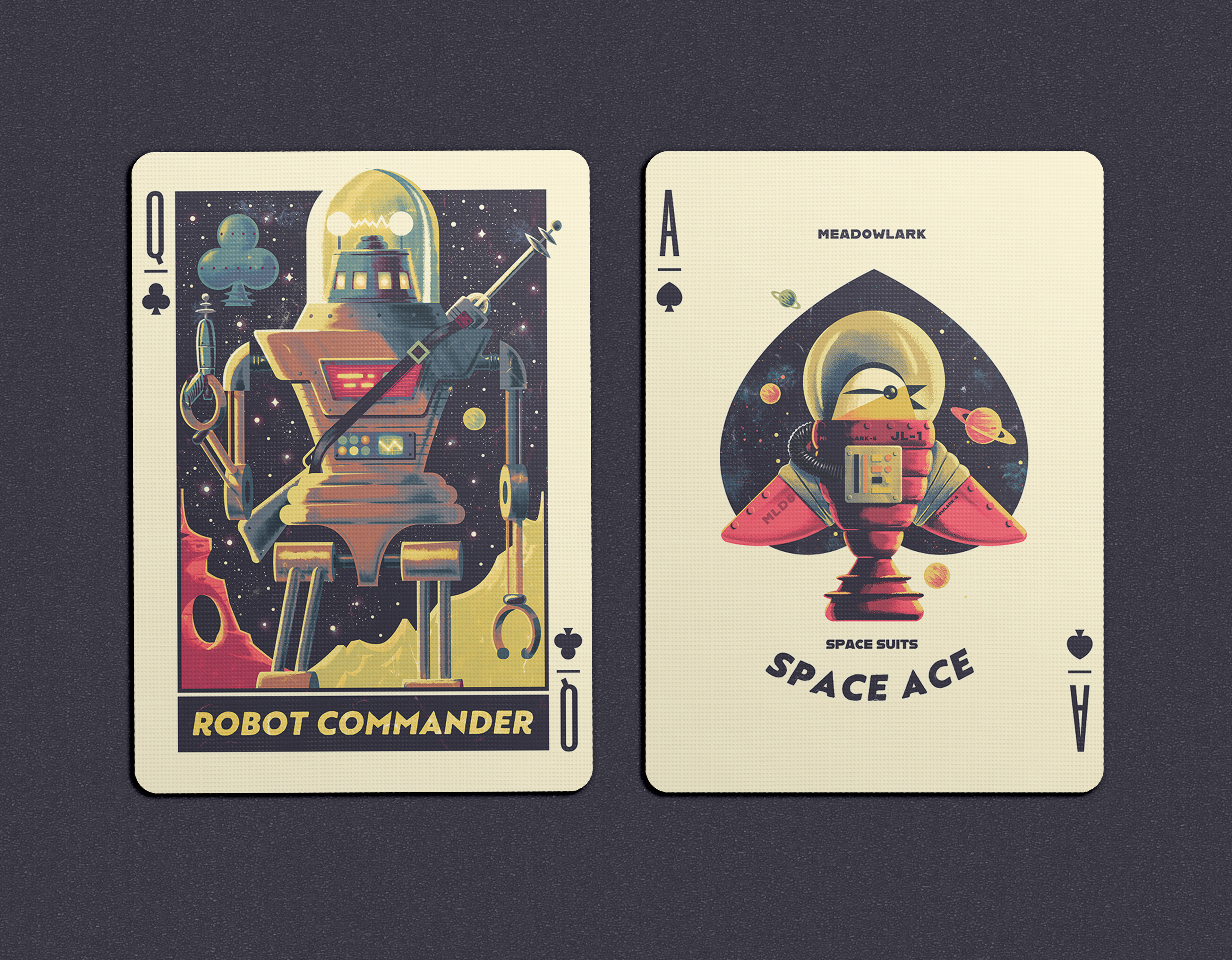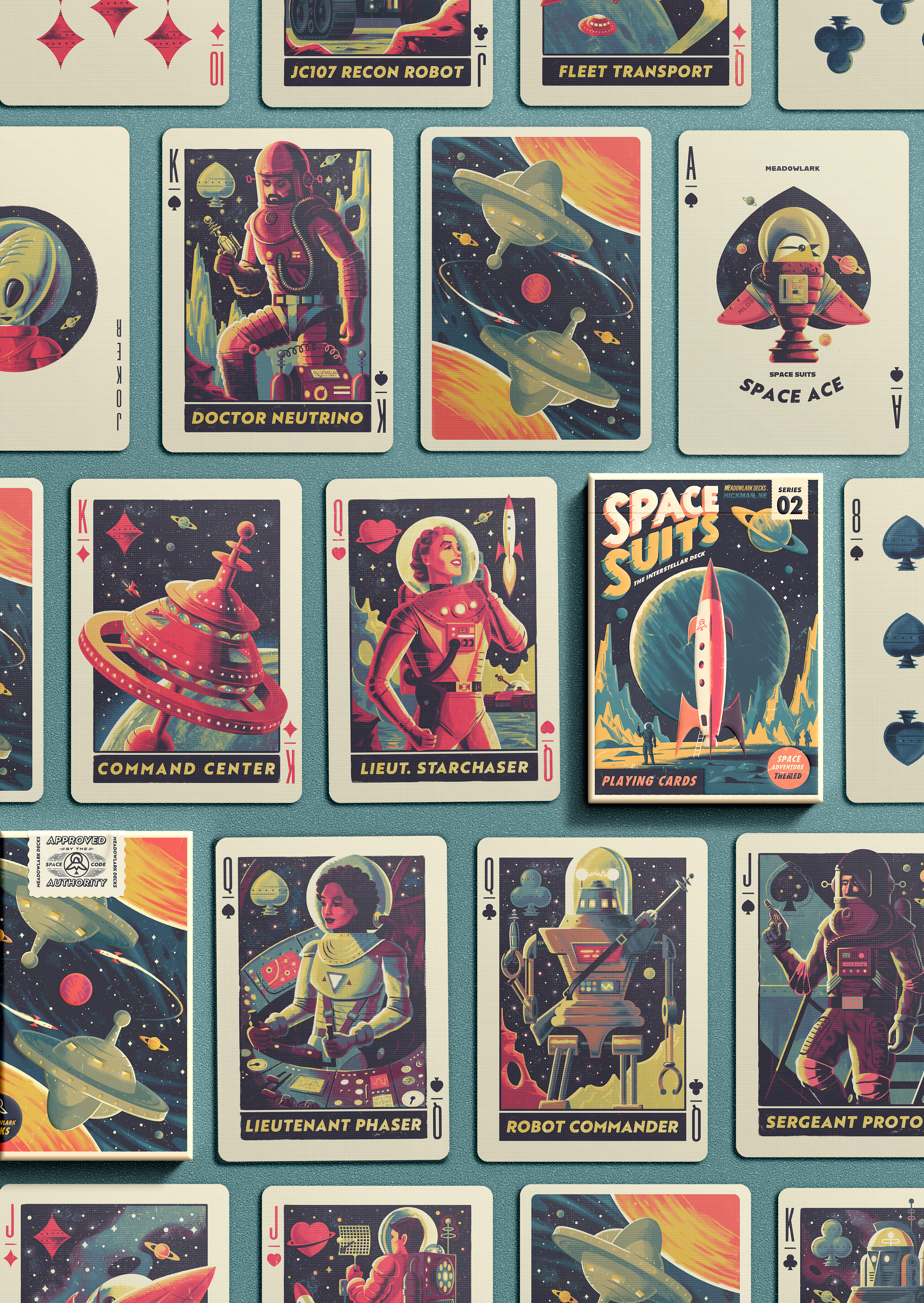This is the third time I've had the privilege to design a playing card deck for Jonathon Lamarque of Meadowlark Decks. For this series, he asked what I'd be interested in doing, and ... this was the result. The inspiration is vintage space toys and comics, and the idea was to build the deck around an imaginary comic book or TV series. I wanted to capture the whimsy and slightly naive depiction of early space-themed adventures. The drawings are intentionally imperfect, yet somewhat more life-like than I generally tend to illustrate. Studying mid-century space-themed toy and product packaging, the illustrations — though beautiful and evocative — were often done imprecisely, which for me, adds to their hand-made charm. I wanted to capture some of that in this series.