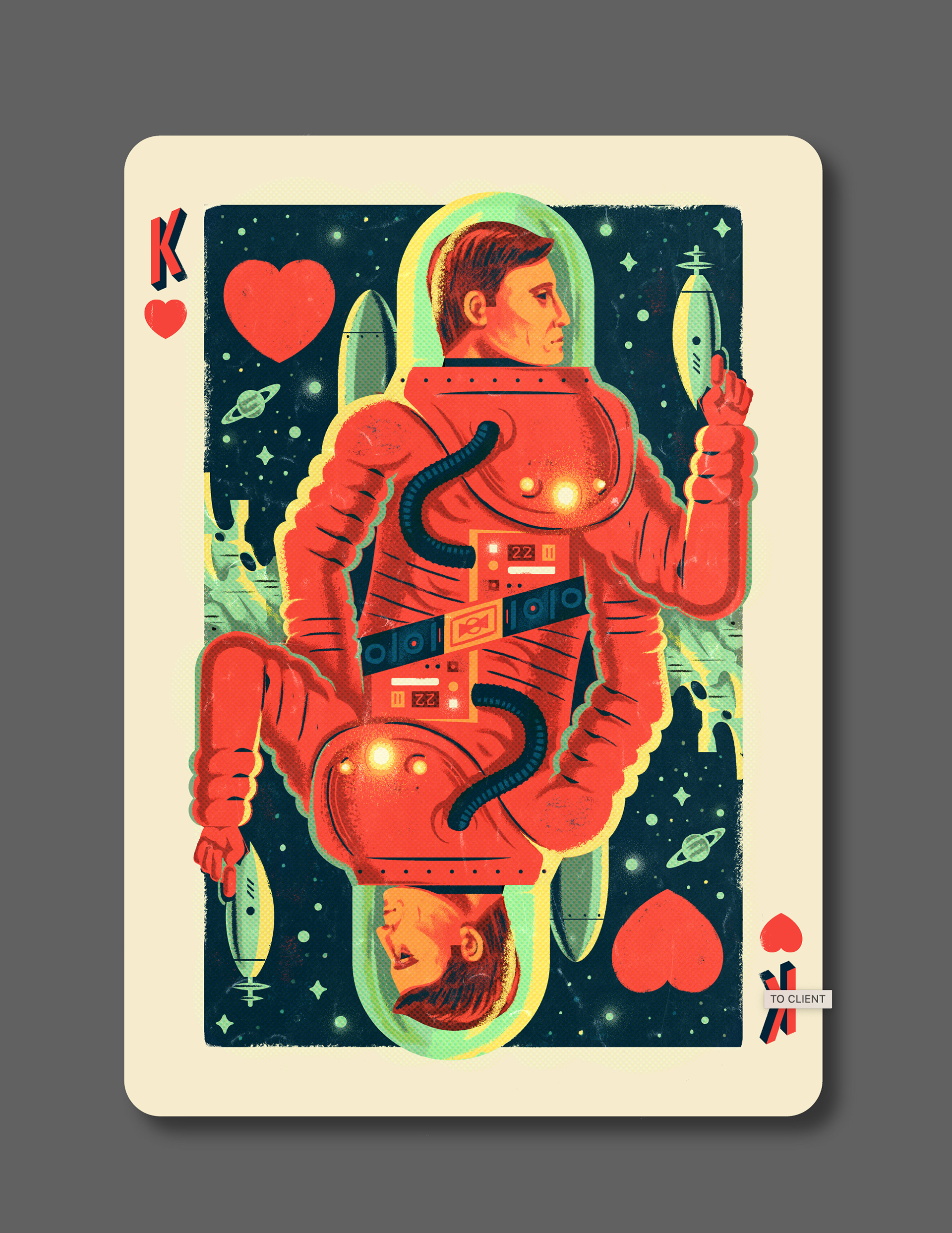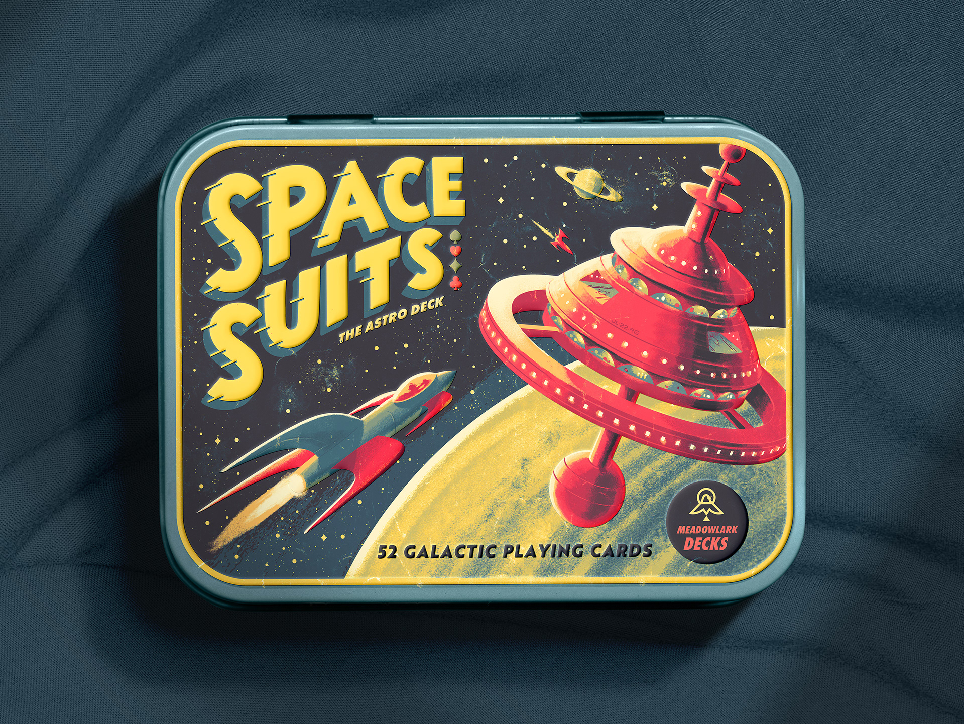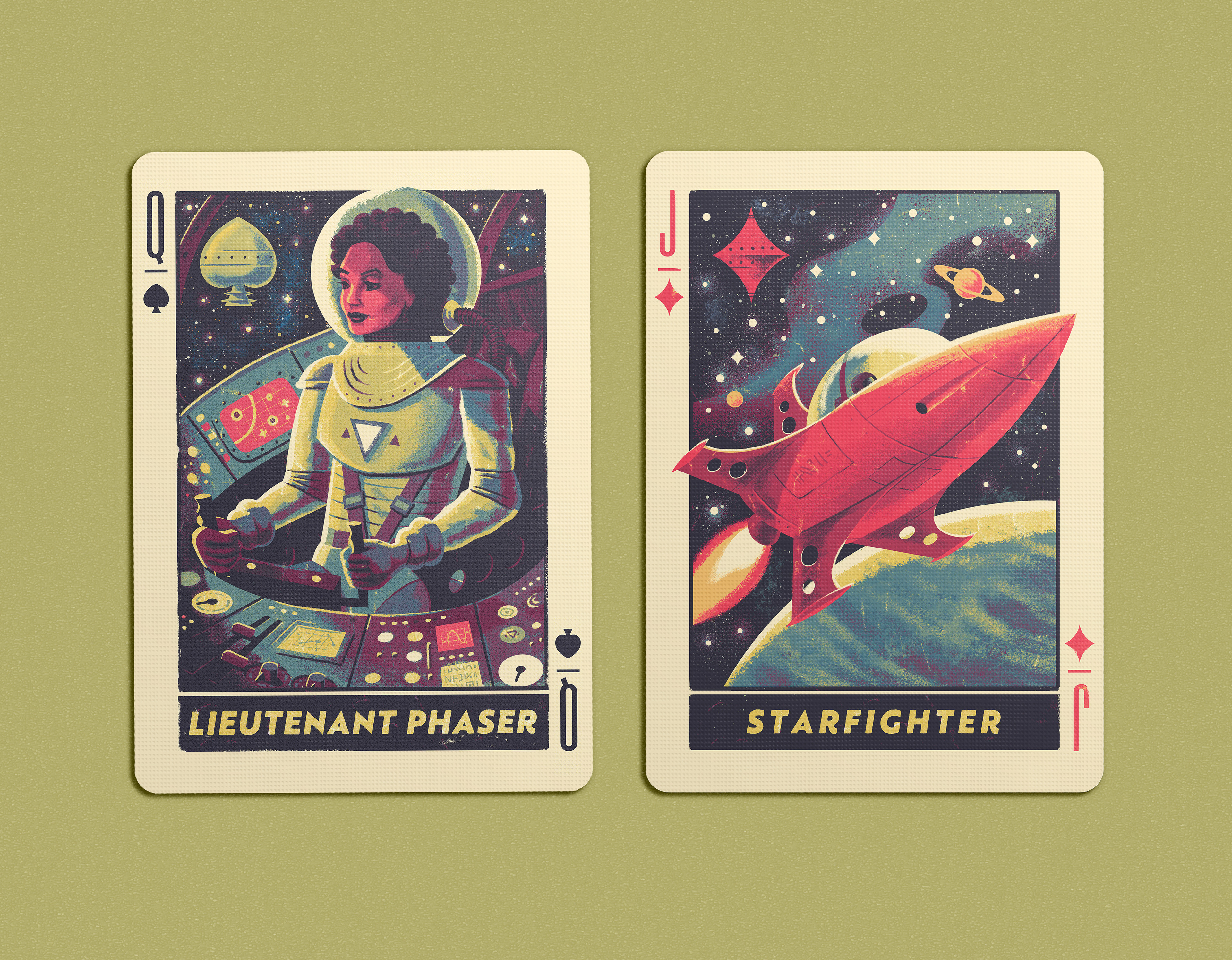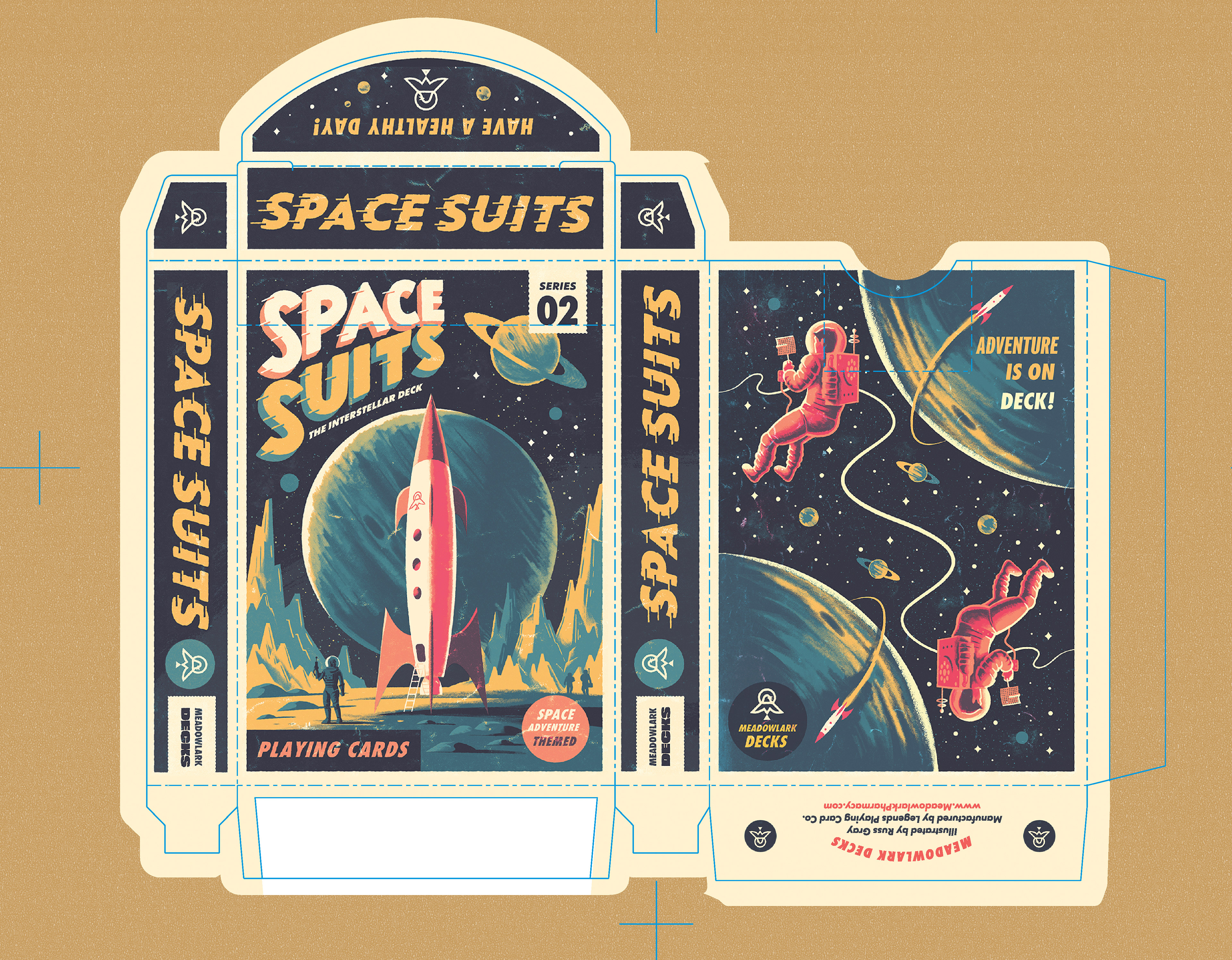 This is the third time I've had the privilege to design a playing card deck for Jonathon Lamarque of Meadowlark Decks. For this series, he asked what I'd be interested in doing, and ... this was the result. The inspiration is vintage space toys and comics, and the idea was to build the deck around an imaginary comic book or TV series. I wanted to capture the whimsy and slightly naive depiction of early space-themed adventures. The drawings are intentionally imperfect, yet somewhat more life-like than I generally tend to illustrate. Studying mid-century space-themed toy and product packaging, the illustrations — though beautiful and evocative — were often done imprecisely, which for me, adds to their hand-made charm. I wanted to capture some of that in this series.