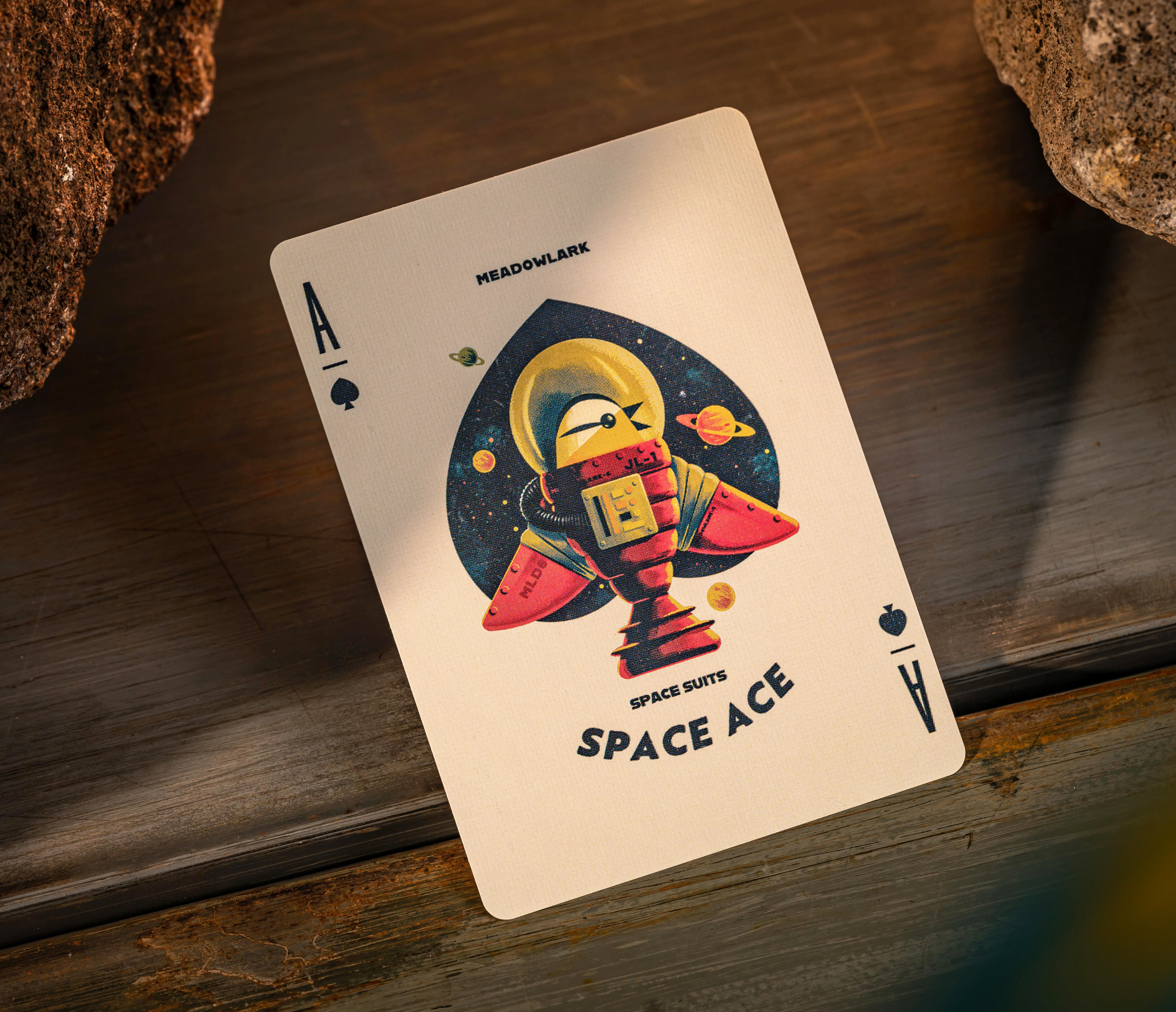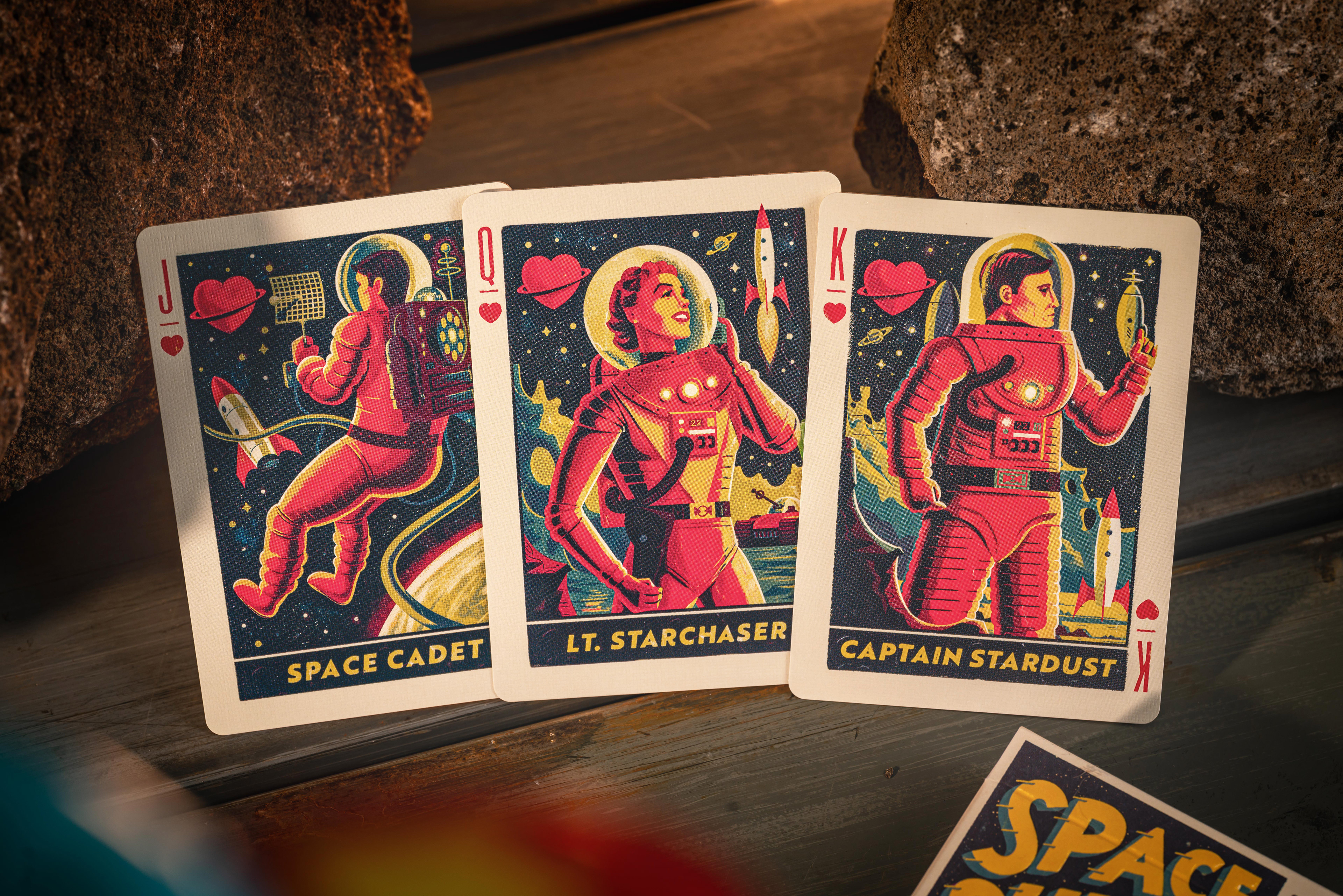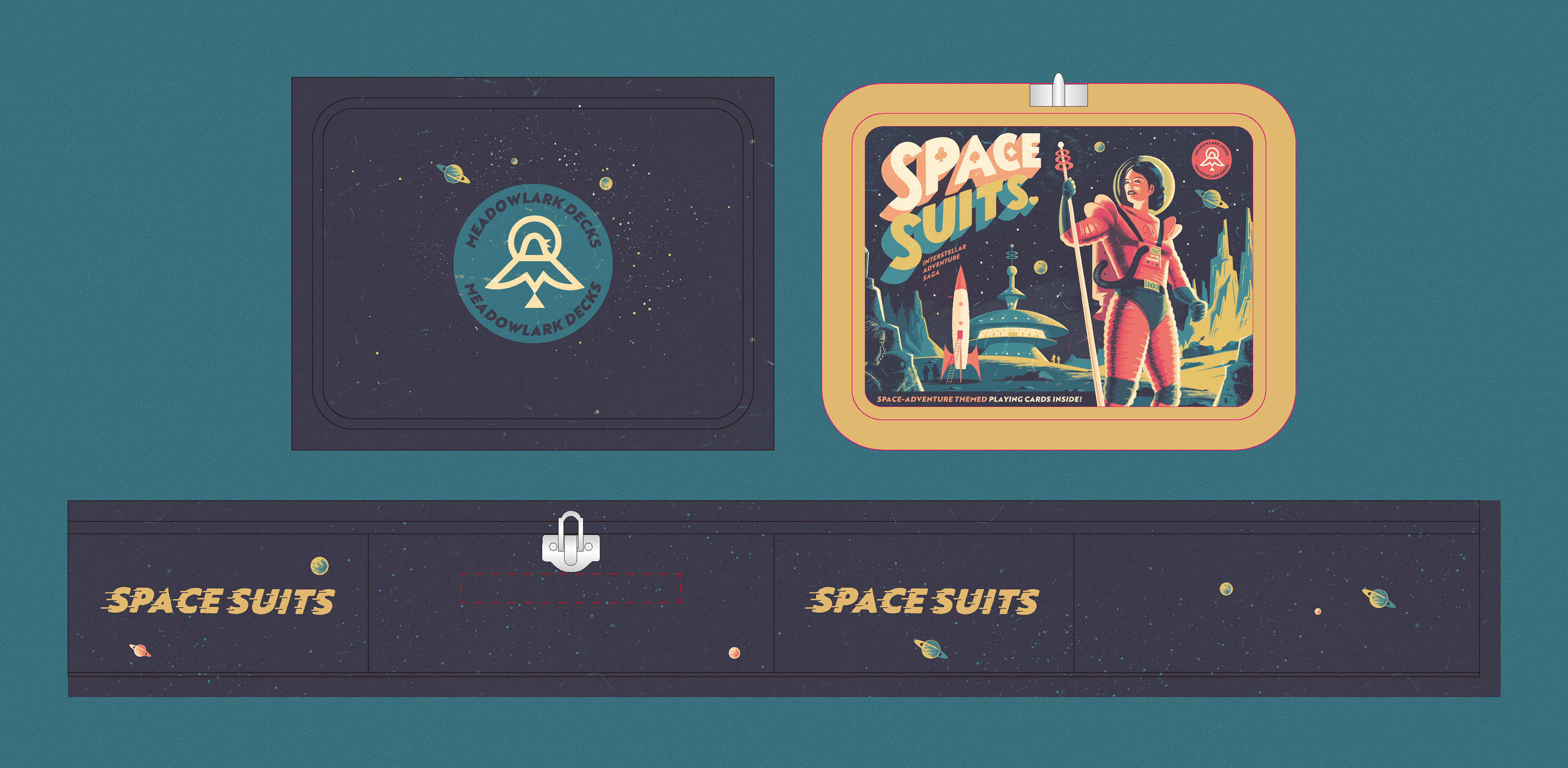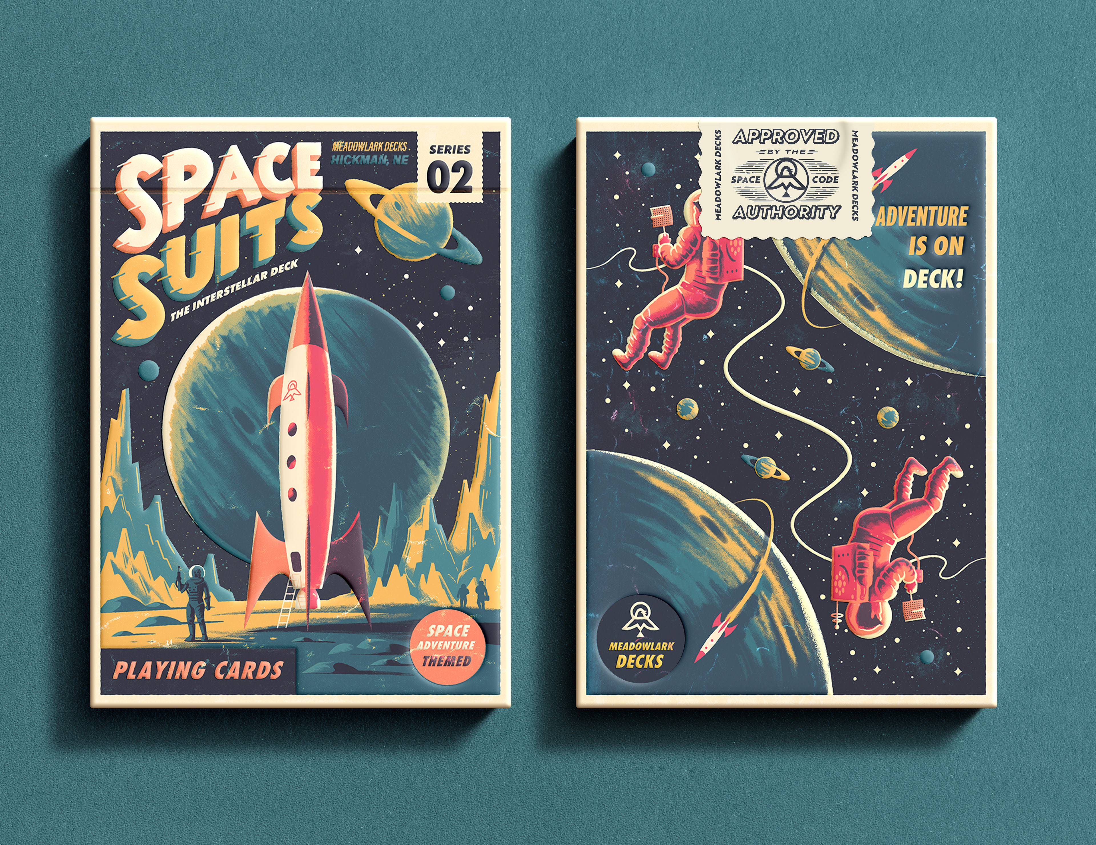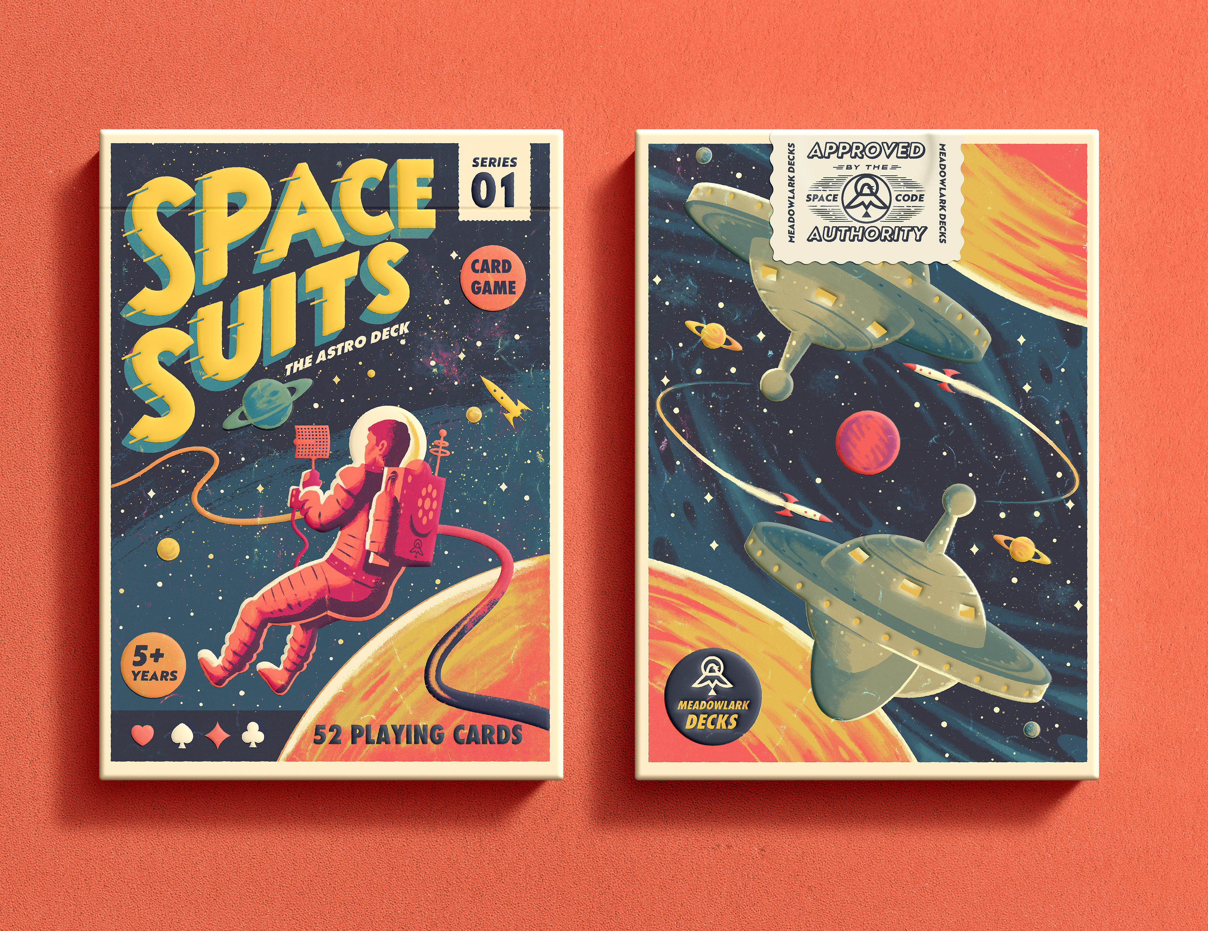 This is the third time I've had the privilege to design a playing card deck for Jonathon Lamarque of Meadowlark Decks. For this series, he asked what I'd be interested in doing, and ... this was the result. The inspiration is vintage space toys and comics, and the idea was to build the deck around an imaginary comic book or TV series. I wanted to capture the whimsy and slightly naive depiction of early space-themed adventures. The drawings are intentionally imperfect, yet somewhat more life-like than I generally tend to illustrate. Studying mid-century space-themed toy and product packaging, the illustrations — though beautiful and evocative — were often done imprecisely, which for me, adds to their hand-made charm. I wanted to capture some of that in this series.