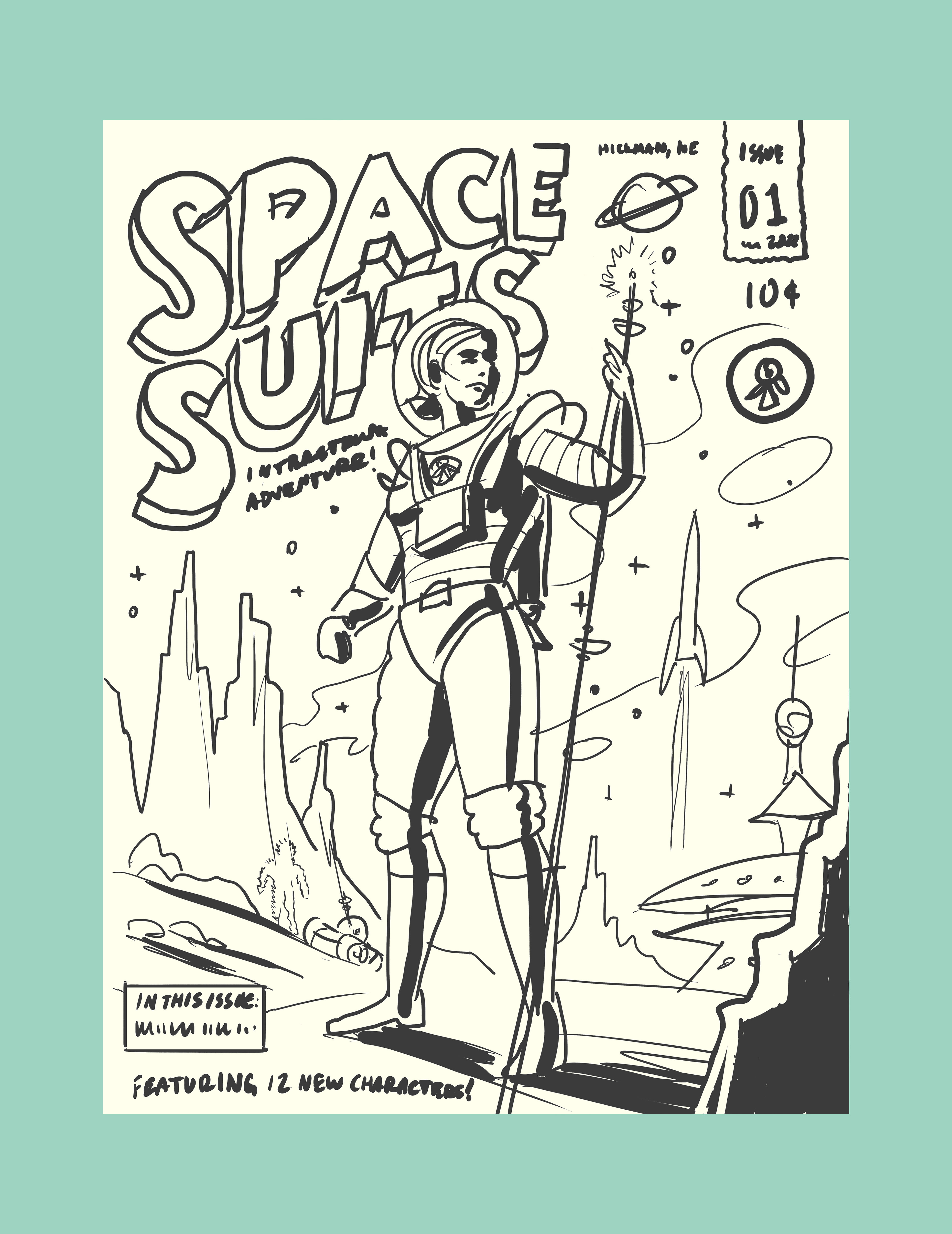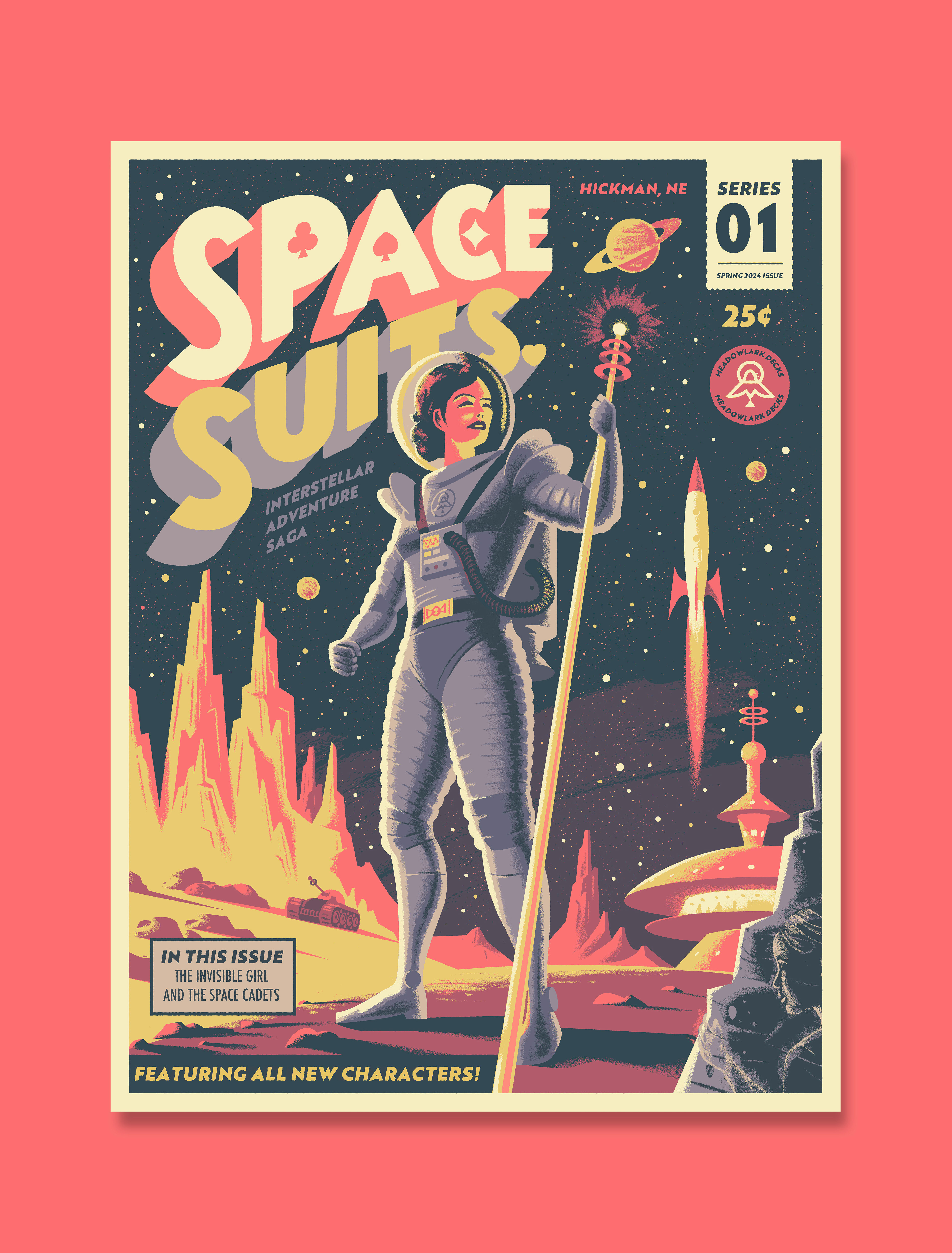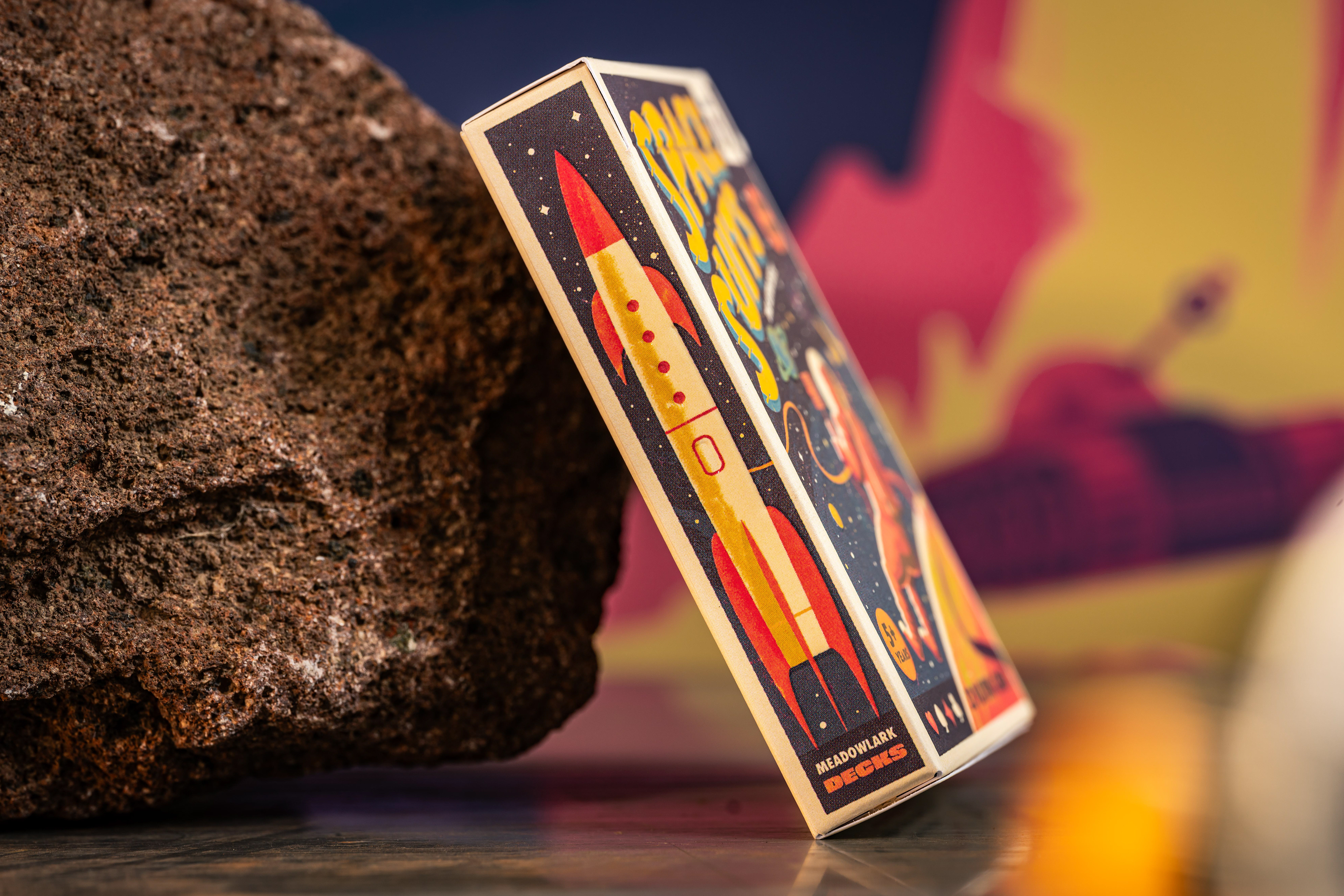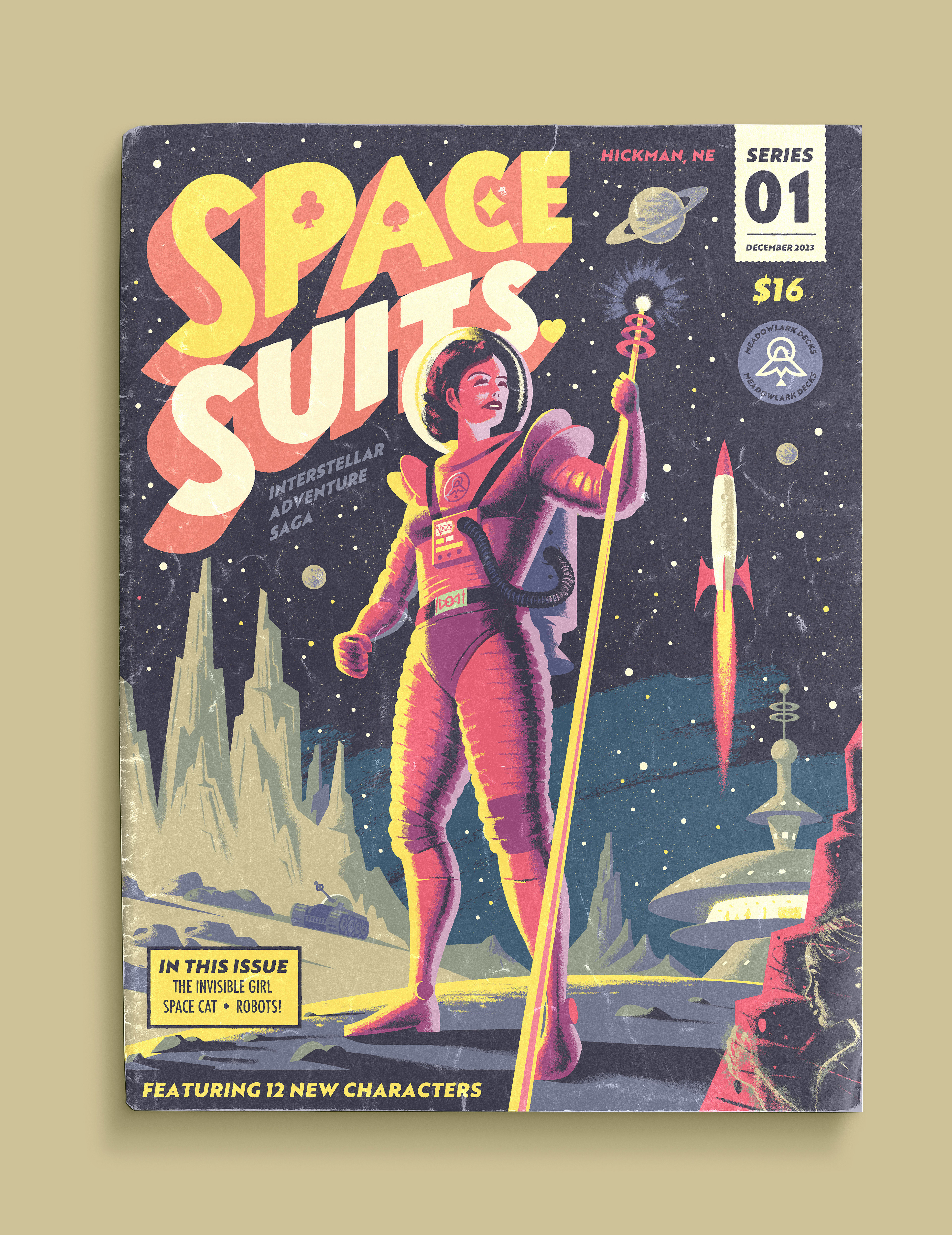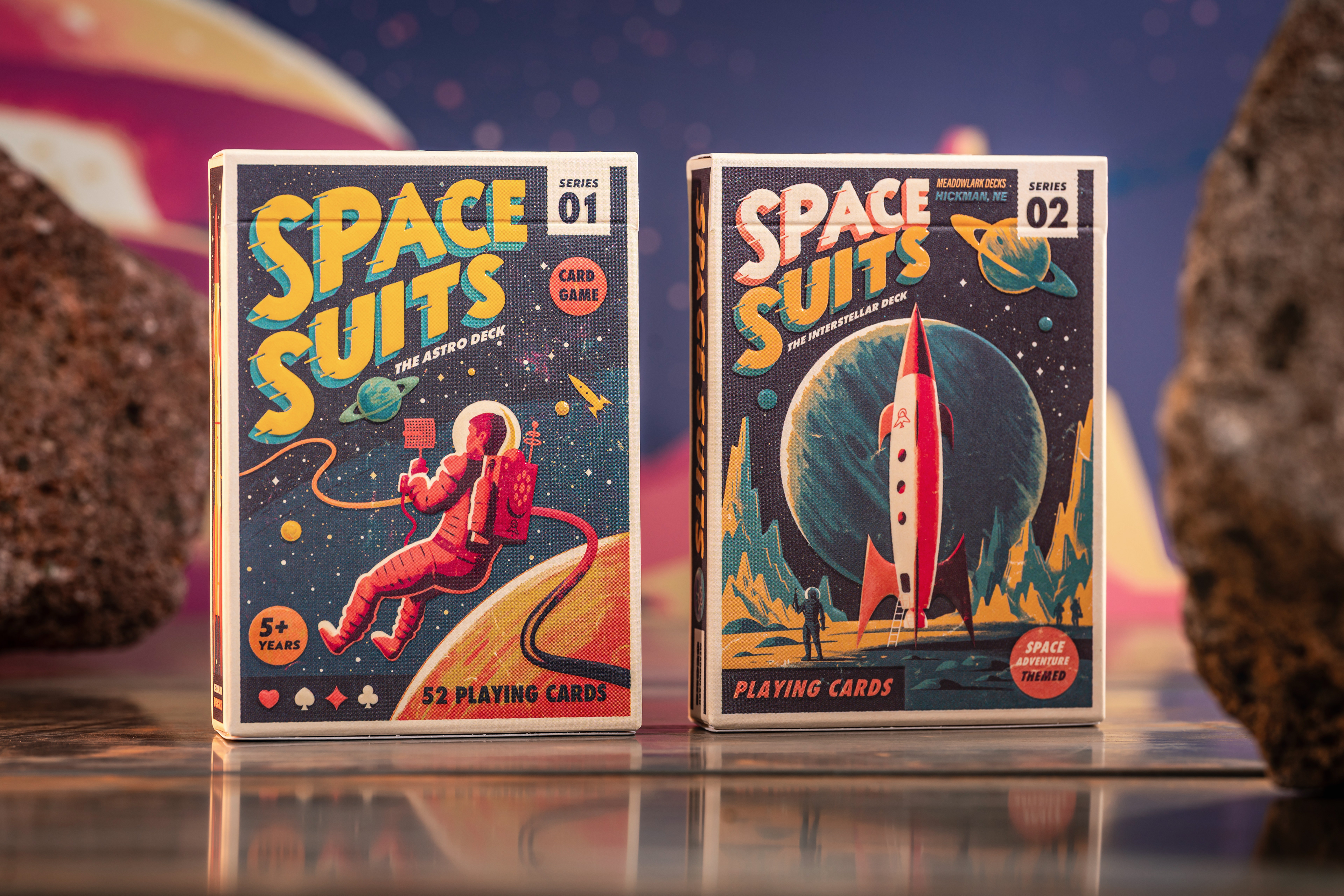 This is the third time I've had the privilege to design a playing card deck for Jonathon Lamarque of Meadowlark Decks. For this series, he asked what I'd be interested in doing, and ... this was the result. The inspiration is vintage space toys and comics, and the idea was to build the deck around an imaginary comic book or TV series. I wanted to capture the whimsy and slightly naive depiction of early space-themed adventures. The drawings are intentionally imperfect, yet somewhat more life-like than I generally tend to illustrate. Studying mid-century space-themed toy and product packaging, the illustrations — though beautiful and evocative — were often done imprecisely, which for me, adds to their hand-made charm. I wanted to capture some of that in this series.