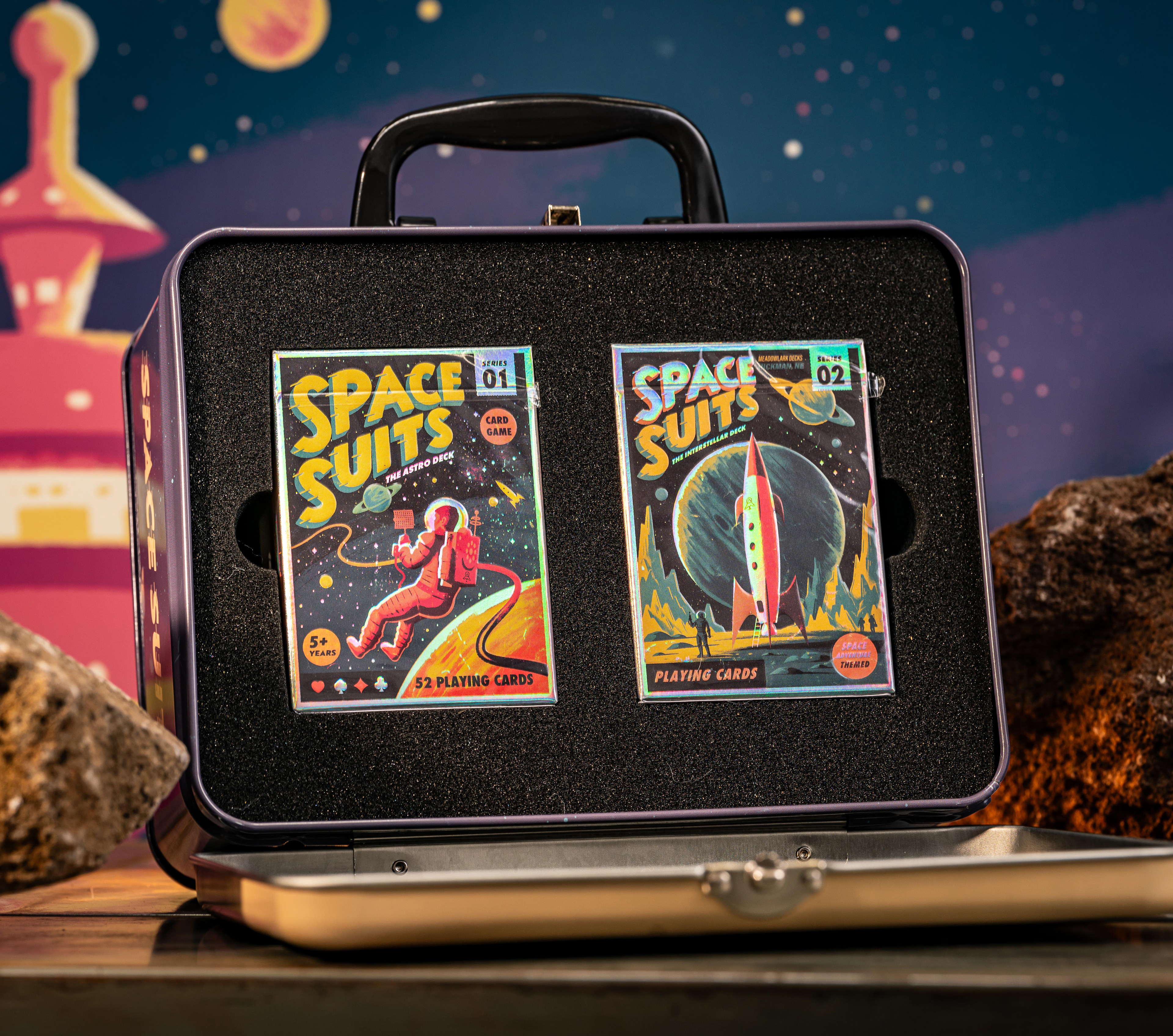 The tuckbox packaging mimics an old mid-century space comic book cover, hinting at the excitement contained within. The interior decks are identical (budget simply wouldn't allow for 12 more characters!) but the the tucks for Series 01 and Series 02 are unique. In addition, holo-foil versions are offered for each as well. (See photos at end of this scroll).