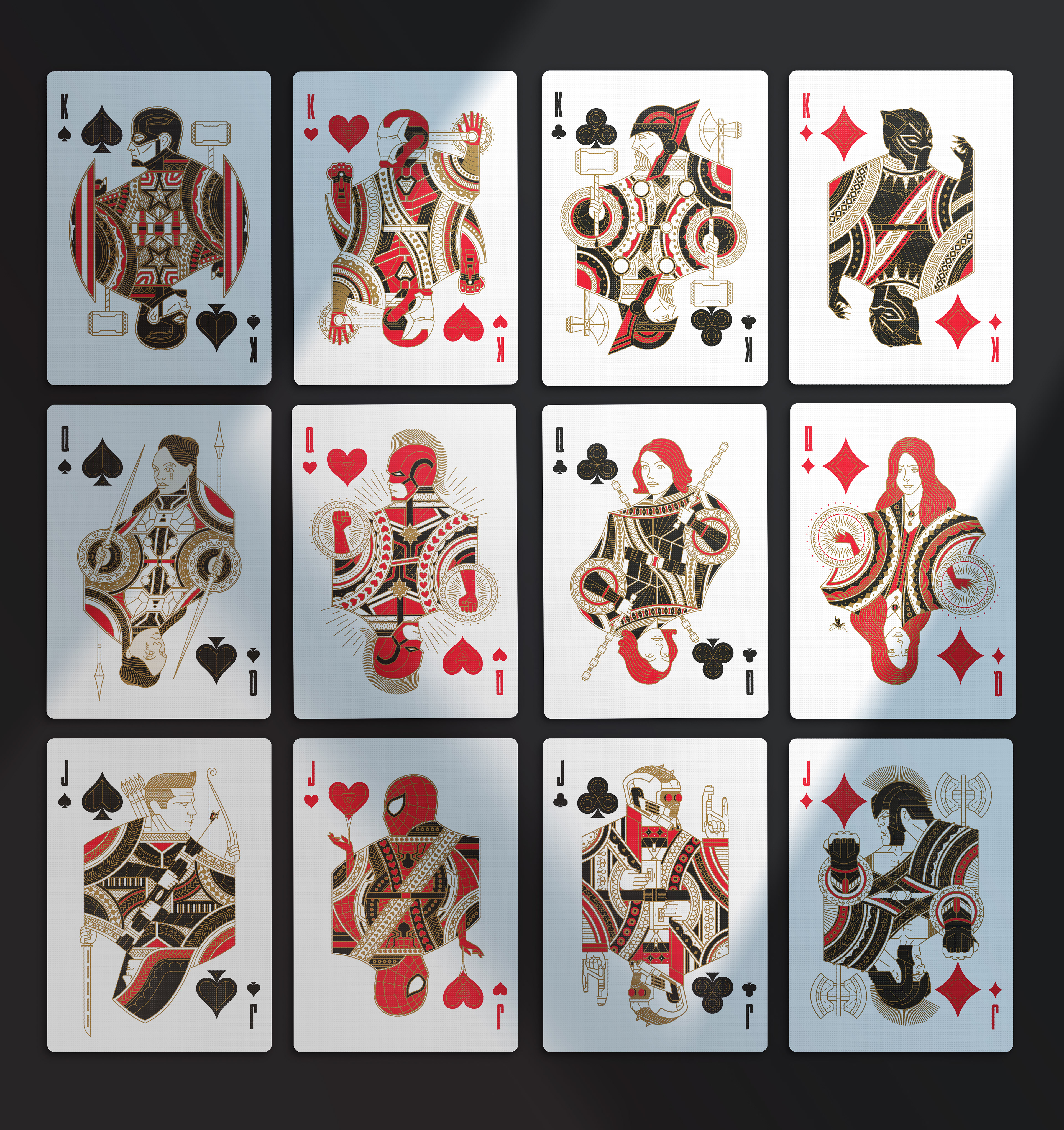 In 2020 I had the opportunity through my friend Ty Mattson (mattsoncreative.com) to work on a card deck for Theory11 and Avengers. This deck was a fun one — though, I will admit right here that I had never seen all the Avengers movies or read the comics. I had a lot of catching up to do, and it was a blast creating all the imagery and iconography. Photos are courtesy of Theory11, along with some Photoshop renders mixed in that I created myself.