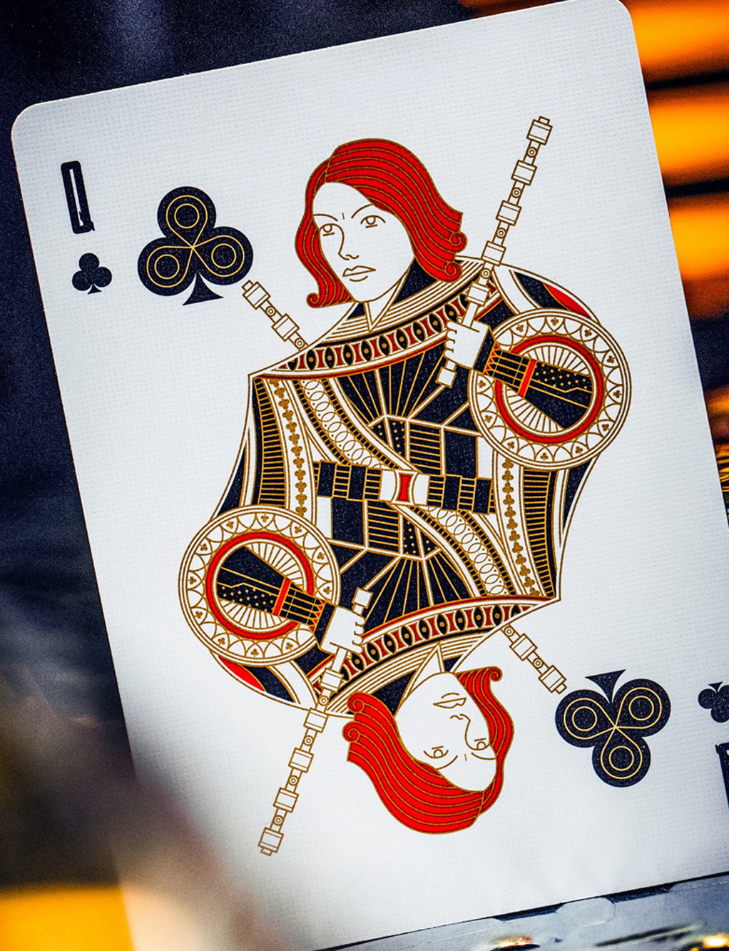 We made suggestions for the character line-up, and in the end Marvel had the final call (with a few changes). Like the James Bond deck, these were not necessarily intended to be literal likenesses of the actors, though the cards are clearly heavily influenced by the film versions of the characters. Ty Mattson and I had fun collaborating on a couple of them, especially Thor, which set the tone for the rest of the court cards.