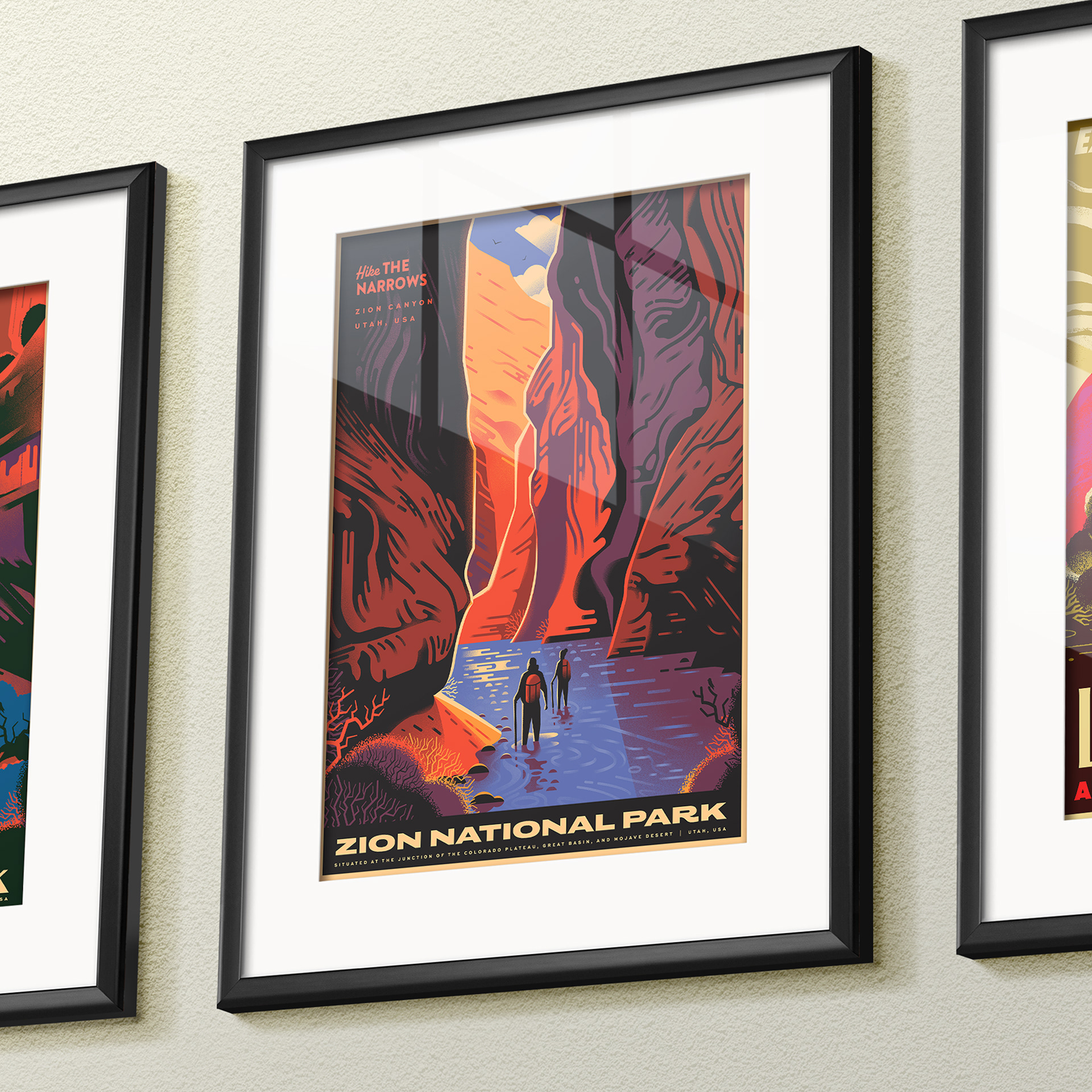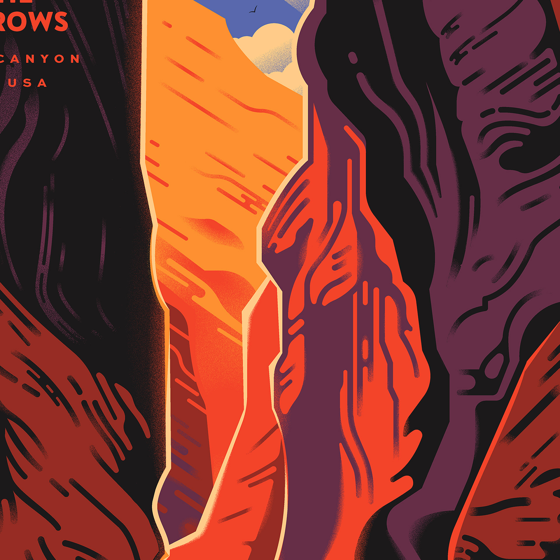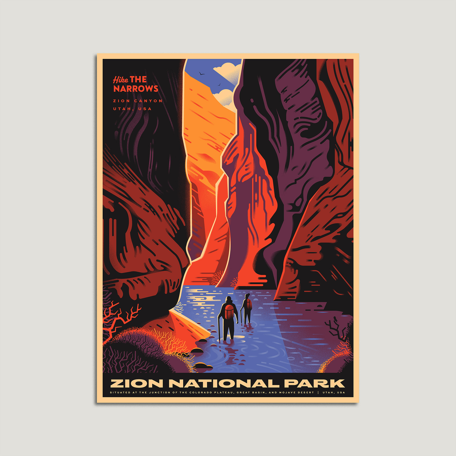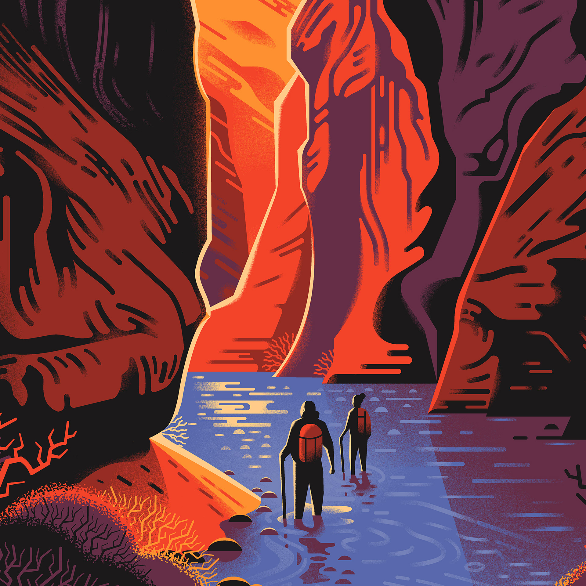 I have done the Narrows only a couple of times, but I've also done other canyons and slots in Utah. When I considered what trails I wanted to feature in these posters, this was my first choice; my kids loved this hike, and my wife has done it multiple times with friends. It holds a special place for our family. I wanted this poster to be unique among other depictions of the Narrows; with bright, stylized colors, I used heavy linework to capture the carved, graceful swooping slabs of sandstone that tower above you as you hike this unmatched trail.